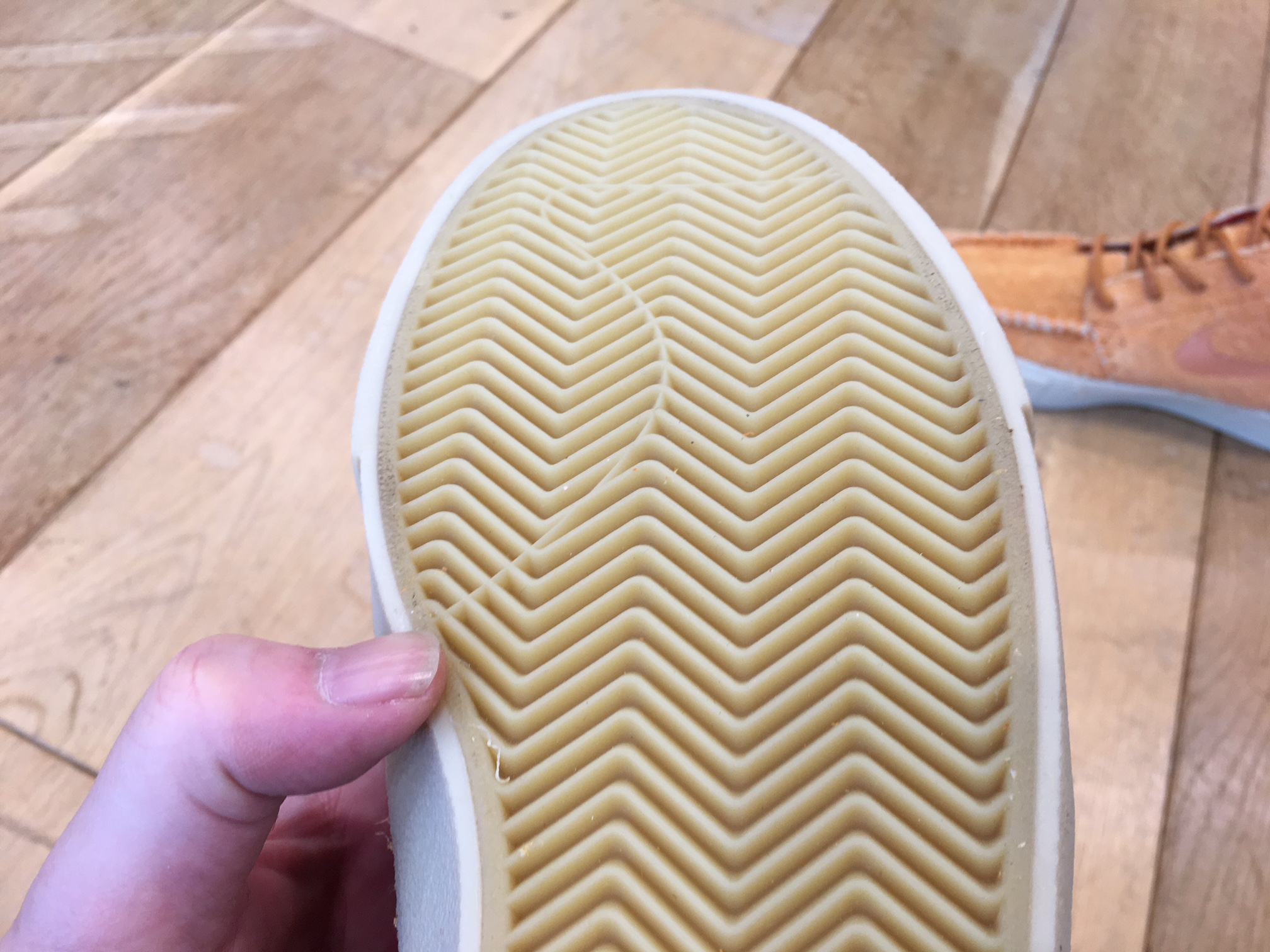 アウトソールはヘリンボーンタイプのトレッドパターンで、スケートボードのデッキや自転車のペダルとも良く噛んで高いグリップ力を発揮してくれます。