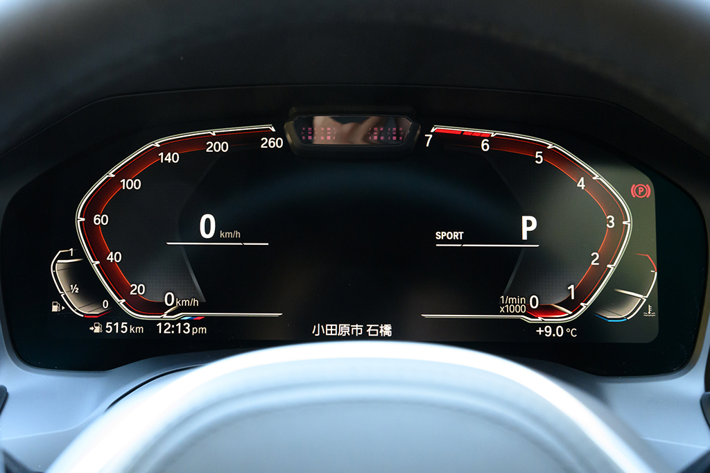 ドライバーの眼前にある計器類は、ライブコクピットと呼ばれる12.3インチのフルデジタルメーターとなり、左側に位置する速度計、右側のエンジン回転計の間に、ナビマップの一部などを表示できるようになりました。このライブコクピットでユニークなのは、メーター間の表示スペースを確保すべく、エンジンの回転計を反時計回りの表示にしたこと。些細なことではありますが、この配置により、コクピット中央のディスプレイでナビ画面を確認する回数が減り、ドライビング時の視線移動が、とても少なくなっています。