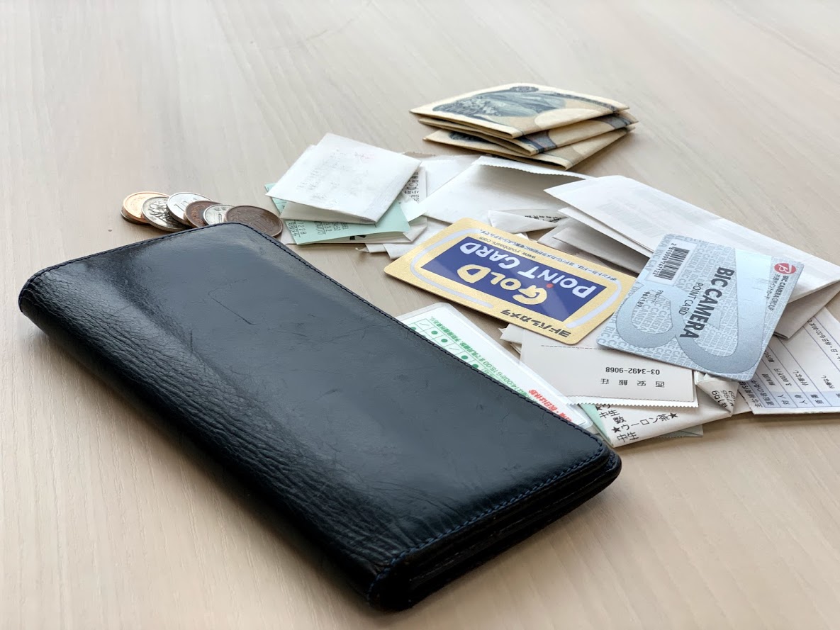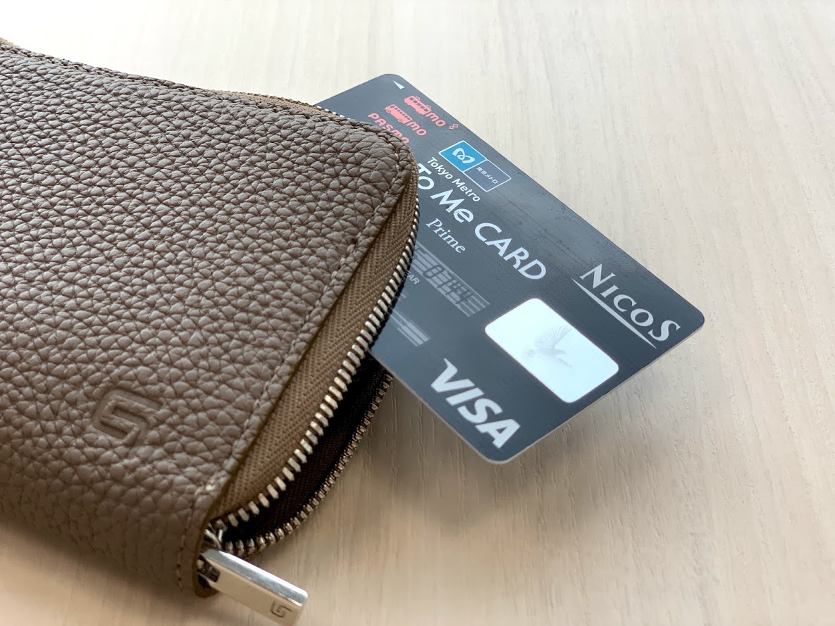 では実際に「キャッシュレス生活」をしてみて、スマートに支払いができたかどうかをチェックしていきます。基本、お札は持たずに、ちょっとした小銭、定期券+PASMO+VISAを合体させたニコスカード、運転免許証、健康保険証だけを入れておきます。