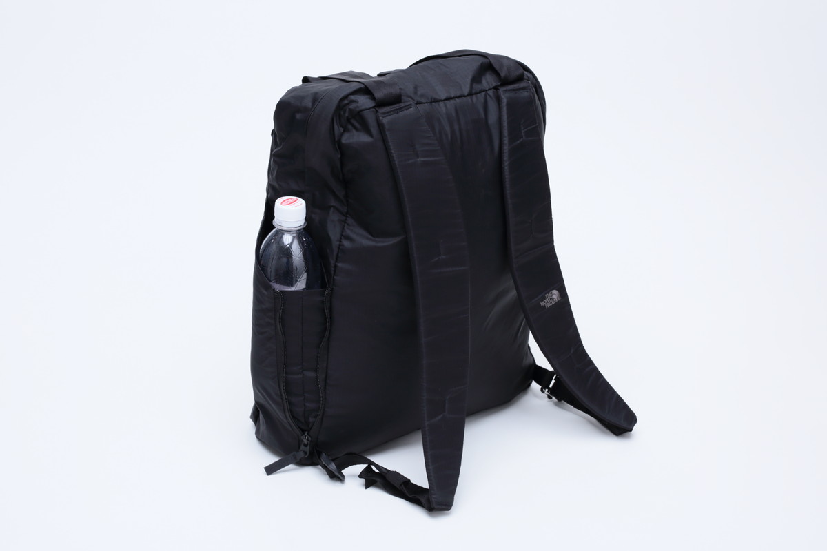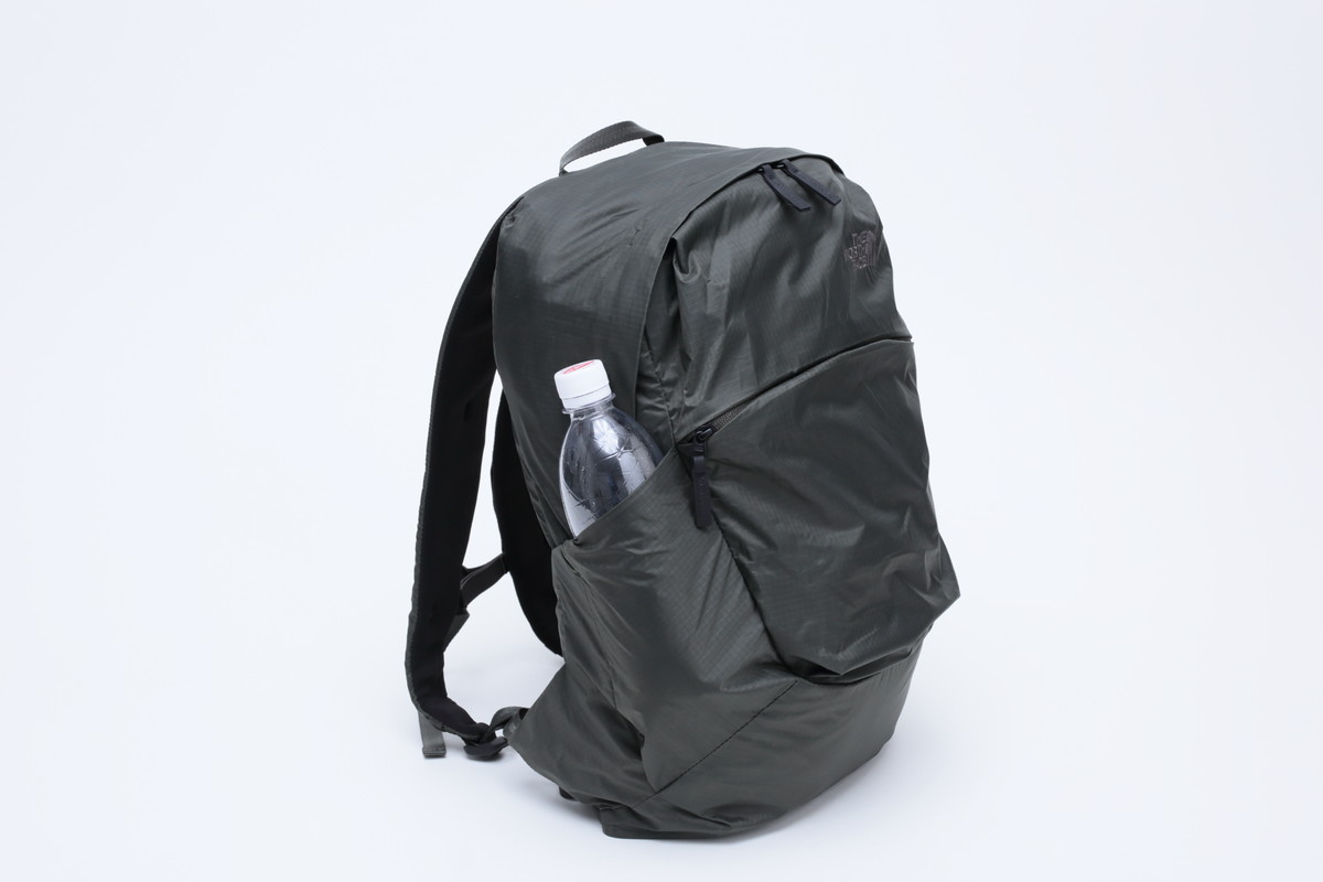 両サイドにもポケットがあり、ペットボトルがすっぽり収まる大容量。ポケットの開口部は伸縮するので、荷物の落下も防げます。こういったディテールへの配慮が、カバンの使いやすさに大きく影響すると思うんですよね。本格的な登山用テクニカルパックを手がけているザ・ノース・フェイスだけに、細部のつくりに信頼感があります。