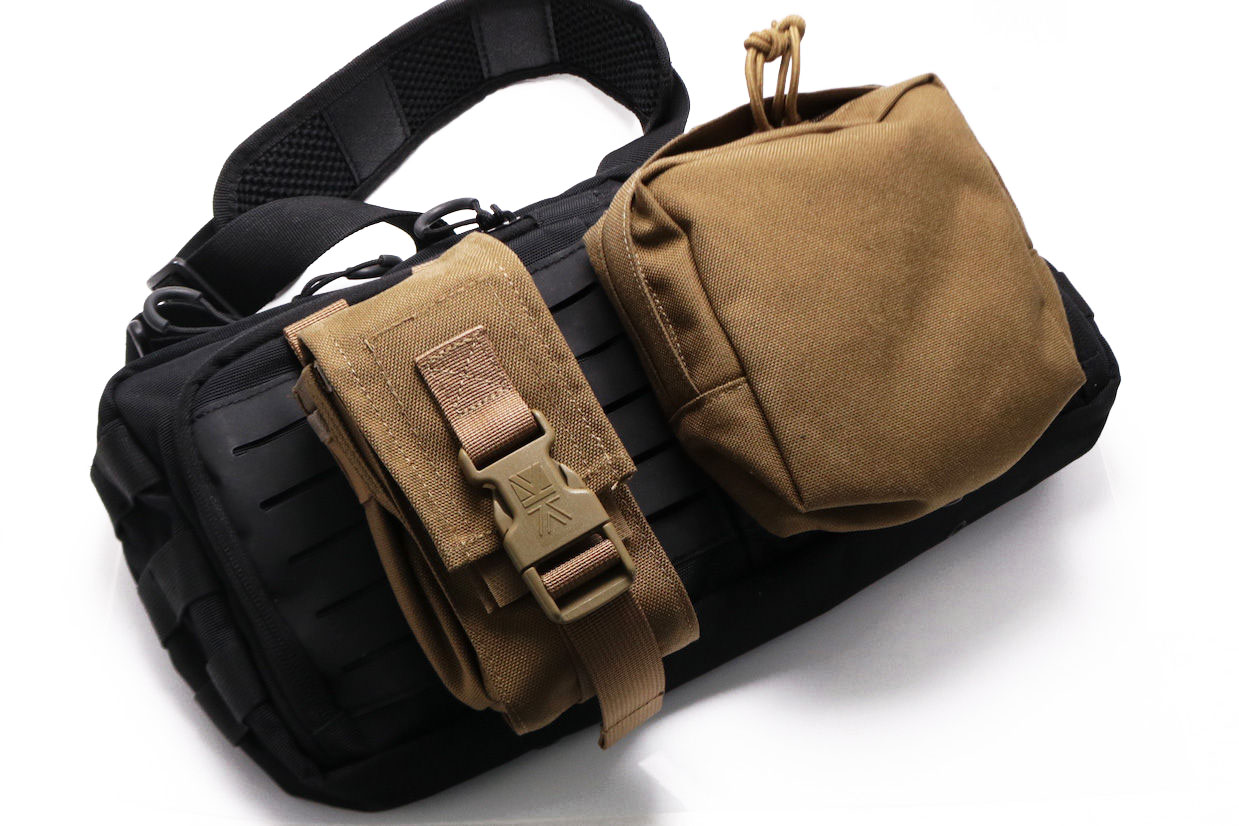 ちょっと面白かったのが、画像左のカリマーSFのスモークグレネードポーチが「専用品かっ!」っていうくらいジャストフィット。MOLLEシステムユーザーにはオススメです。