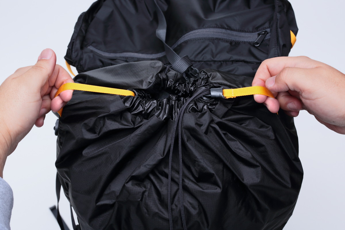 背負い心地の良さはもちろん、使い勝手の良さも抜群。メインコンパートメントへのアクセスもワンタッチで。開口部は、上の写真の黄色いストラップを左右に引くだけで開けられ、グローブをしたままでも簡単に荷物を取り出せます。ドローコードのバックルを緩める“ひと手間”を省いただけに見えますが、こういったディテールを一つ一つ積み重ねることで、快適性を向上させているのです。