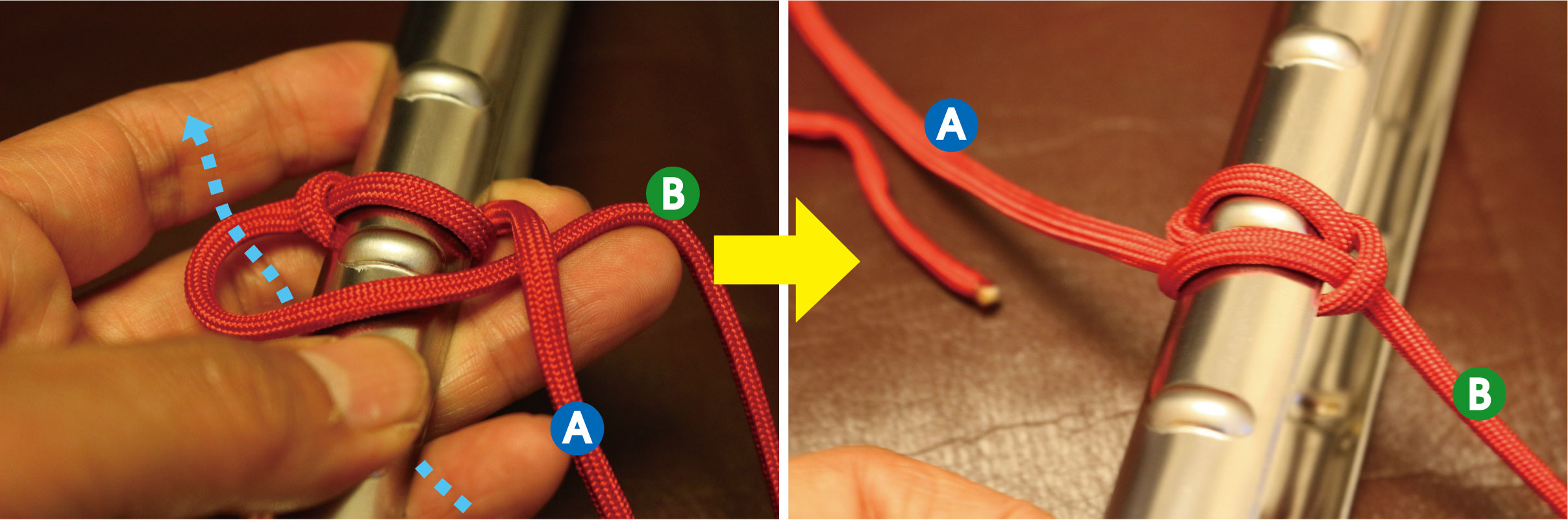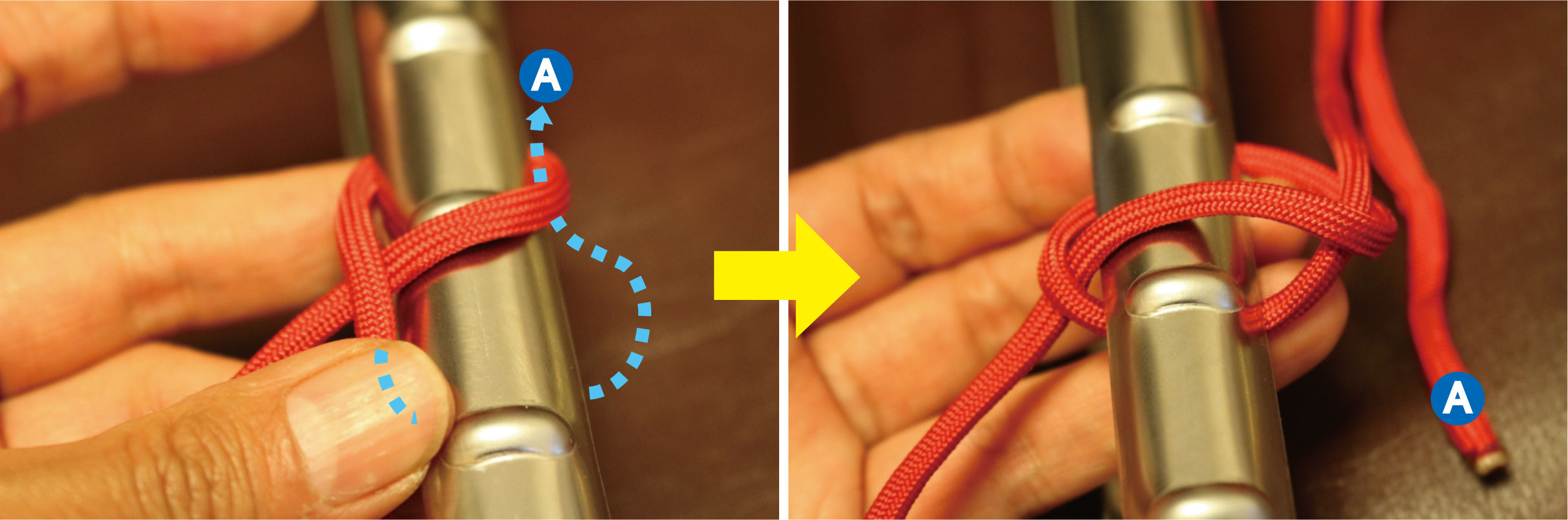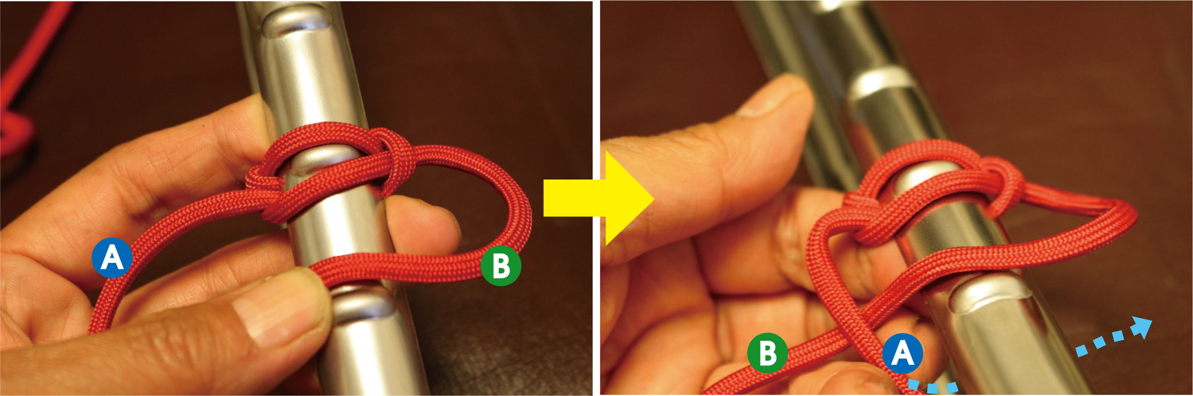 1)ハンドルの左側でロープをクロスさせます。上側になっているAを、ハンドルの下を通して右側に。ロープでできた右側の輪に通して引っ張ります。