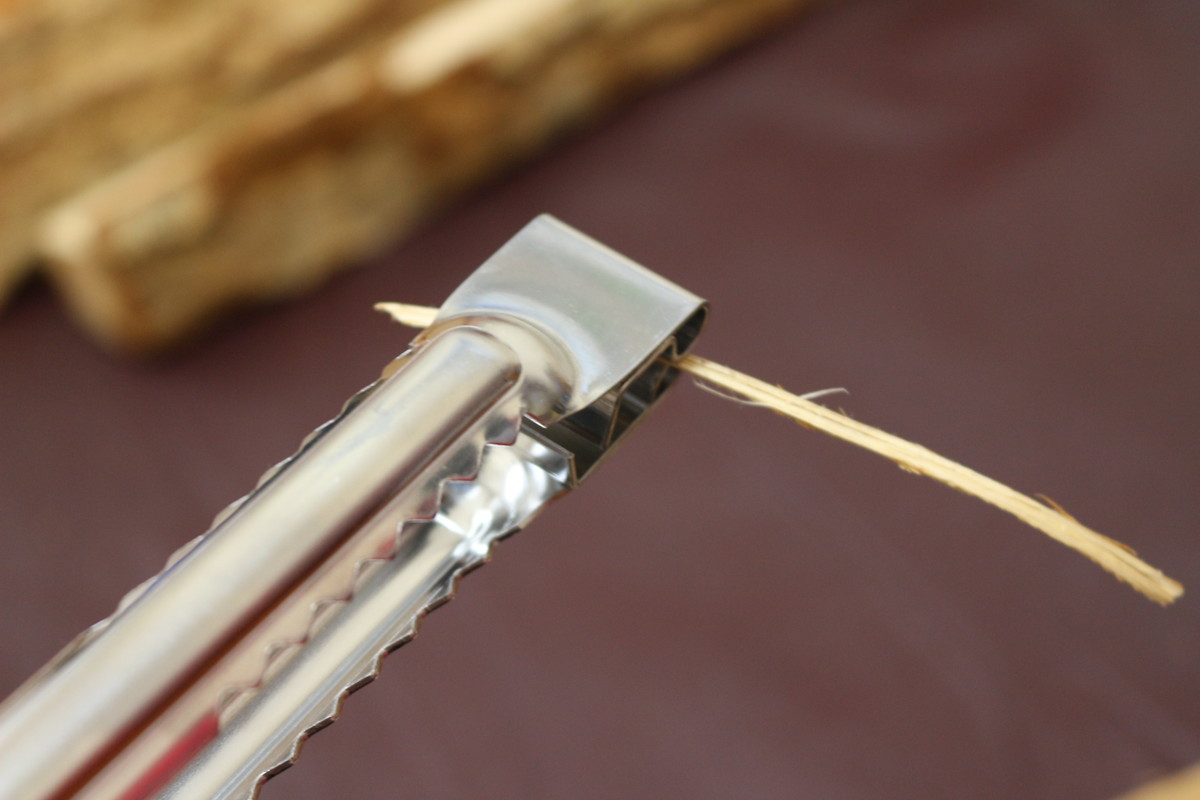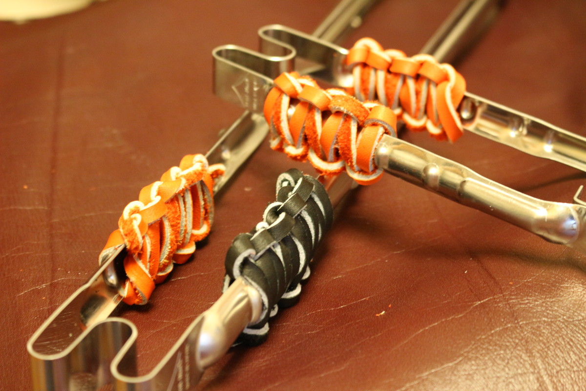 というわけで革紐でハンドルを編んでみました。平らな革紐なので裏側が見えてしまいました。丸い革紐のほうがきれいに編めるでしょう。