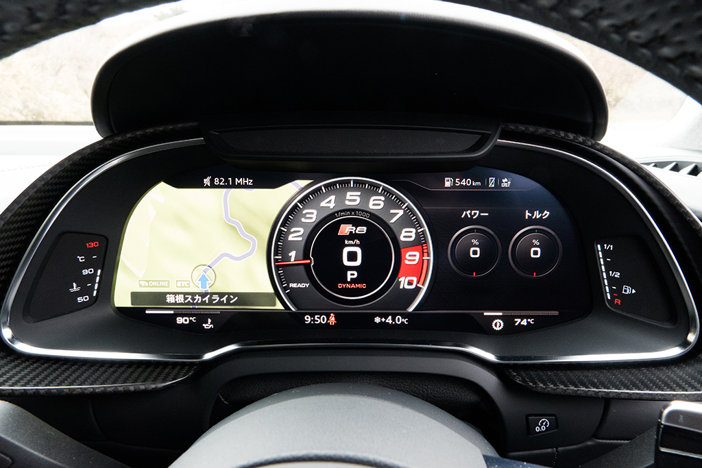 R8に搭載されるのは、5.2リッターのV型10気筒自然吸気エンジンで、イマドキ珍しく、多気筒の自然吸気エンジンにこだわり、その結果、標準仕様は540馬力、今回試乗した「プラス」と呼ばれる高性能モデルでは、610馬力というハイパワーを発生する。