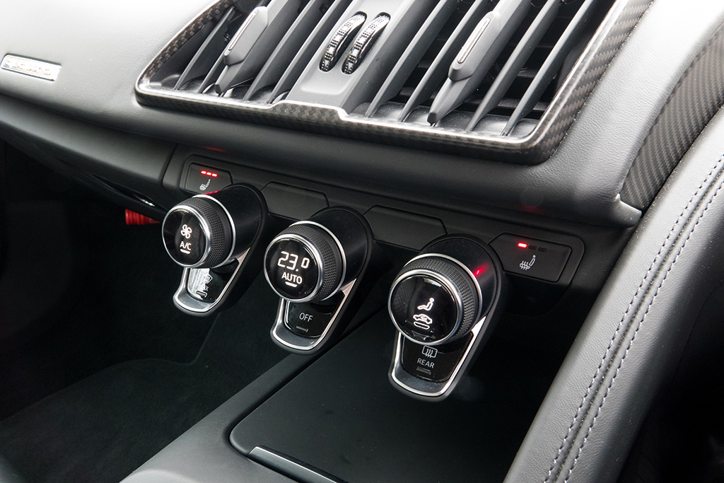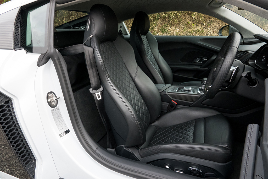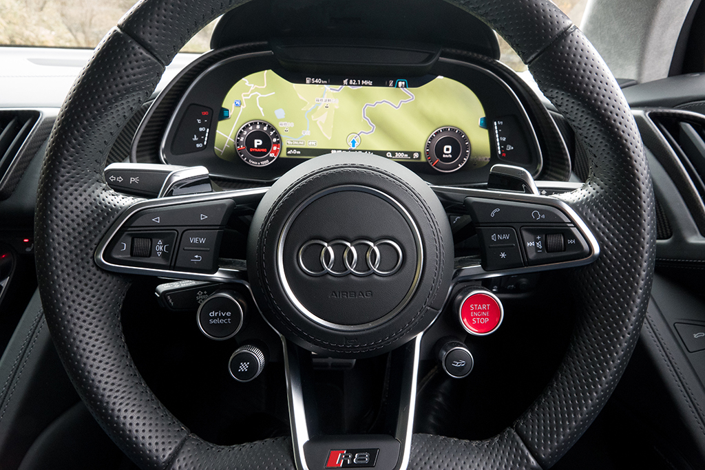 一方、R8がウラカンと明確に異なるのは、日常における使い勝手の良さだ。例えば視界。前方視界はさほど変わらないが、後方視界、特に斜め後方の視界は明確に異なる。斜め後方がよく見えないウラカンとは違って、R8は見やすくて運転しやすく、その上、車両感覚もつかみやすい。