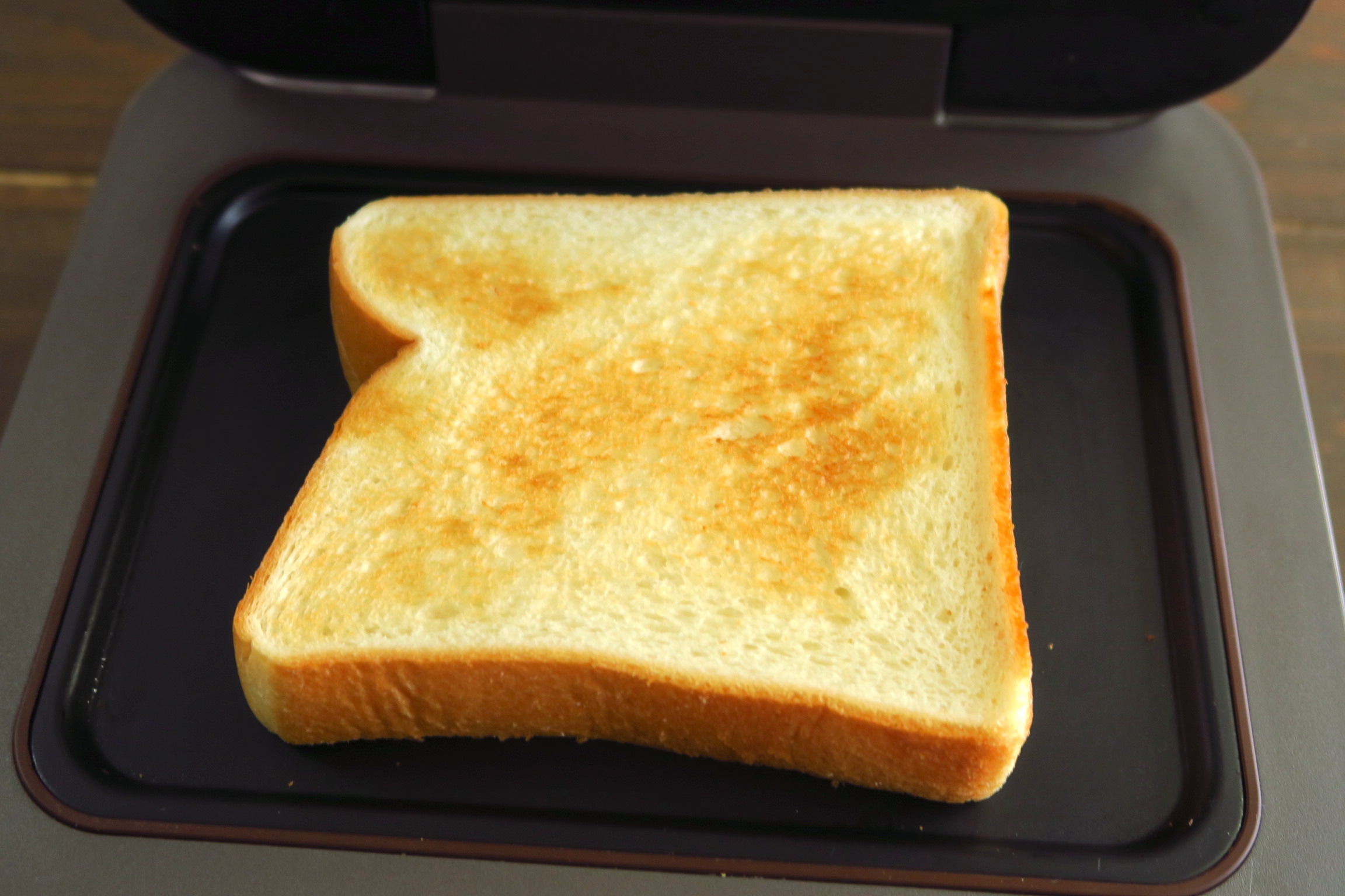 まずはベーシックに「ふつう」の焼き色で5枚切りの食パンを焼いてみたところ、ぱっと見たは普通のトーストと同じ。むしろ、少し焼き色が薄い気すらします。しかし、トーストの香りの広がり方は桁違い!