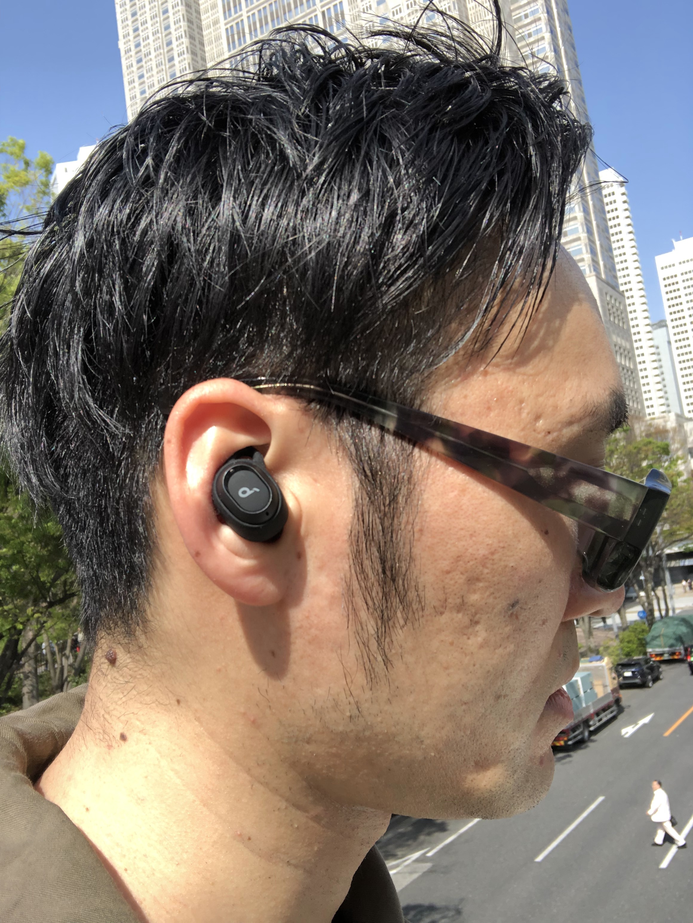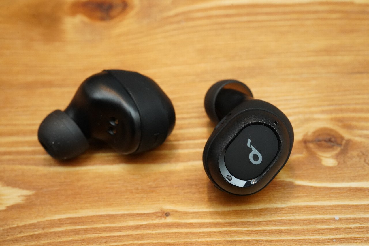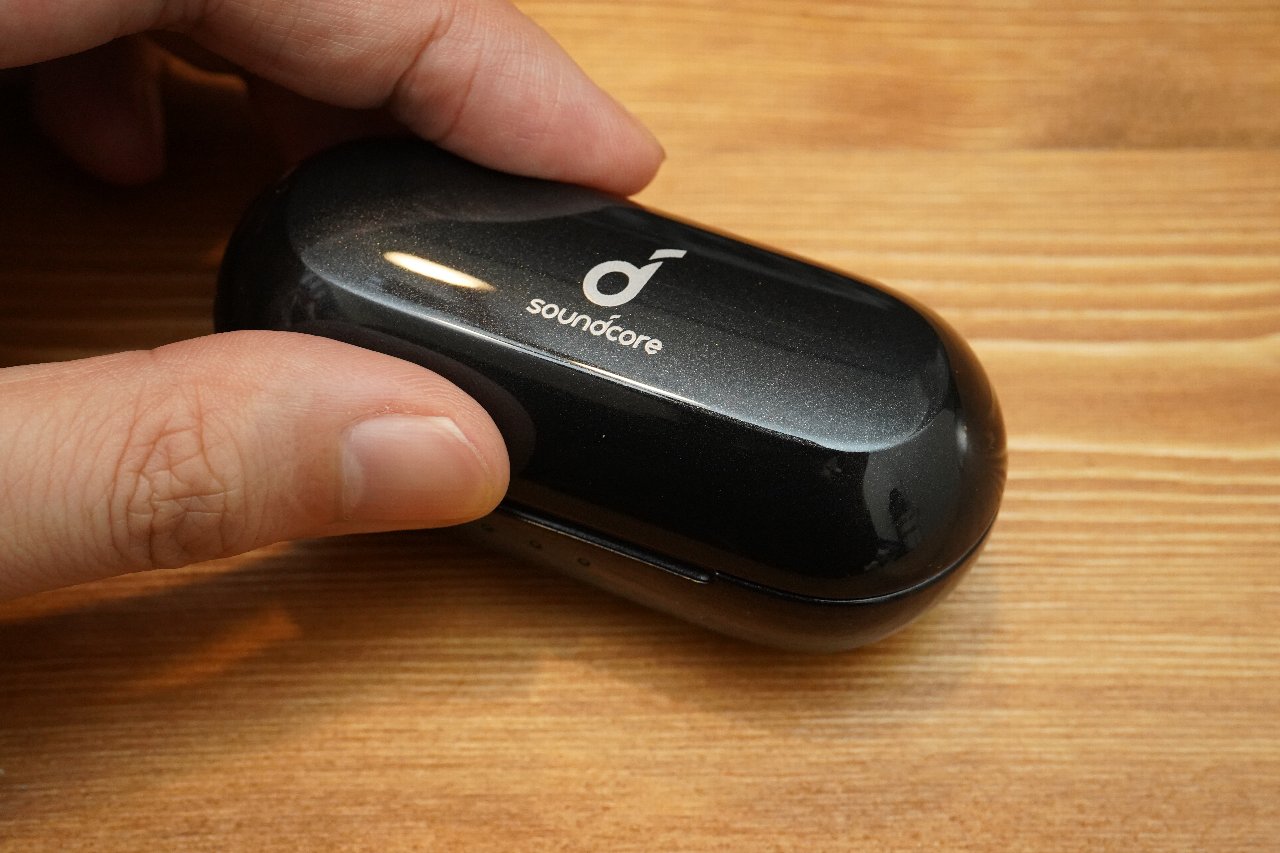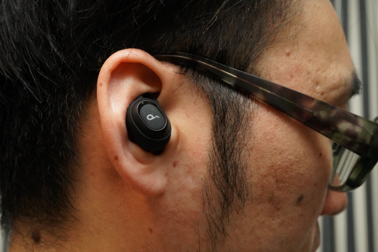 イヤホン自体は、Ankerのイヤホンの中でも小型サイズで、実測値で片側5.3g。音質に関わる部分は思いのほかこだわった仕様になっていて、最近の高音質イヤホンで流行りのグラフェン素材ドライバーを搭載しています。外からは見えませんけどね。左右ともイヤホンの外側全体が押し込み式のボタンを兼ねています。