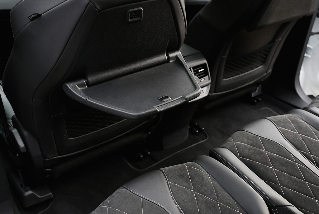 泥や砂とはあまり縁がないイメージはドアを開けても同様で、試乗車にはオプションの豪華内装“ファーストクラスパッケージ”(30万円)が装着されていたので、なおさら。シートは“テップレザー”とアルカンタラのコンビネーションに仕立てられ、凝ったステッチが施されます。フロントシートヒーターや、多彩な方法で上体をもみほぐしてくれる“マルチアクティブランバーサポート”も装備。ニッポンの豪華ミニバンに負けない“おもてなし”が待っています。