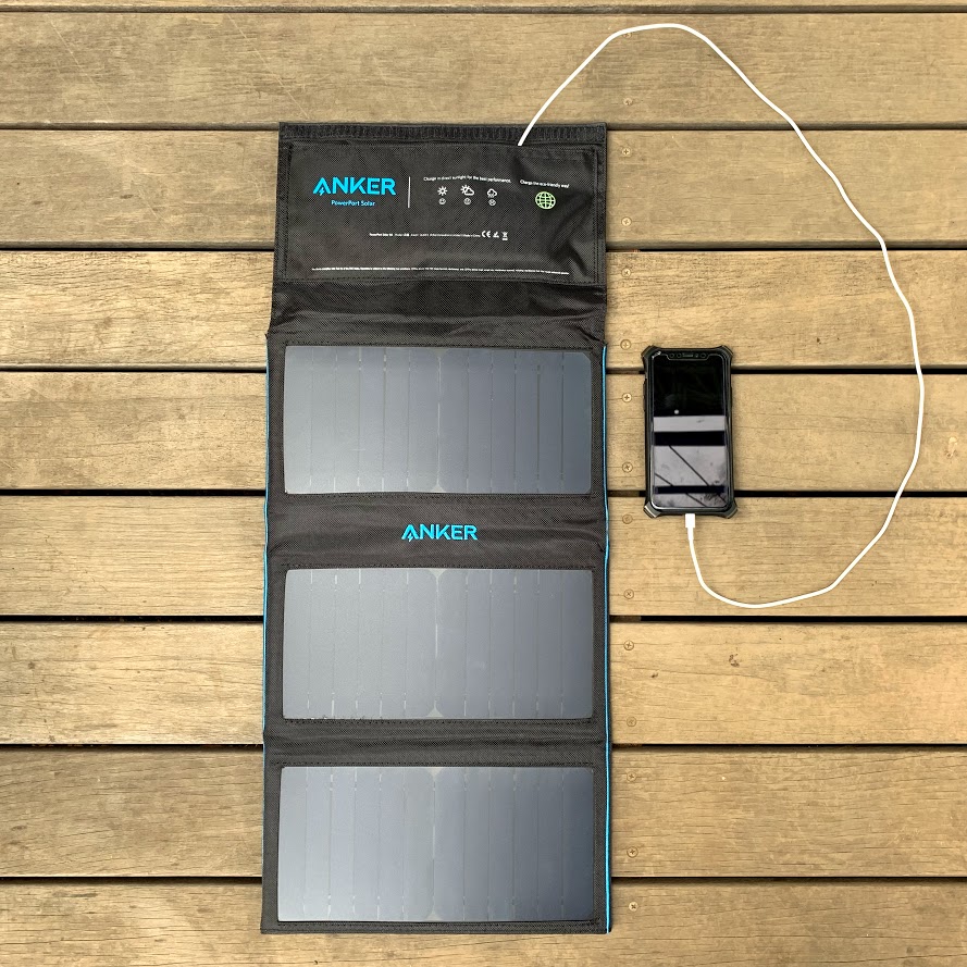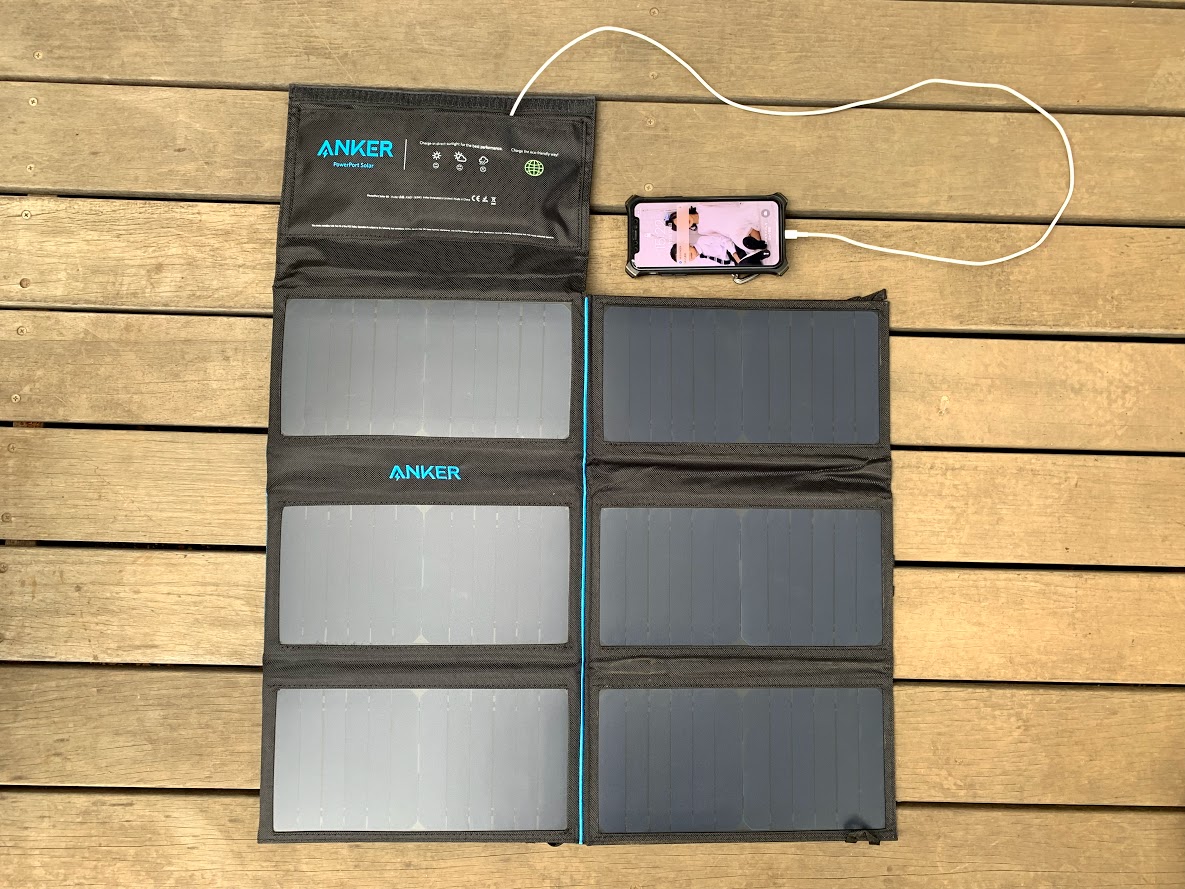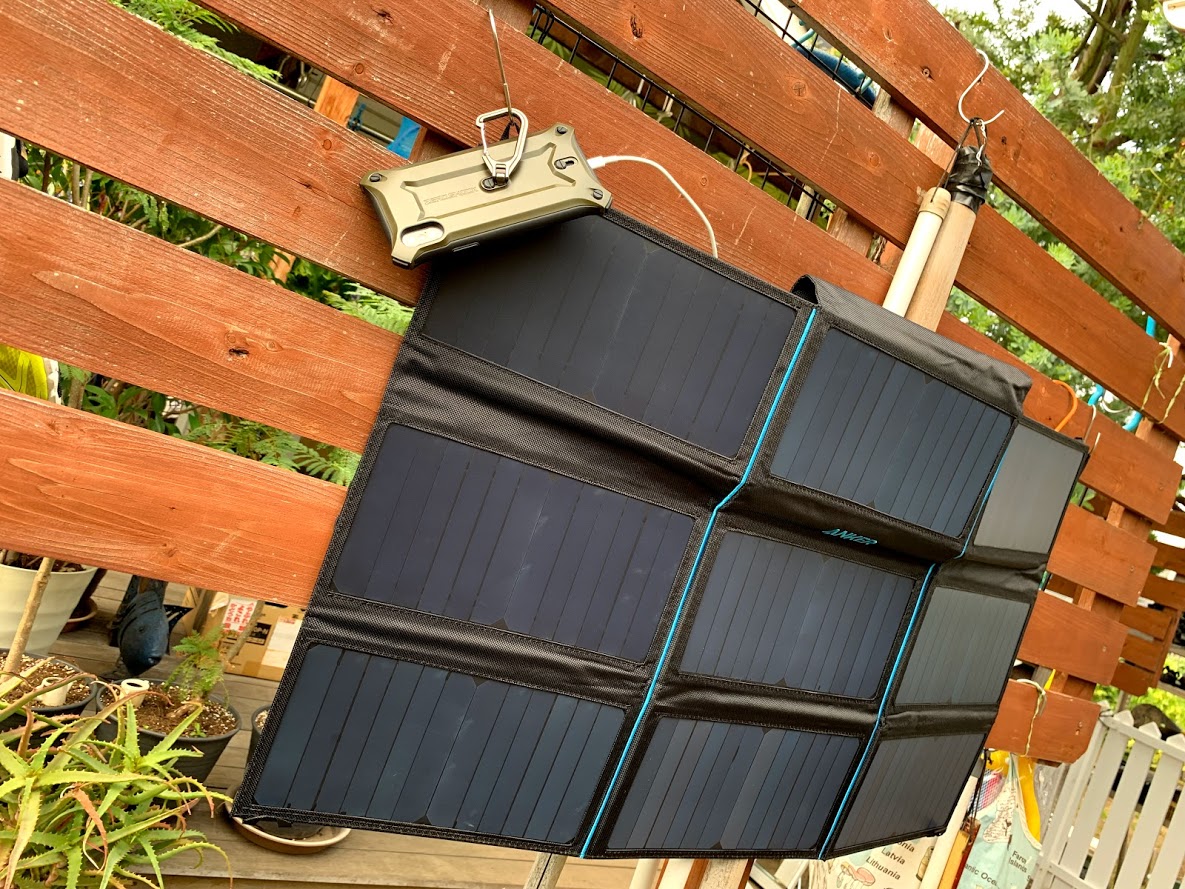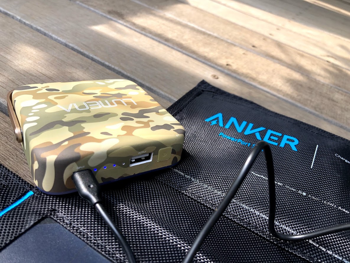 持っていると安心感が違うソーラーチャージャーですが、当然ながら蓄電はできません。リアルタイムで充電するのみ。使ううちに「なんだか電力がもったいないな」と思い始めて気がついたのは、モバイルバッテリーに蓄電(充電)すればいいんじゃん!ということ。