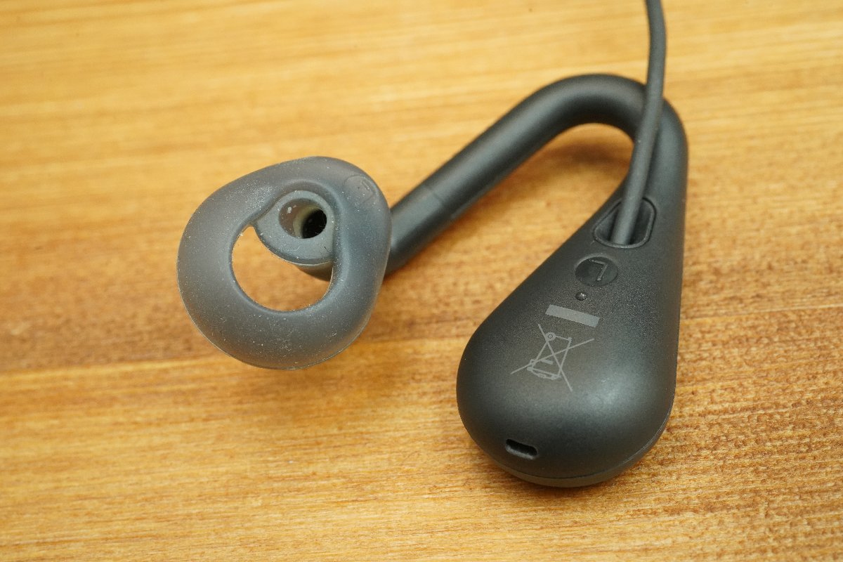 やはり特徴は“オープンイヤースタイル”。イヤホン部分はU字型のような外見で、ユニットを耳の後ろに固定しつつ、伸びた音導管で鼓膜に向けて音を放出する構造です。外側のドライバーユニットは13.6mmの大口径で、低音の量感もアップさせた作りになっています。