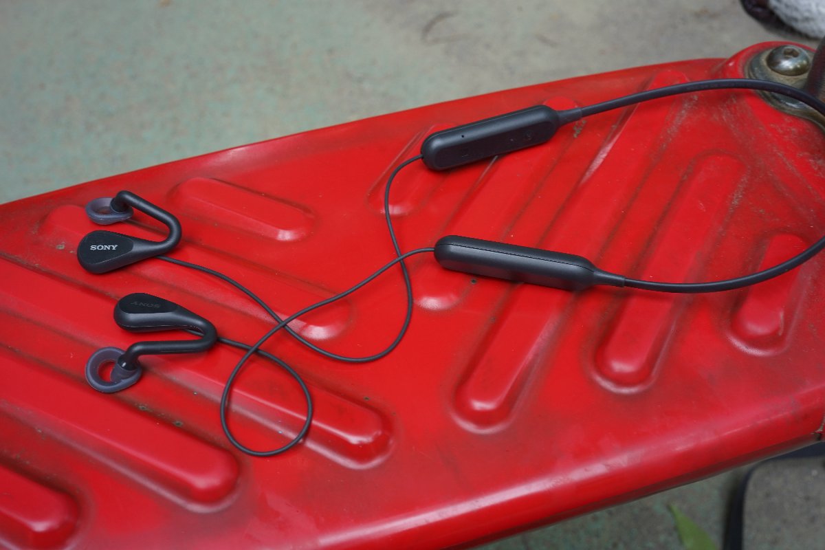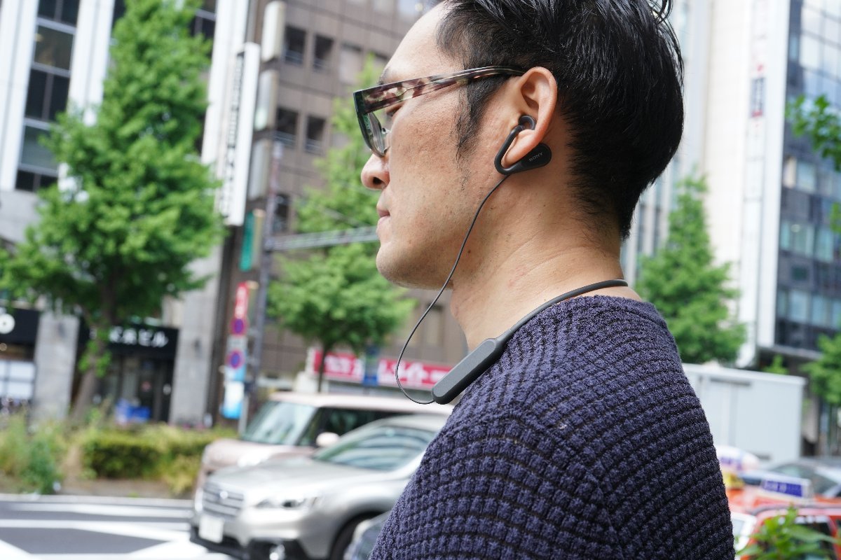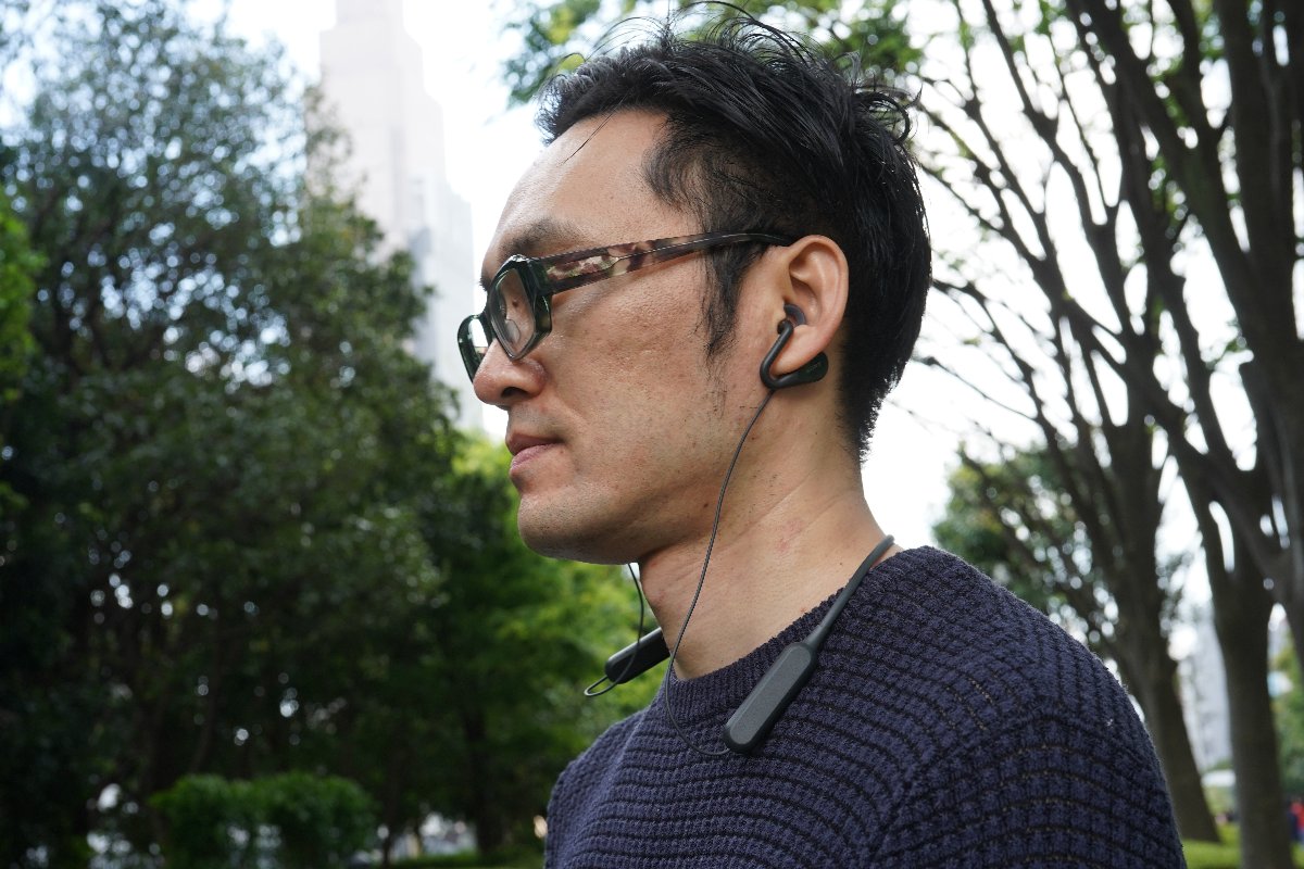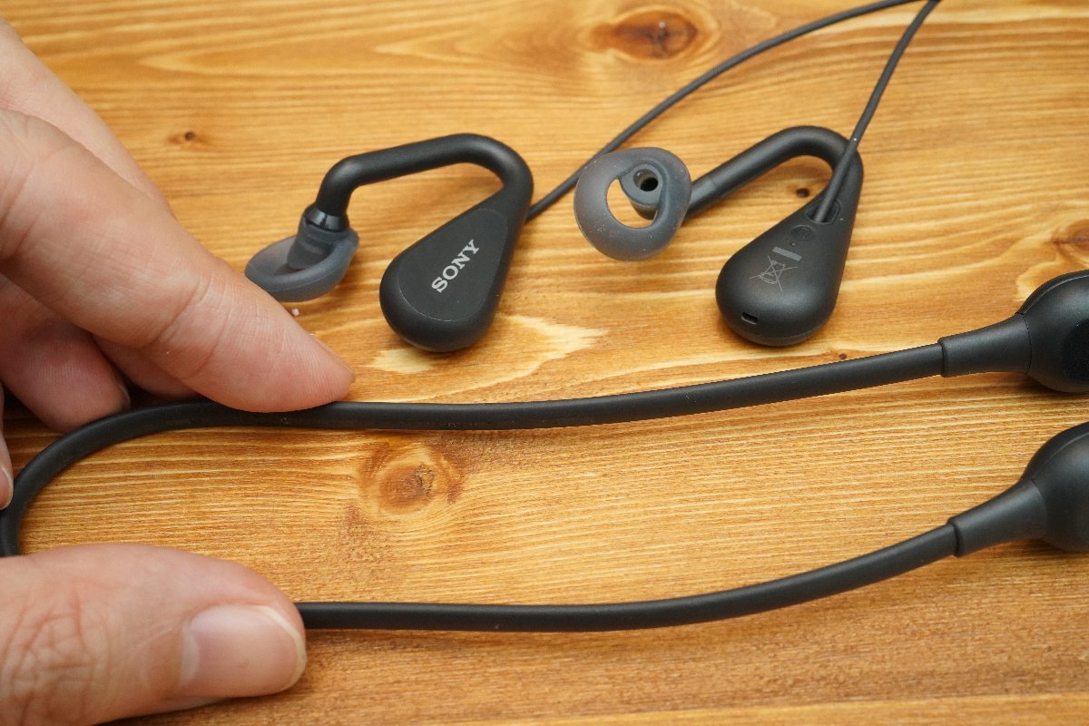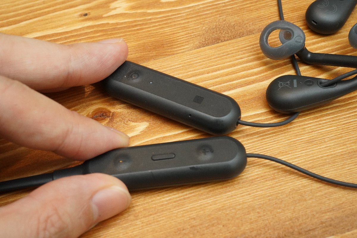 装着時には首の後ろにネックバンドを回すスタイル。バンドは柔らかなシリコンで取り回しがしやすく、重さは25.5gと装着時に負担を感じることはほとんどありません。バンドの左右両側先端にリモコンボタンが付いているので、手を伸ばしてボタン操作もできます。