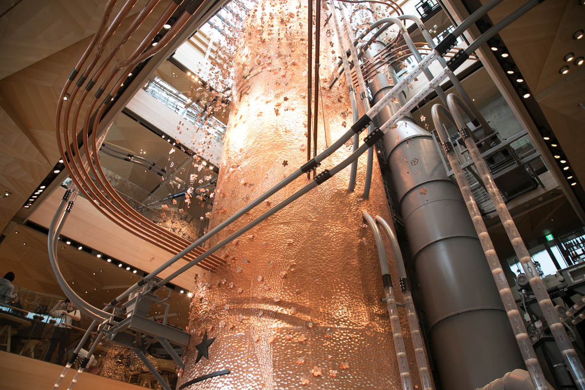▲フロア中央には、巨大な銅製のキャスク(貯蔵樽)が建物を貫くようにそびえ立つ。槌目仕上げの銅板を施した美しい造形は、まさにこの店のランドマークだ