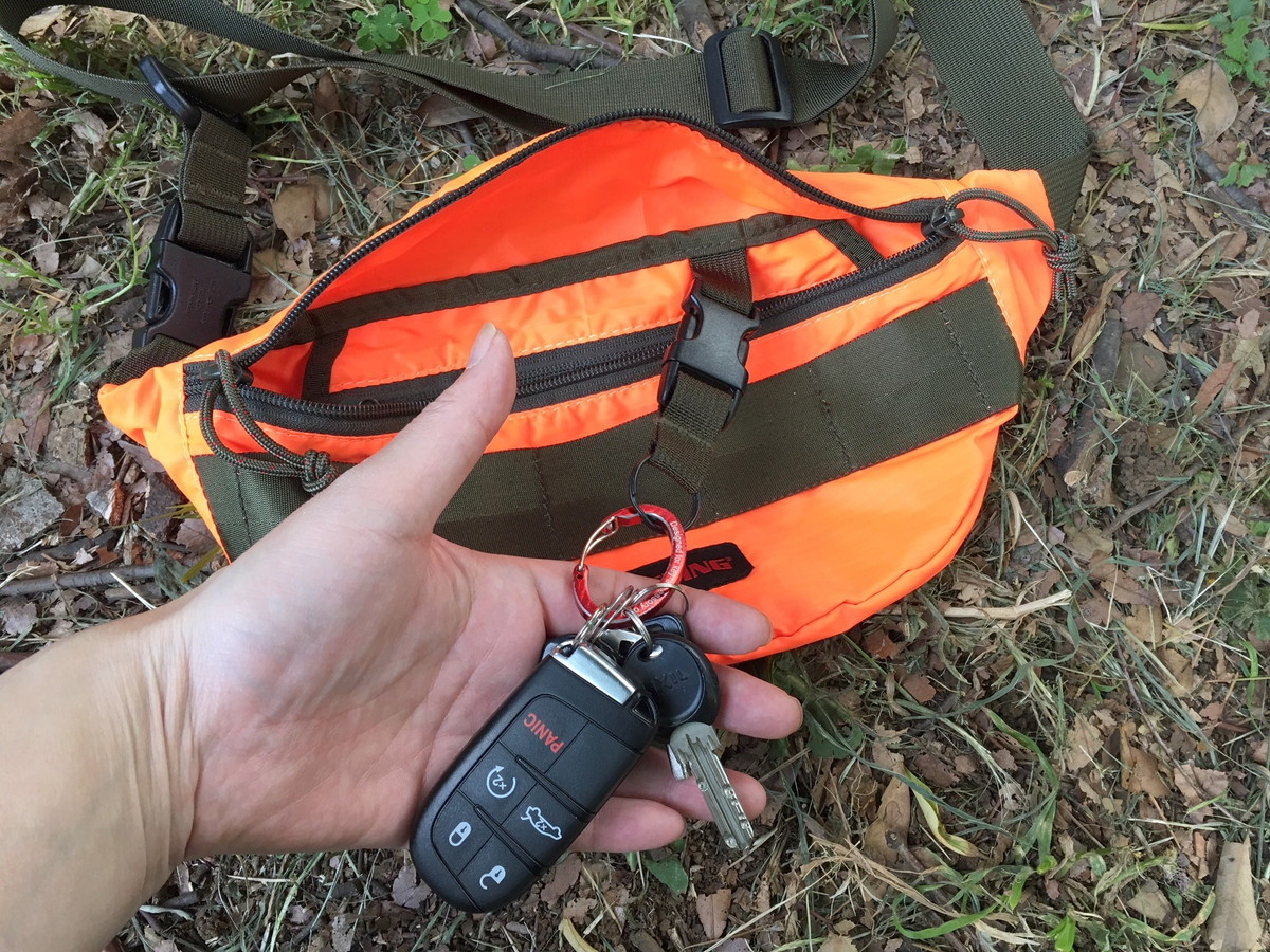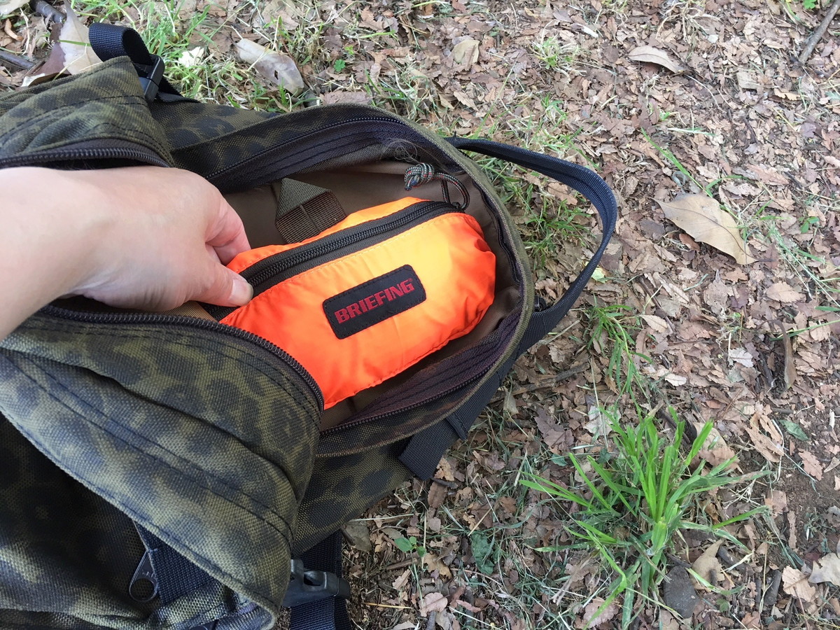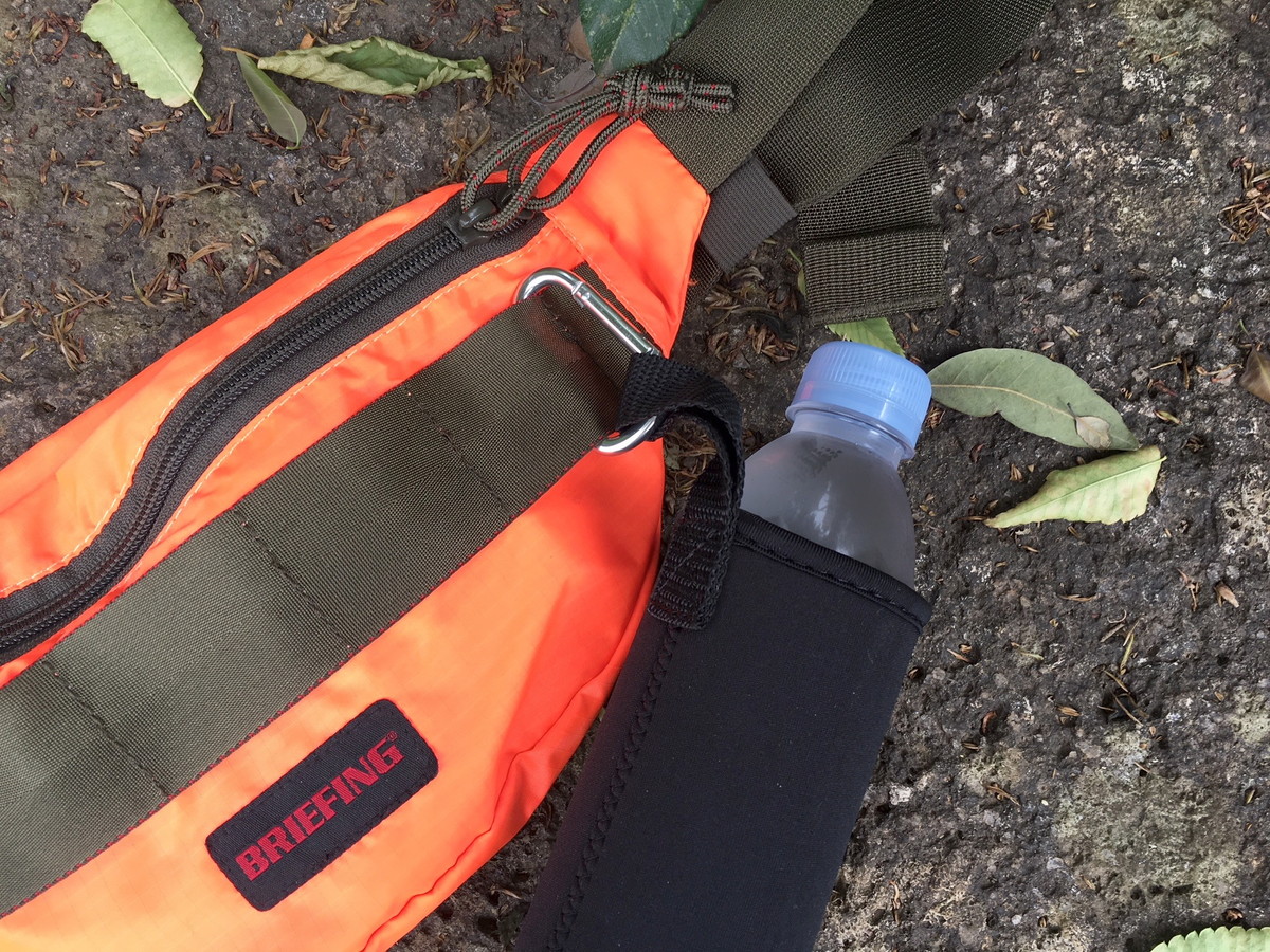 これからの季節だと水分補給のためのボトルも持ち歩きたいかな~と。そこでワタクシの場合はフロントのウェビングテープにカラビナでボトルホルダーを装着。このミリタリーデザインならではの拡張性の高さがイイですね~。