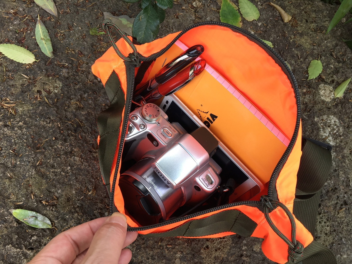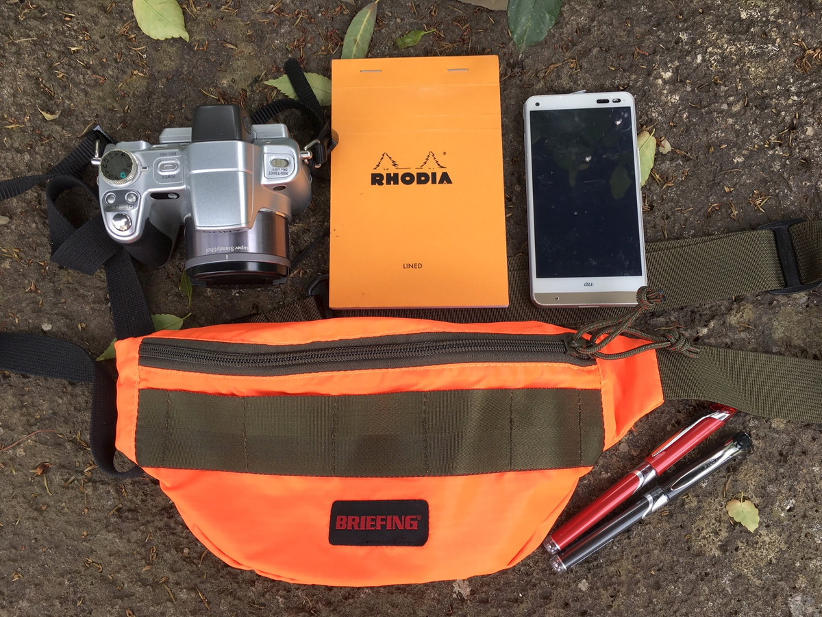 ワタクシがオフの時に普段持ち歩く荷物はザッとこんな感じ。スマホと手帖、ペンにデジカメ。サコッシュでブラブラする時など、デジカメはいつもなら首から下げているのですが、これがちょっと不便で…。