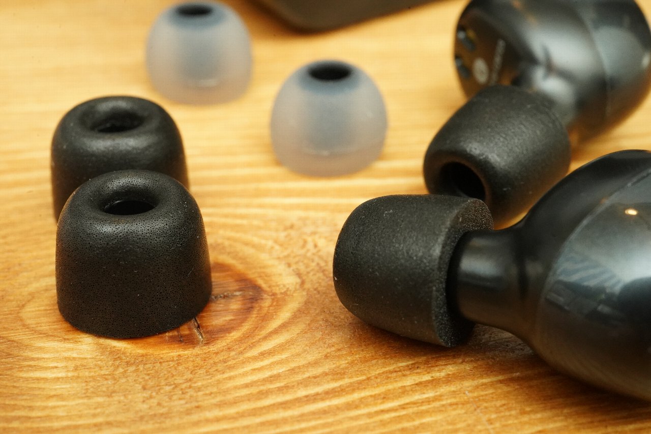 また、イヤホンとしてこだわりを感じるのが、付属イヤーピースが通常のシリコンタイプの他に低反発のフォームタイプも同梱していること。フォームタイプは潰して耳に装着するので遮音性が高く装着感も上がります。イヤーピースは音質にも影響があるので、最後の音質パートで改めて違いをチェックします。