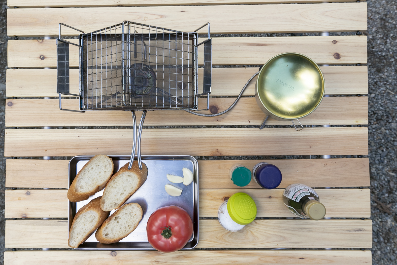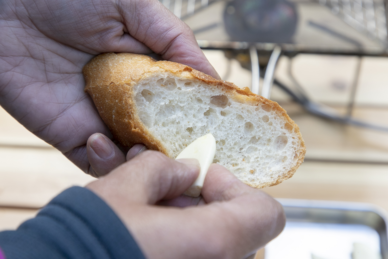 パンに、ニンニクをこすりつけて香りを移します。どんなパンを選んでもいいんですが、やわらかいパンはポロポロと粉になりやすいのでバケットなどハード系のパンのほうがしっかり香りを移せます。このあたりはお好みで。