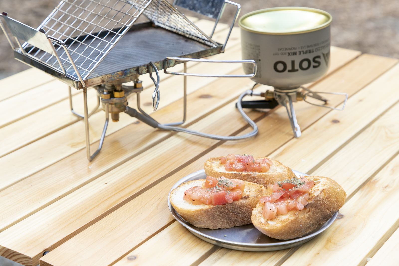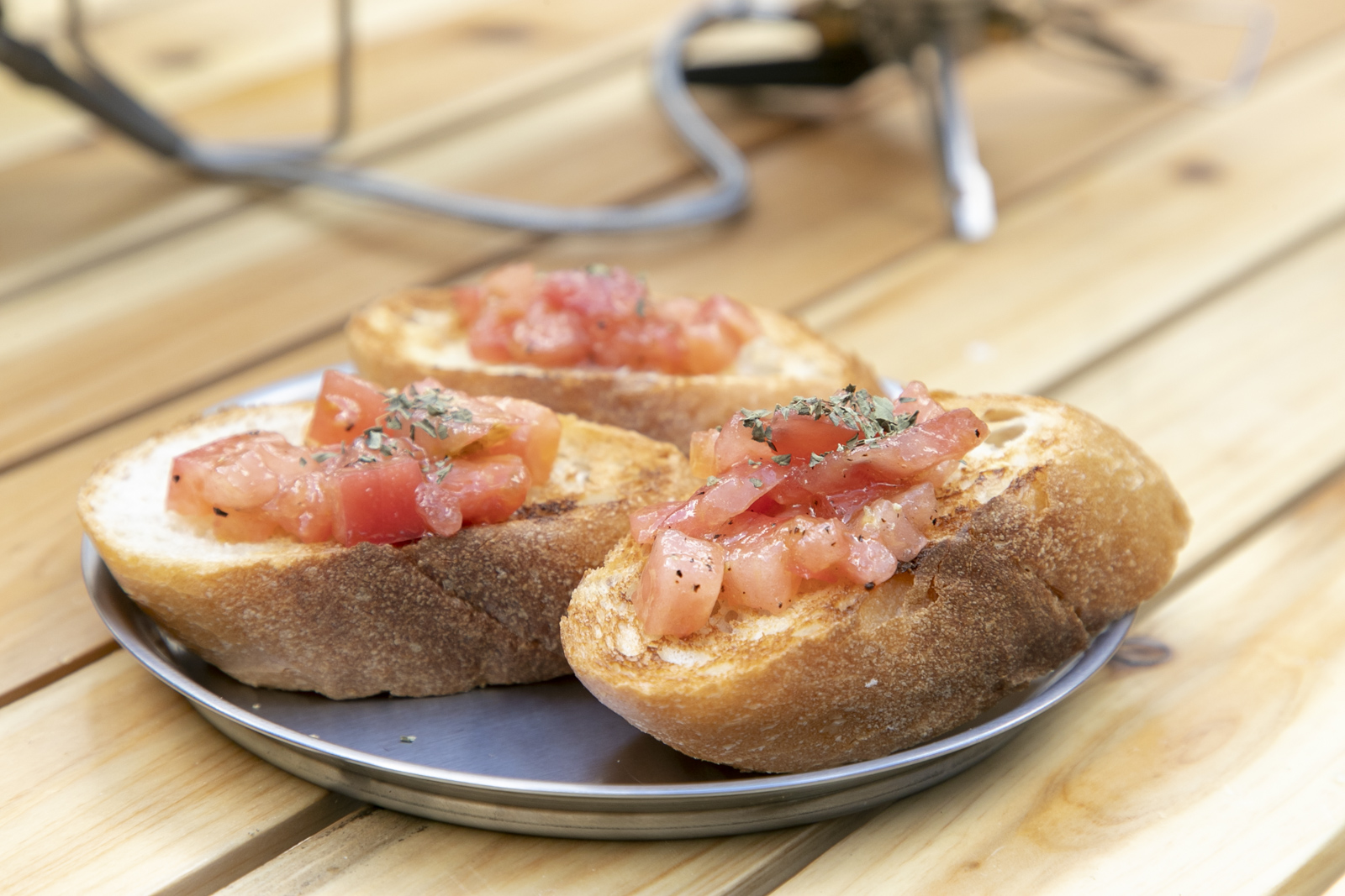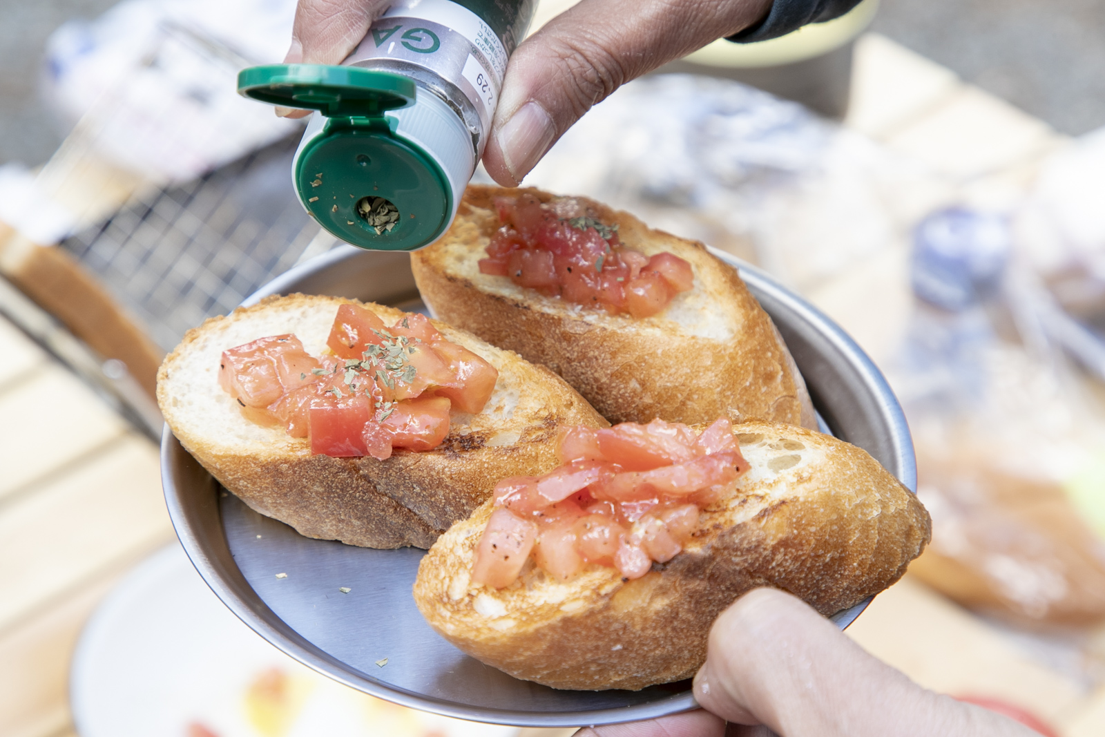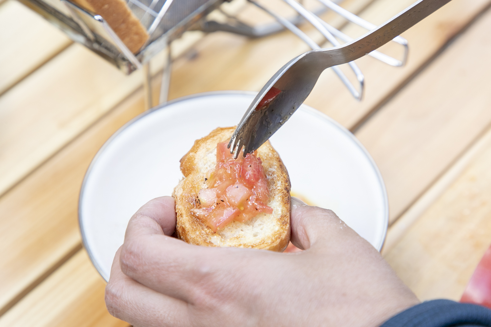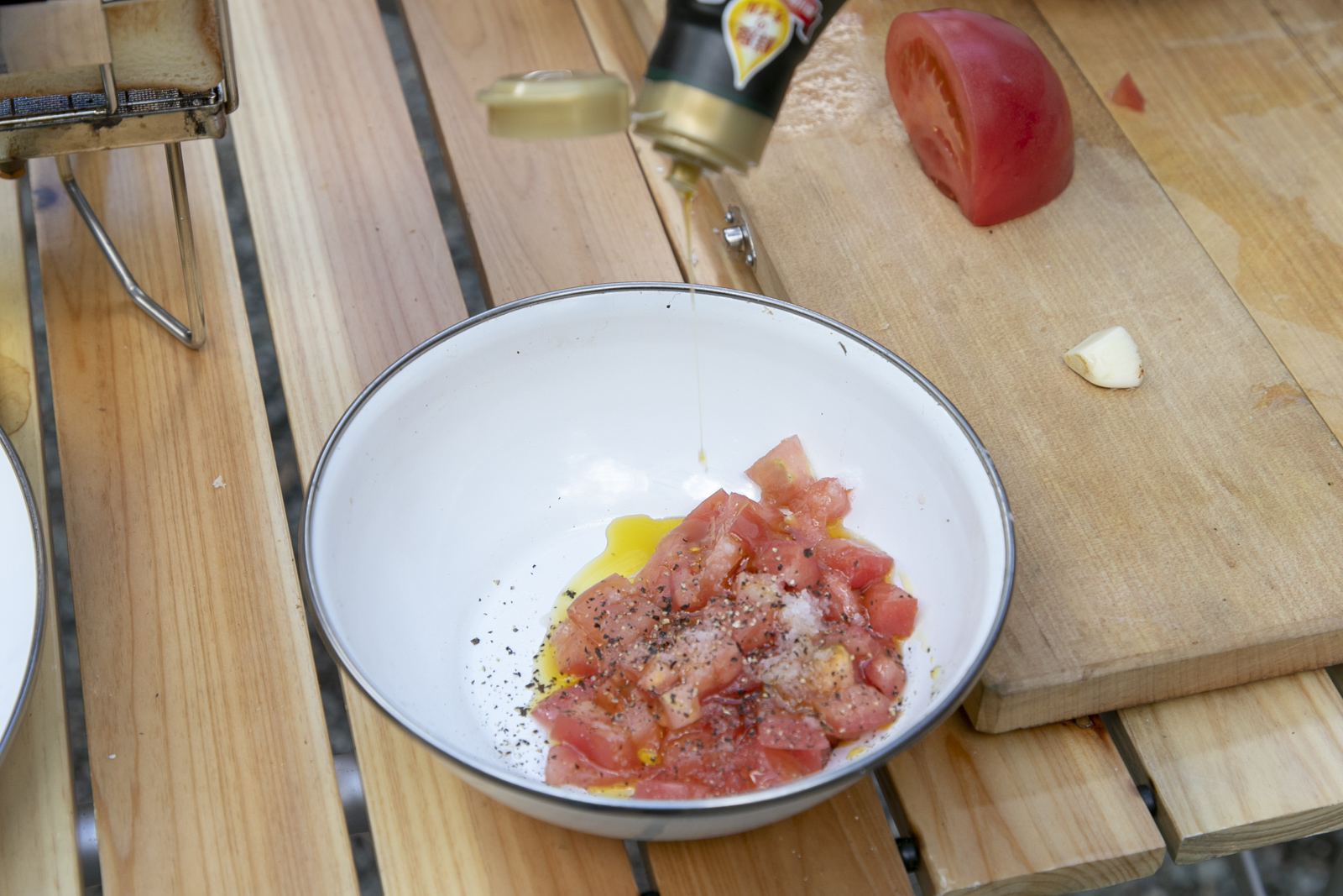 角切りにしたトマトとオリーブオイル、塩、コショウを混ぜ合わせておきます。ほかに、角切りのタマネギやパプリカを加えてもおいしいですよ。