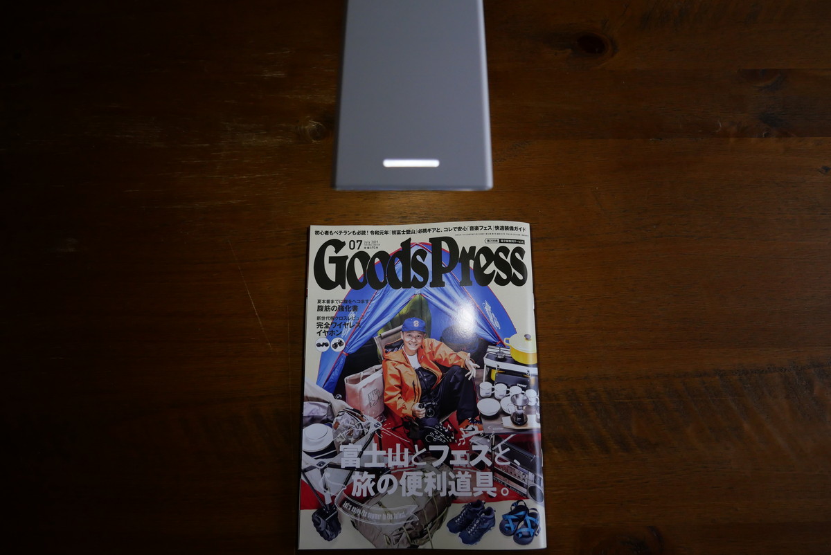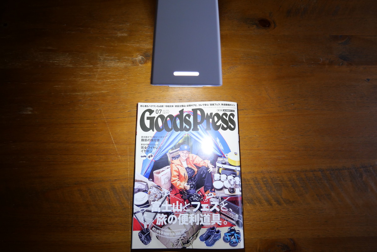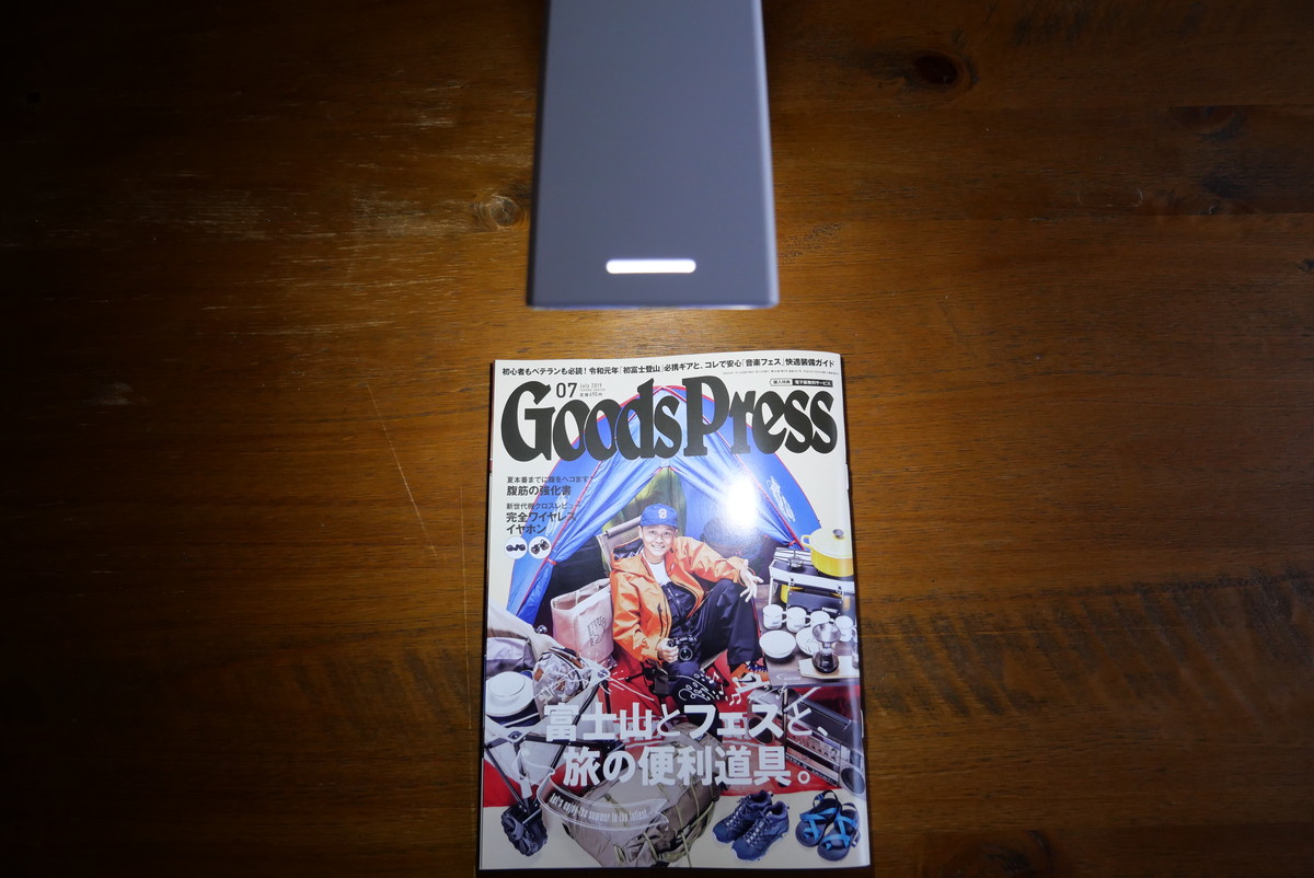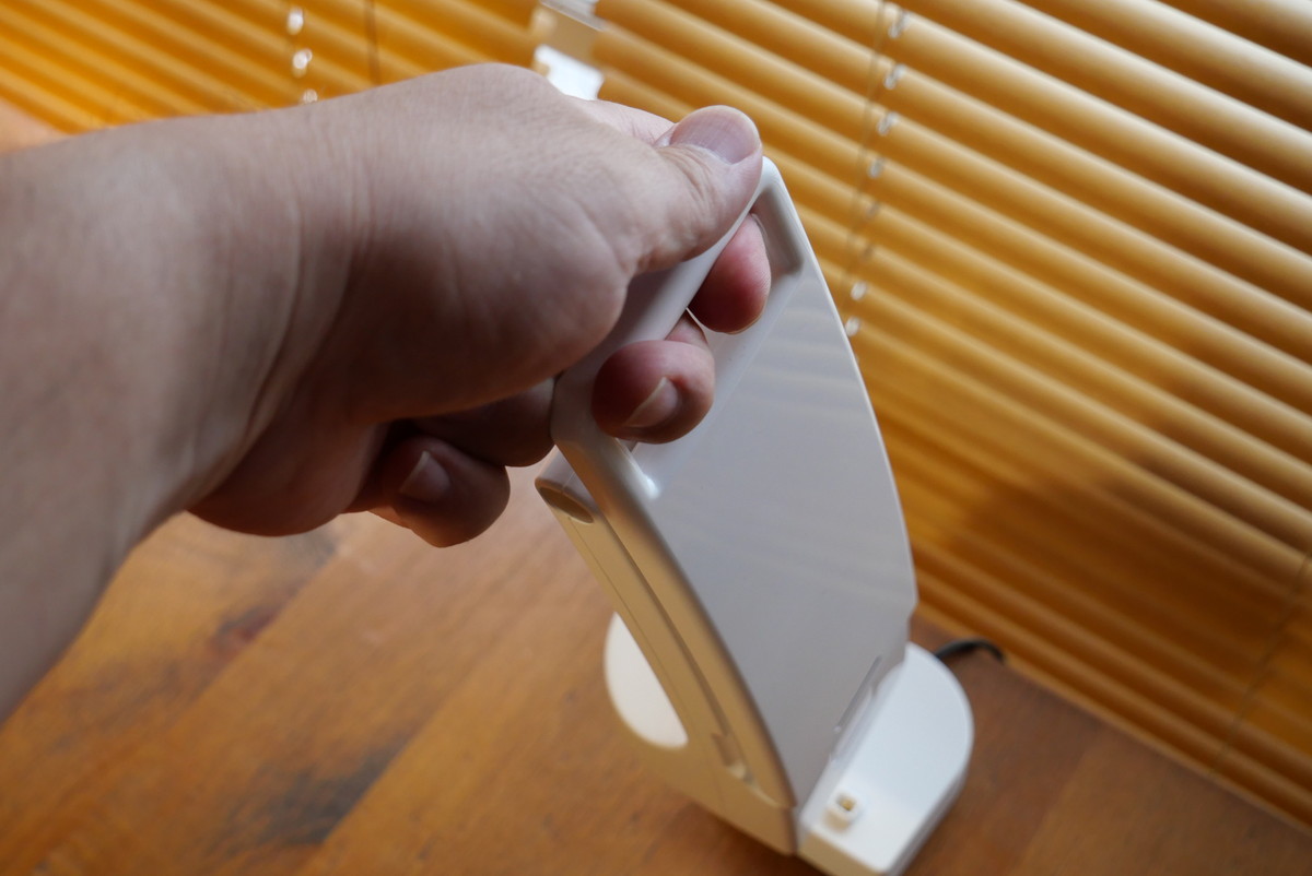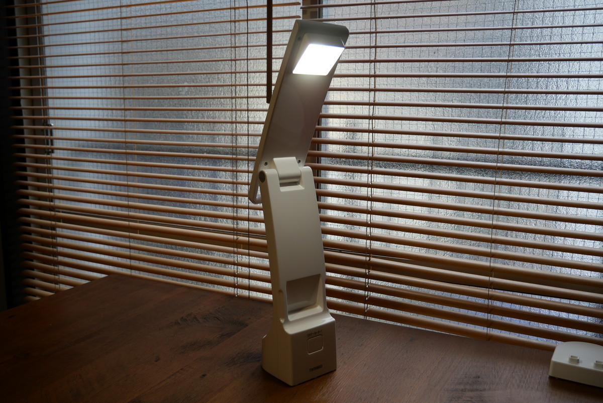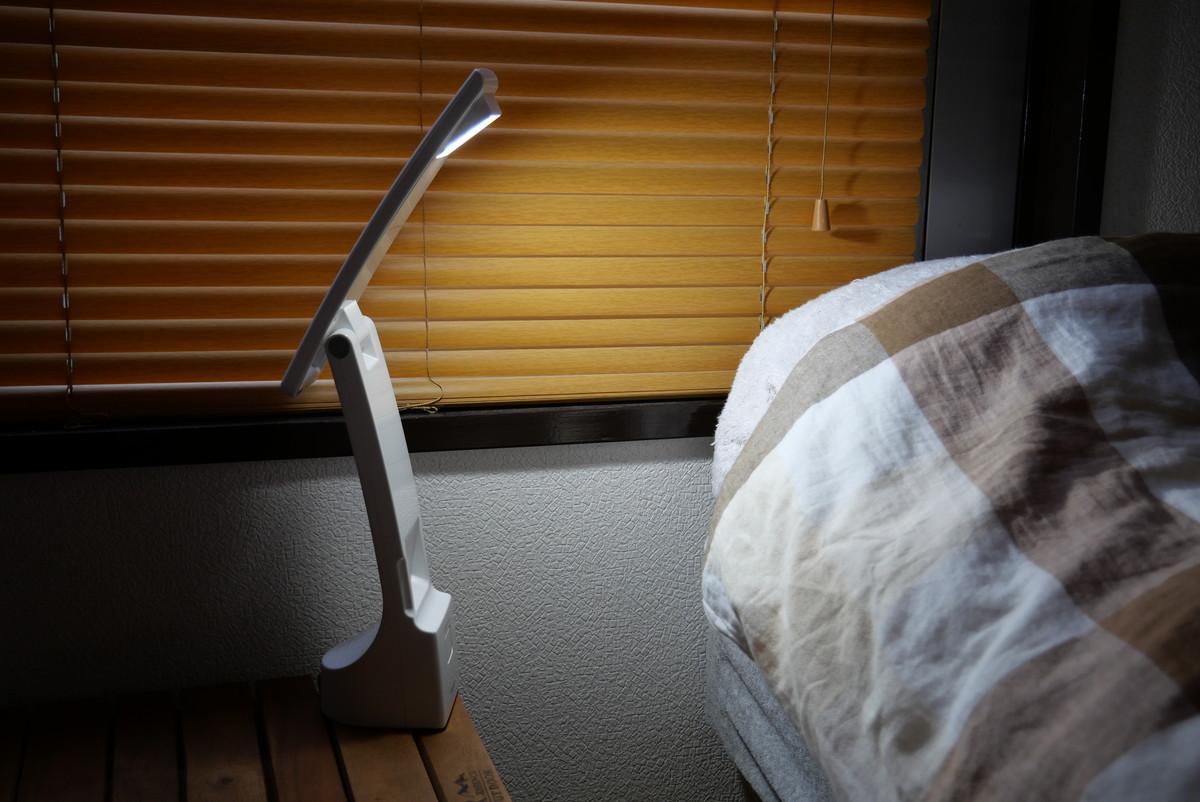 最初は、もうちょっとスッキリしたデザインだといいなぁと思っていたのですが、下部が大きくないと安定して立たない。でも下が大きく、さらにプラスチック製の本体は軽いため、ライト部分を水平に開いた時も、倒れることなくしっかり立ってくれました。