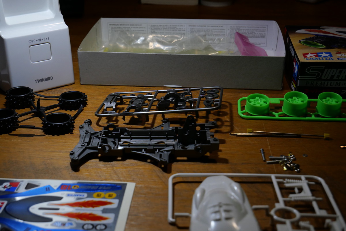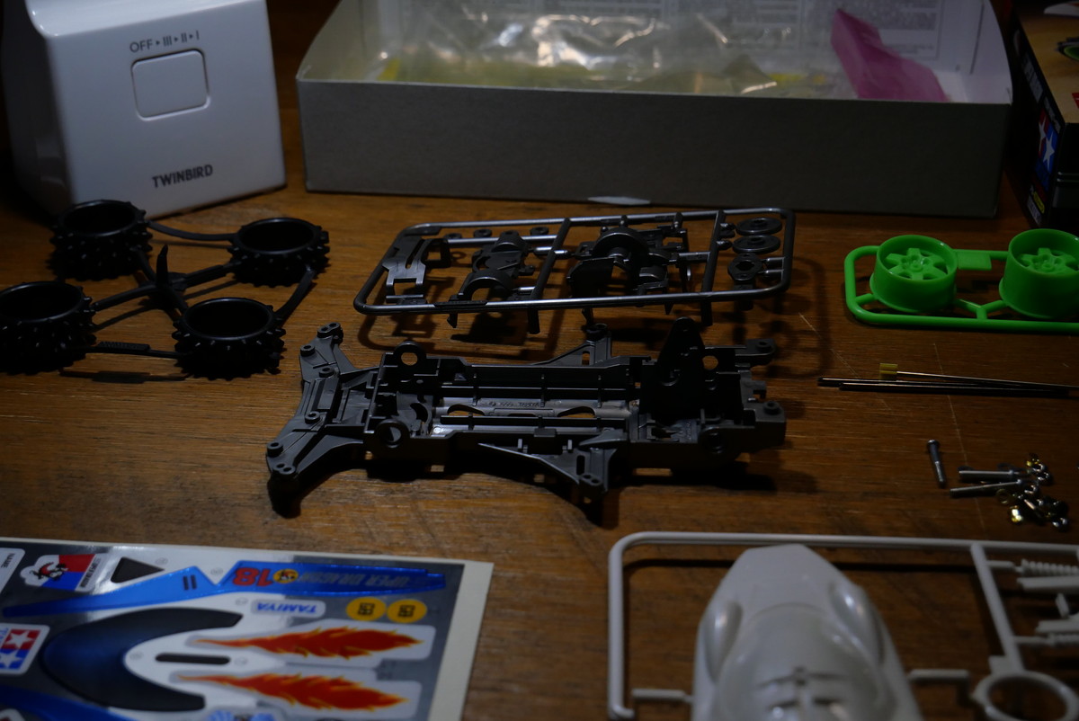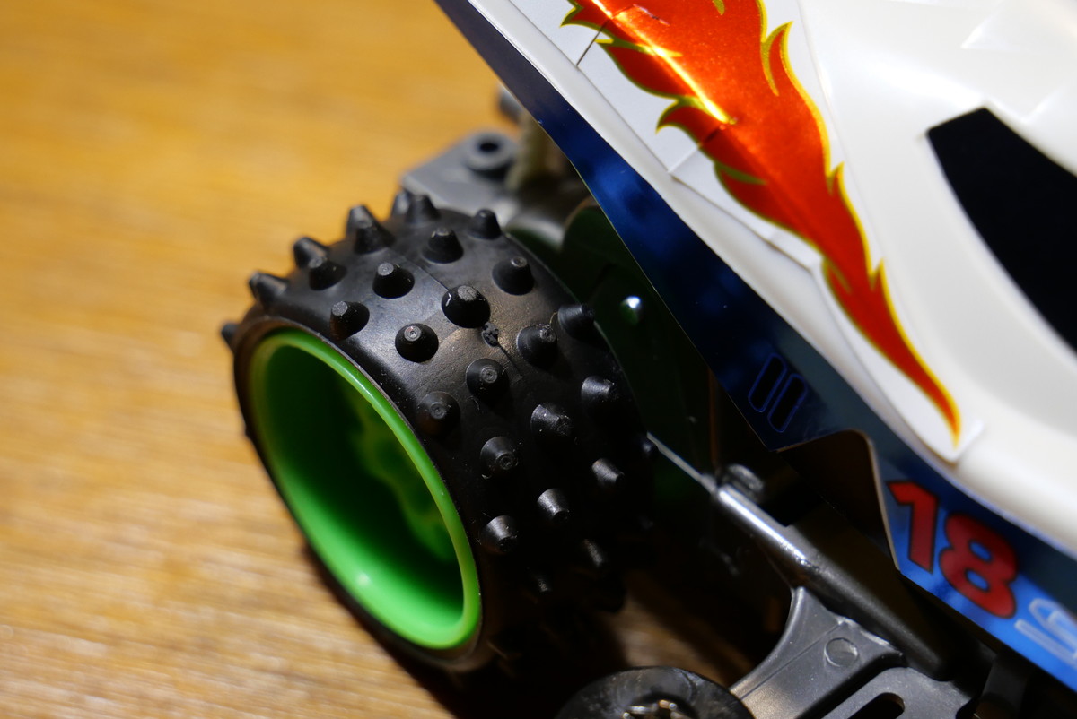 「そうそう、ミニ四駆が出たての頃はこんなスパイクタイヤしかなかったんだよなぁ。カッターでスパイク部分を切ってお手製スリックタイヤを作ったな~」なんてひとり言をブツブツ言いながら作業を進め、4台ともサクッと完成! さすがにずっと強は無理だったので中と強を使い分けて、なんとか最後までバッテリーはもちました。