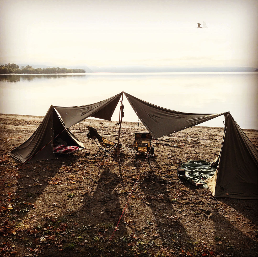 まず、生地自体の撥水性が一番高いと思います。そして、175㎝の正方形なので、組み合わせ次第でさまざまな張り方アレンジが可能ですし、雨の日に必要な広い居住空間を作り出すせます。写真のように6枚張りであれば、デュオでもかなりの広さで使え、庇部分を写真のように変形させることで、雨の逃げ道も作れます。本当に快適な軍幕ですよ!