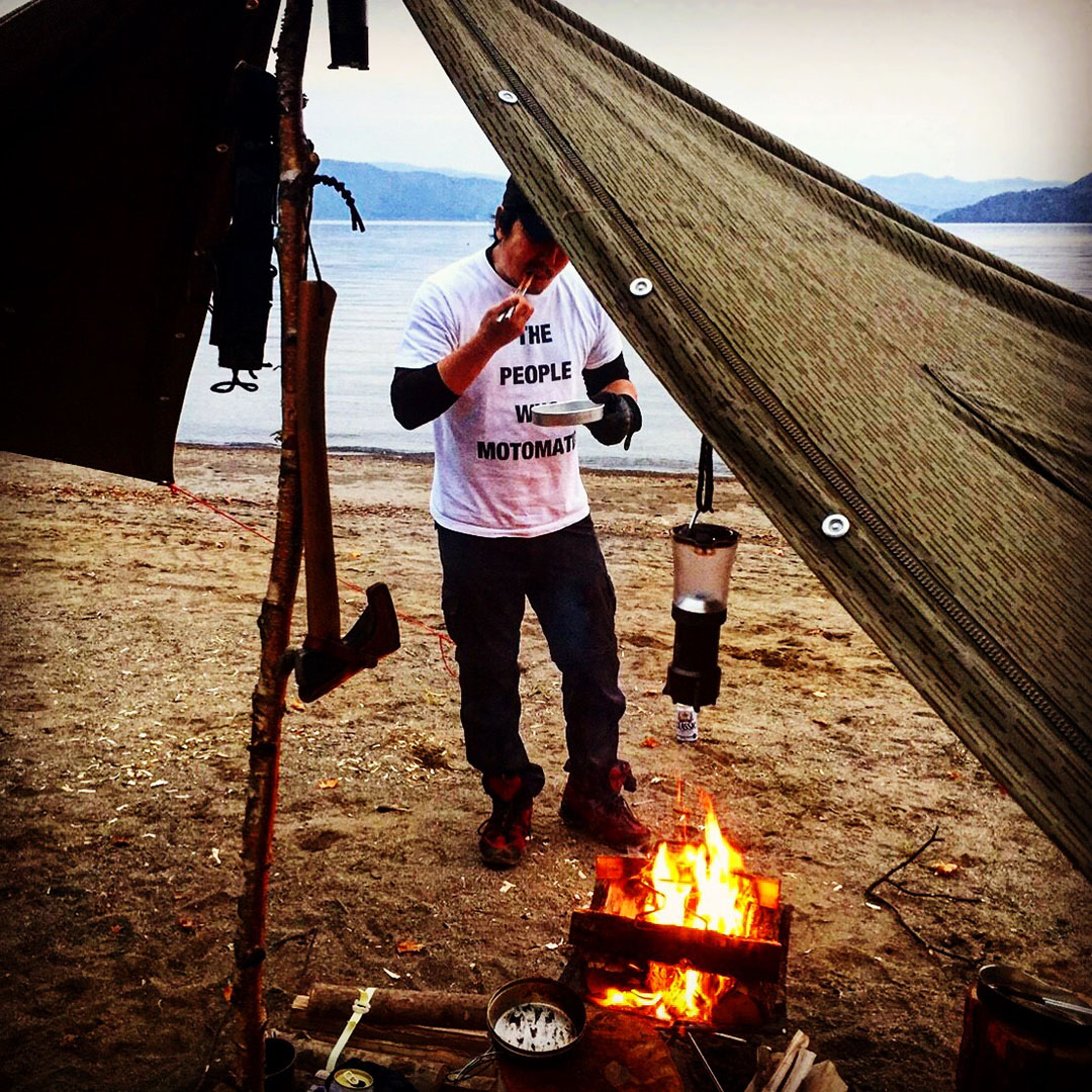 この写真の時は雨が止んでいましたが、雨が時々降っていたので軍幕を跳ね上げ、タープ状にしたところの下で焚き火を行っております。