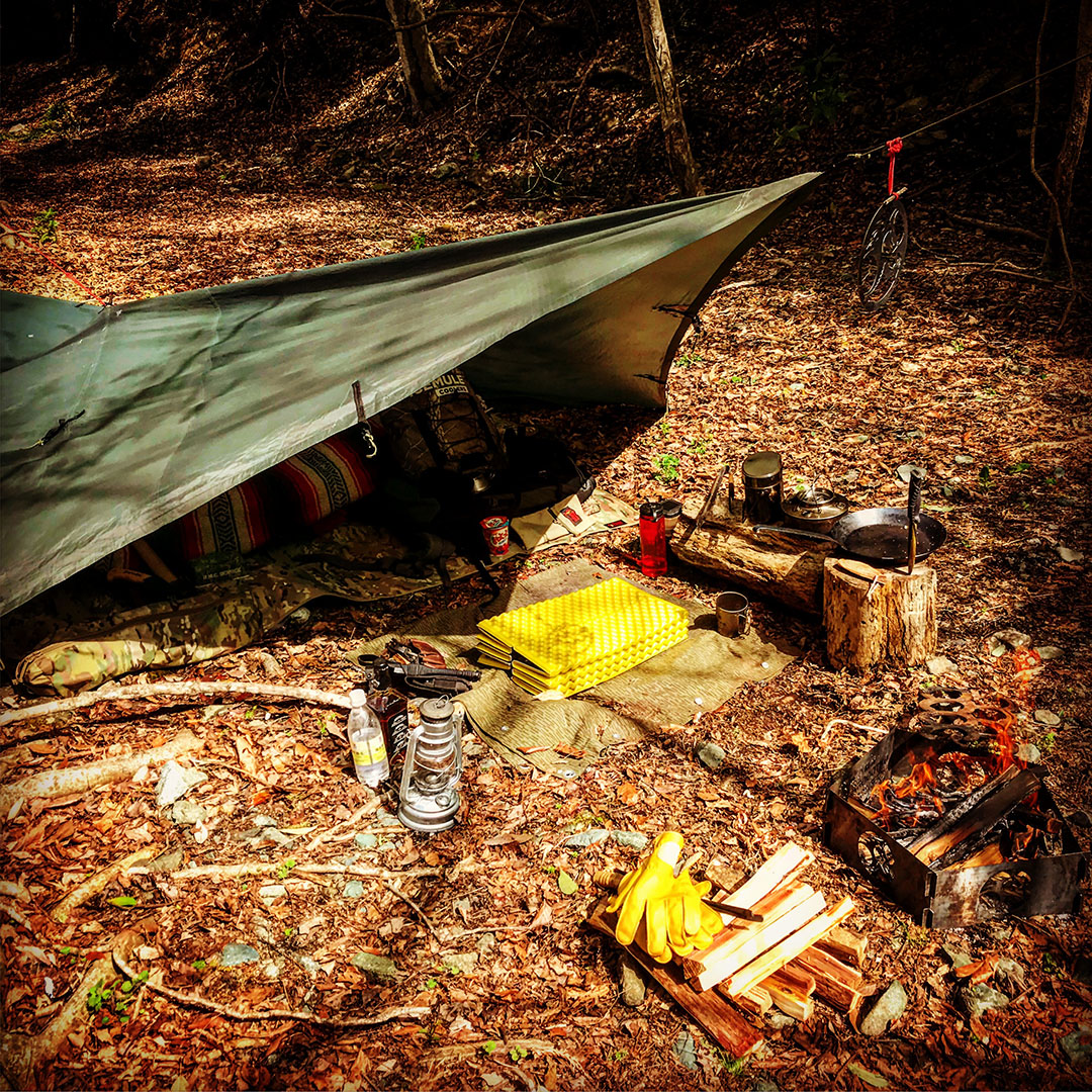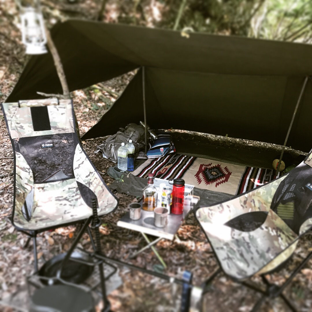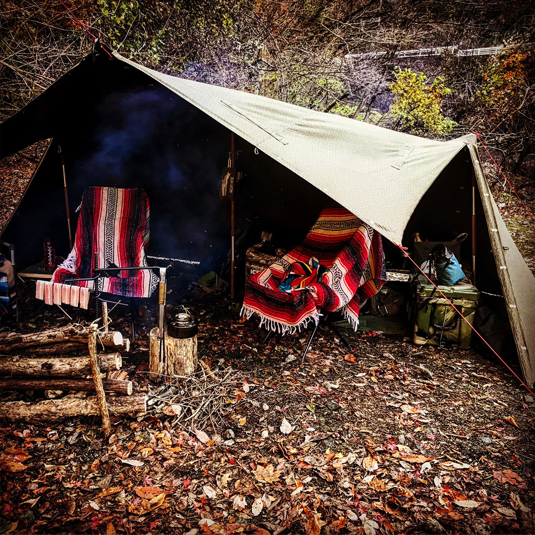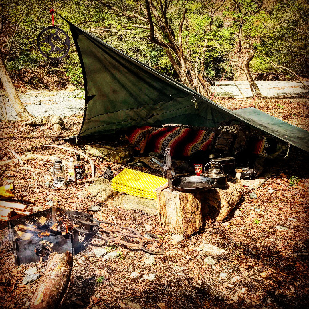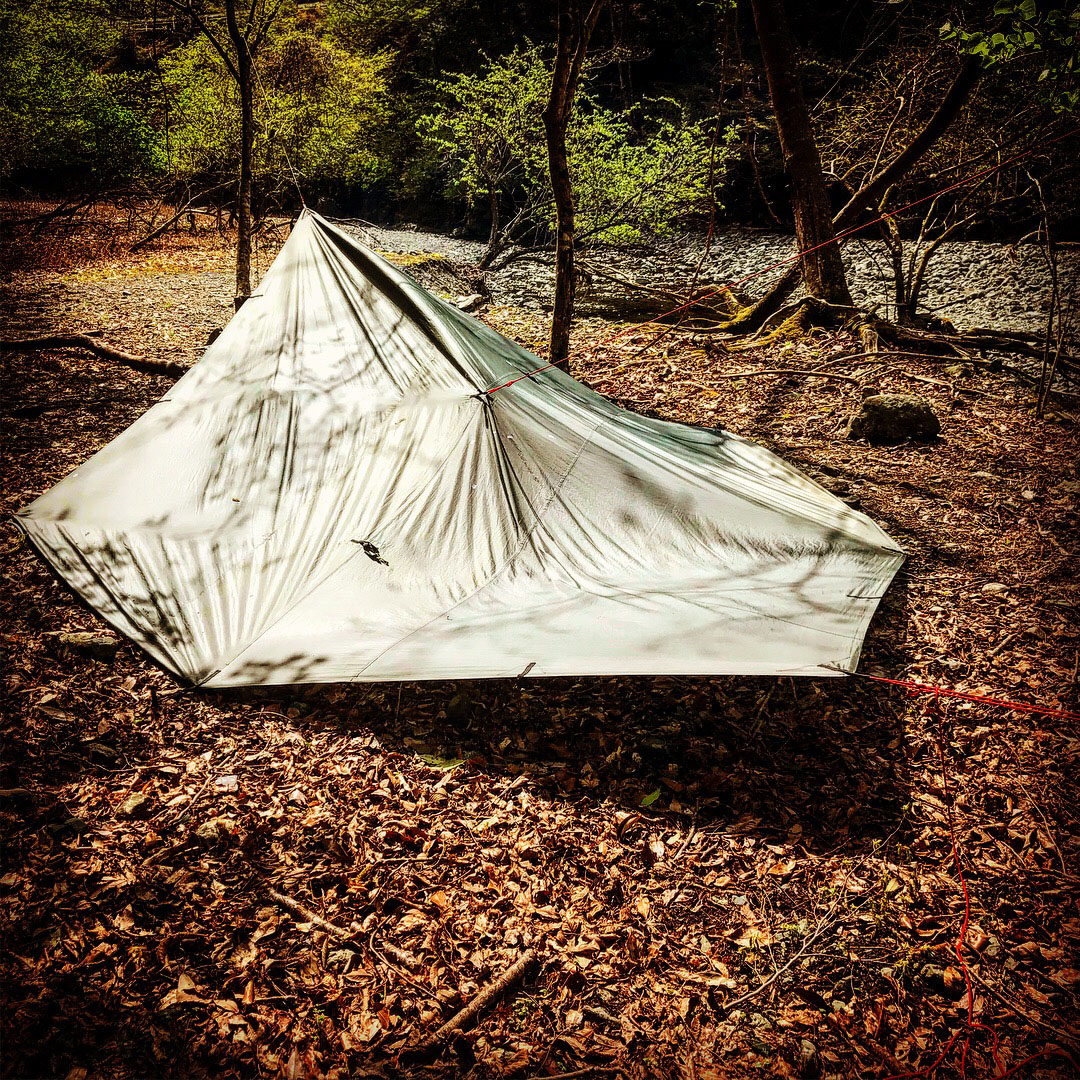 オーソドックスですが、USパップテントはそこそこ雨に強く、この写真の張り方「USパップテント オープン型」であればかなり広い空間ができますし、タープ状に張り出したこの庇部分が雨から守ってくれます。デュオはきついですが、ソロなら雨の日でも十分な居住空間を得られると思いますよ!
