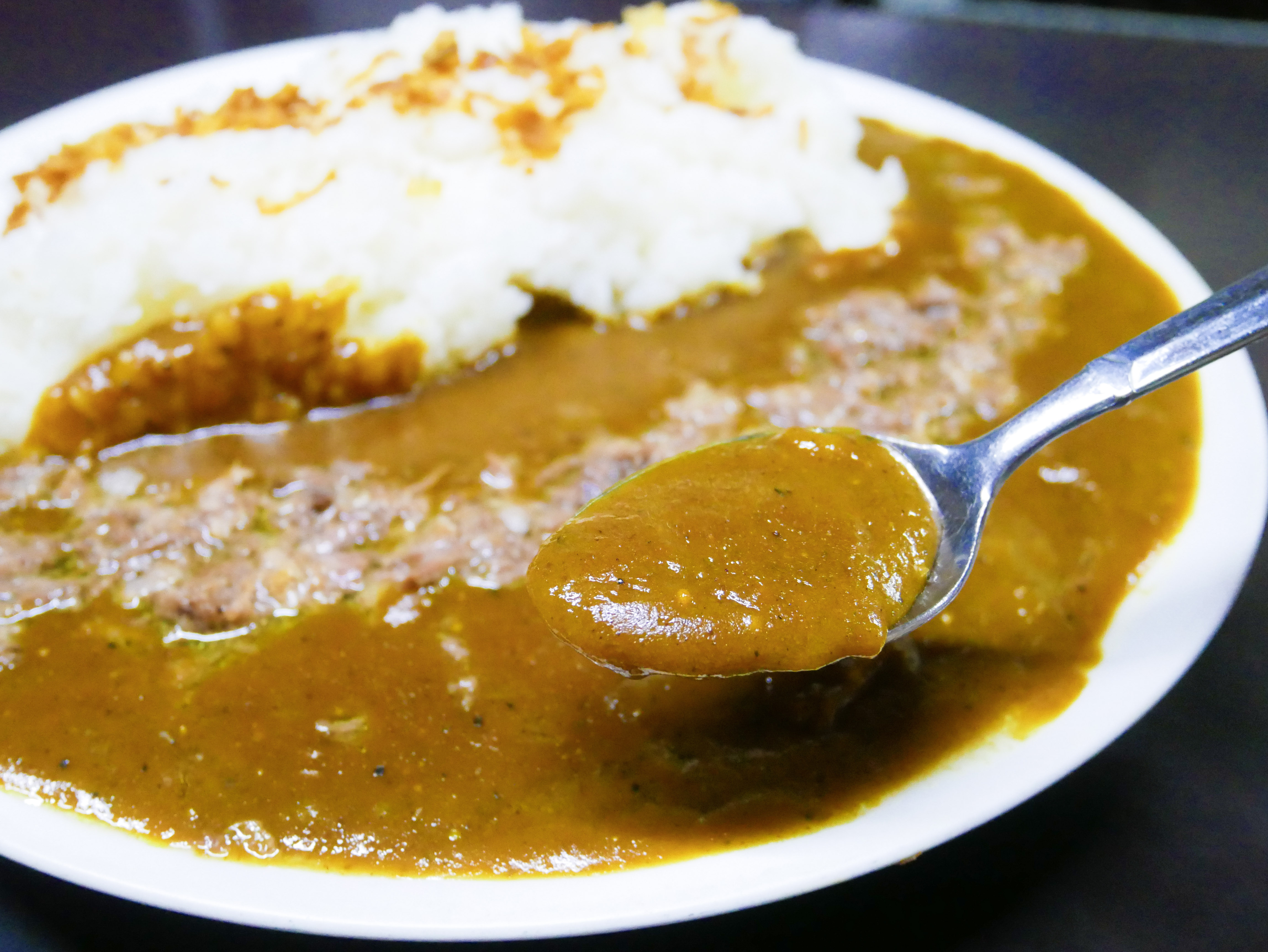 ということで、早速一口。最初は甘く感じるルーですが、おそらくコショウがたっぷり効いていて、食べ進める毎にピリピリとした爽やかな刺激が舌に重なってきます。ほどよいとろみはゴハンと一緒にスプーンにすくってもなめらか。スイスイと食べ進めることができます。