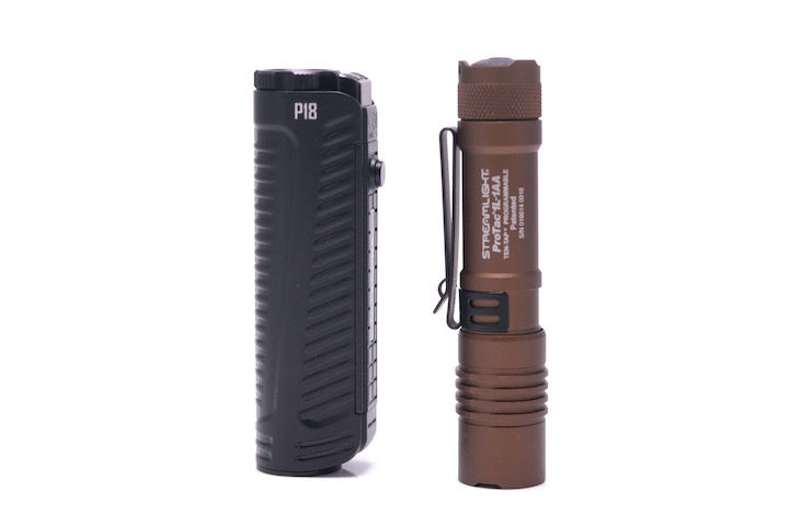 実測全長106mmと、18650電池を使用するライトとしては非常にコンパクト。単三電池を使用するライトと比較しても、長さはほぼ同じです。それでもこのぐらいの数値自体は数年前からよくあるのですが、それらは全長を圧縮するため光学系がレンズ式、スイッチがサイド式のライトでした。しかし「P18」はリフレクターも深く、テールスイッチもあるなど、さらに一段進化を意図しているように感じます。