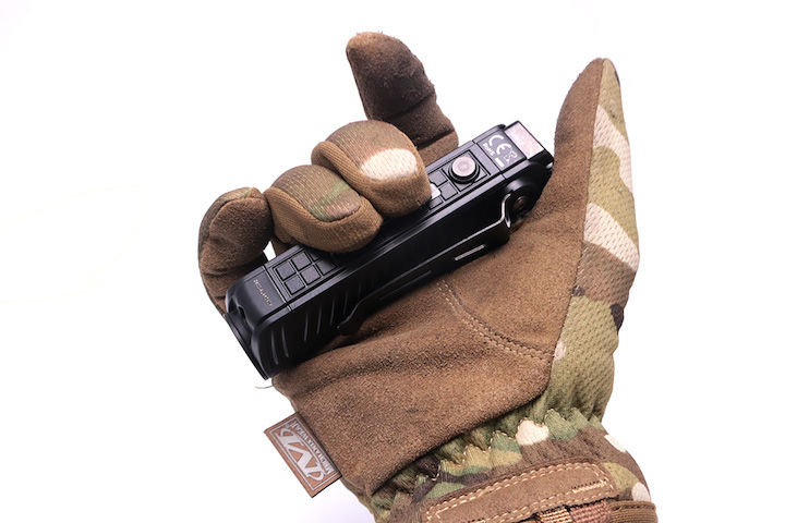 このようなグリップポジションであれば、親指ではテールスイッチ、人差し指でサイドスイッチにそれぞれアクセスしやすいと思います。そう、このライトは逆手持ちをメインに考えられていて、その辺りはPシリーズの系譜だなという感じはしますね。
