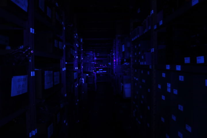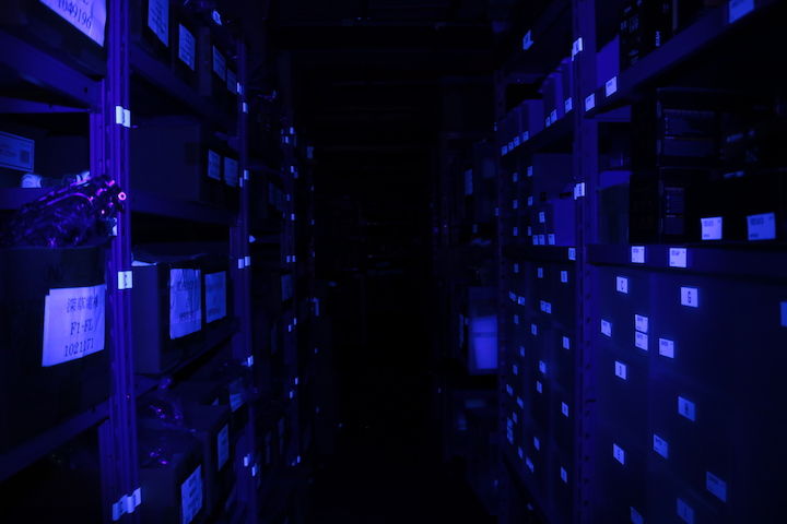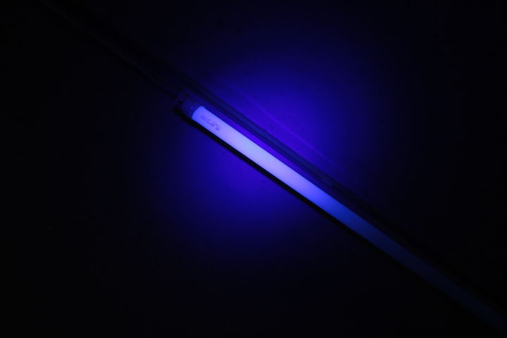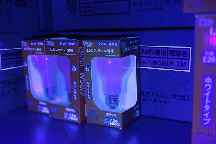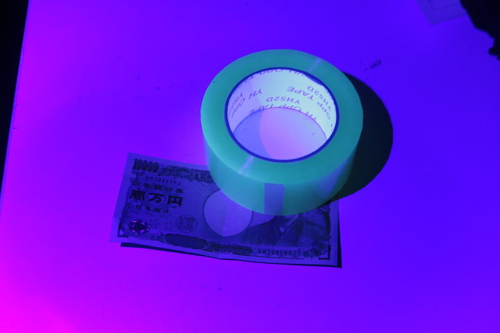 照射画像。流石にUVは暗く感じますので、普段よりもかなり明るく設定を作っています。肉眼でも、蛍光反射するラベル類が浮き上がって見え、そのほかが暗く見えますのでかなりインパクトのある光景が広がります。