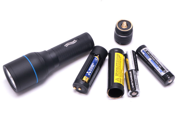 UV専用ライトはそれだけでプロ向けな感じがしますが、「UV5」が特にプロ向きと思うのは、こちらのマルチバッテリーシステムです。18650電池、CR123A×2、単四電池×3と3種類の電池を使用可能です。