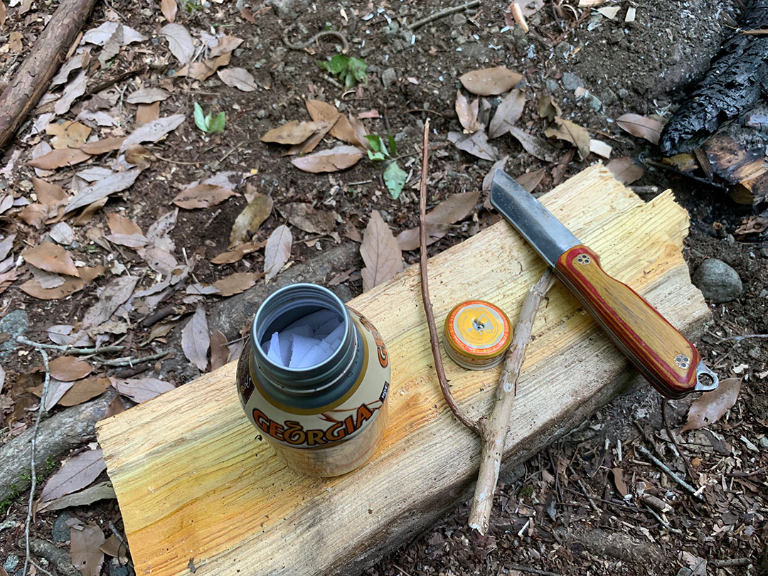 火打石やファイヤースチールの火花をキャッチして、その後、麻紐をほぐしたものや、フェザースティック(かなり細く削ったもの)、枯草などに引火させ、火を育てていきます。