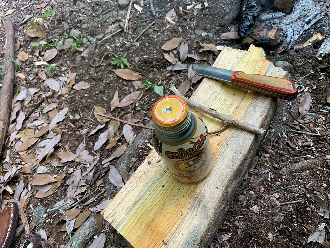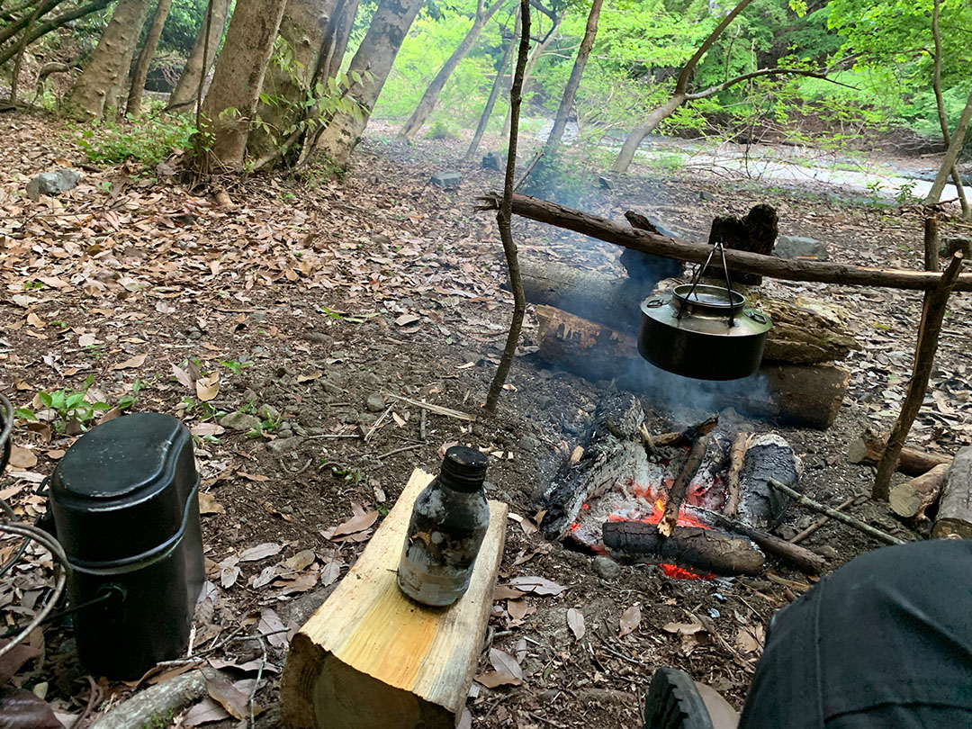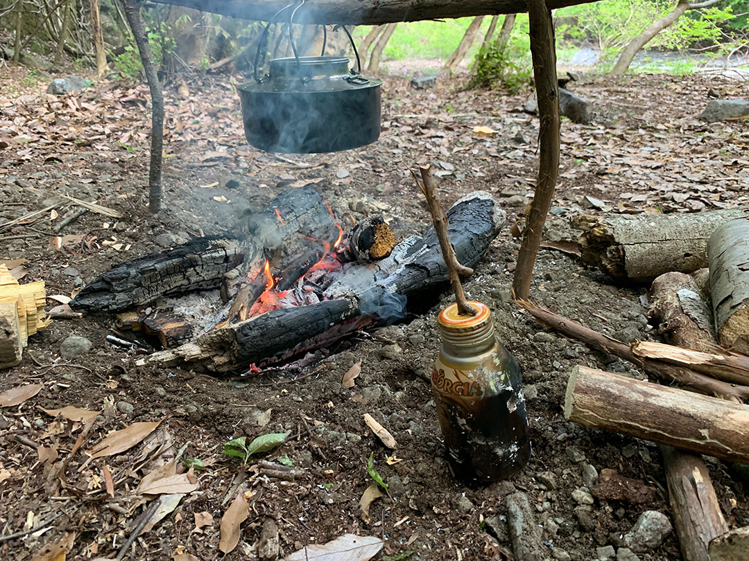 火が消えたら、焚き火から缶を取り出し、枝を蓋の穴に突っ込みます。火が消えると穴から煙が出てくるので、これを逃がさないようにするために、穴に枝を刺してふさいでください。