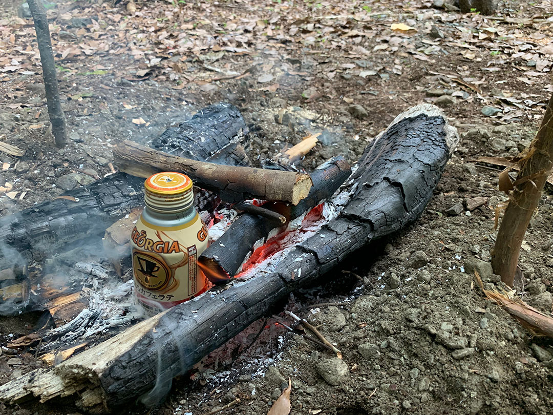 穴を開けた蓋を閉め、空き缶を焚き火に放り込みます。火力は強火で問題ありません。少し時間がかかりますので、出来上がるまで普通に焚き火を楽しんでください。