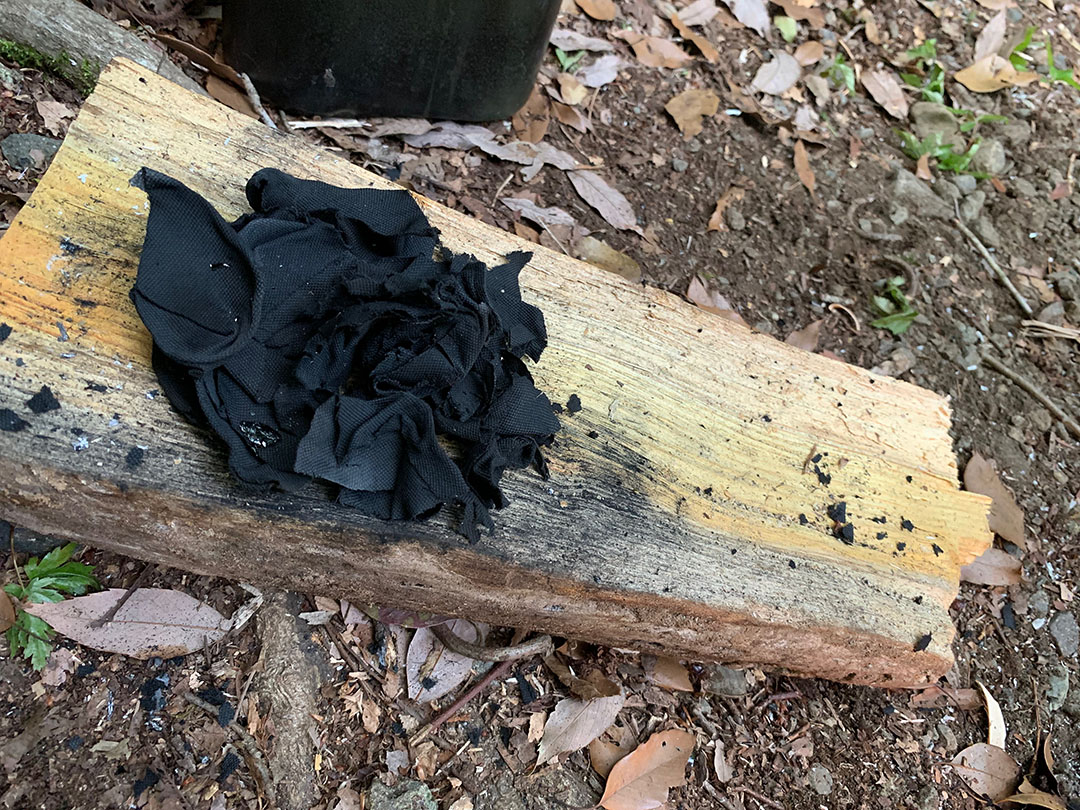自然素材ではなく、あらかじめ作っておける火口の中でも簡単なのがチャークロス。簡単にいうと布を炭化させたものです。