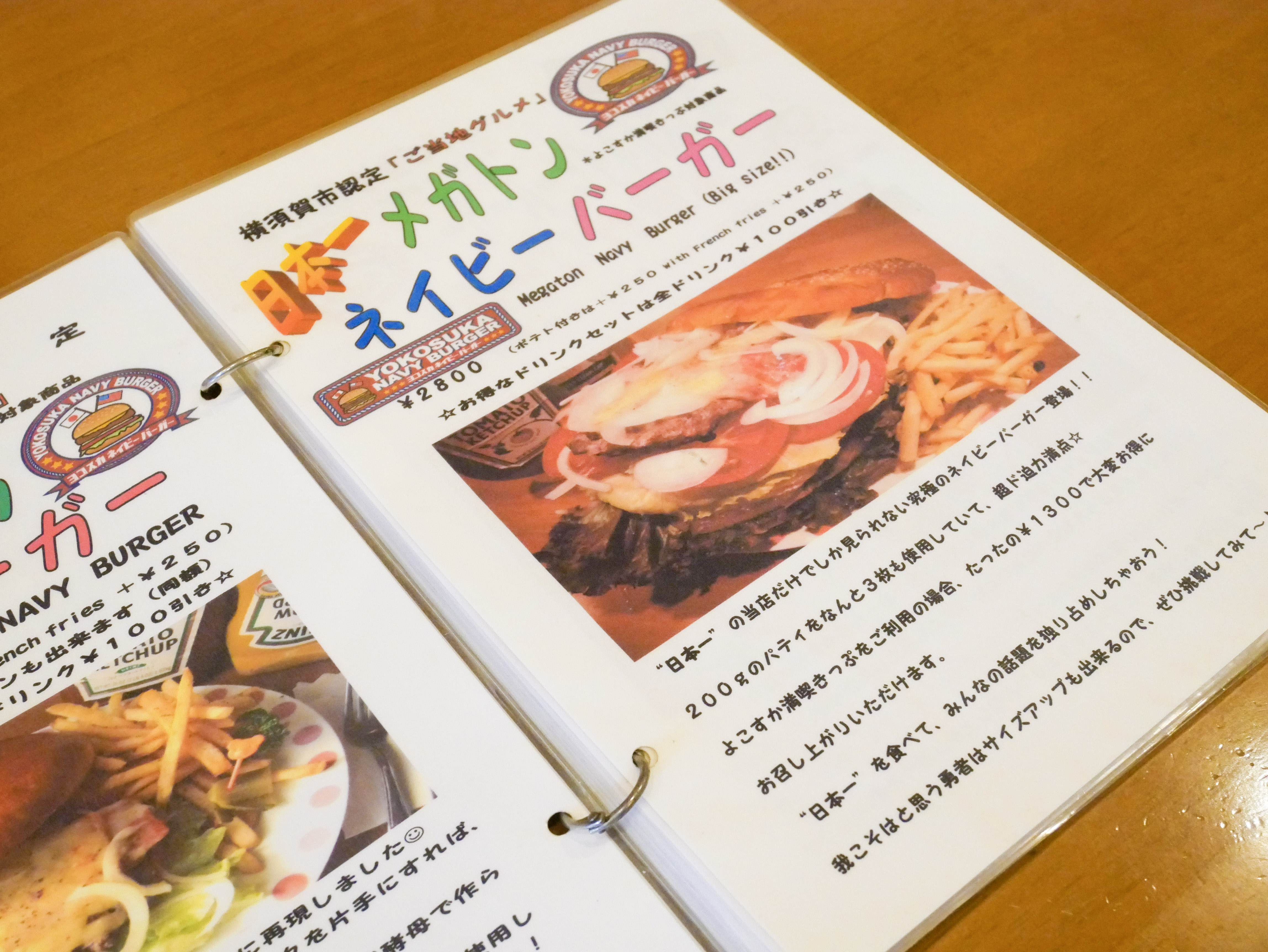 店に入り席に着き、メニューをめくるとさっそく発見、“日本一メガトンネイビーバーガー”の文字が。よく読むと「200gのパティをなんと3枚も使用していて、超ド迫力満点」。ほほ〜。隣のページの通常サイズのネイビーバーガーも大きく見えますが、こっちはもっと凄そうです。ということで、さっそく注文。どれだけ大きなハンバーガーがやってくるのか、ワクワクしながら待ちます。