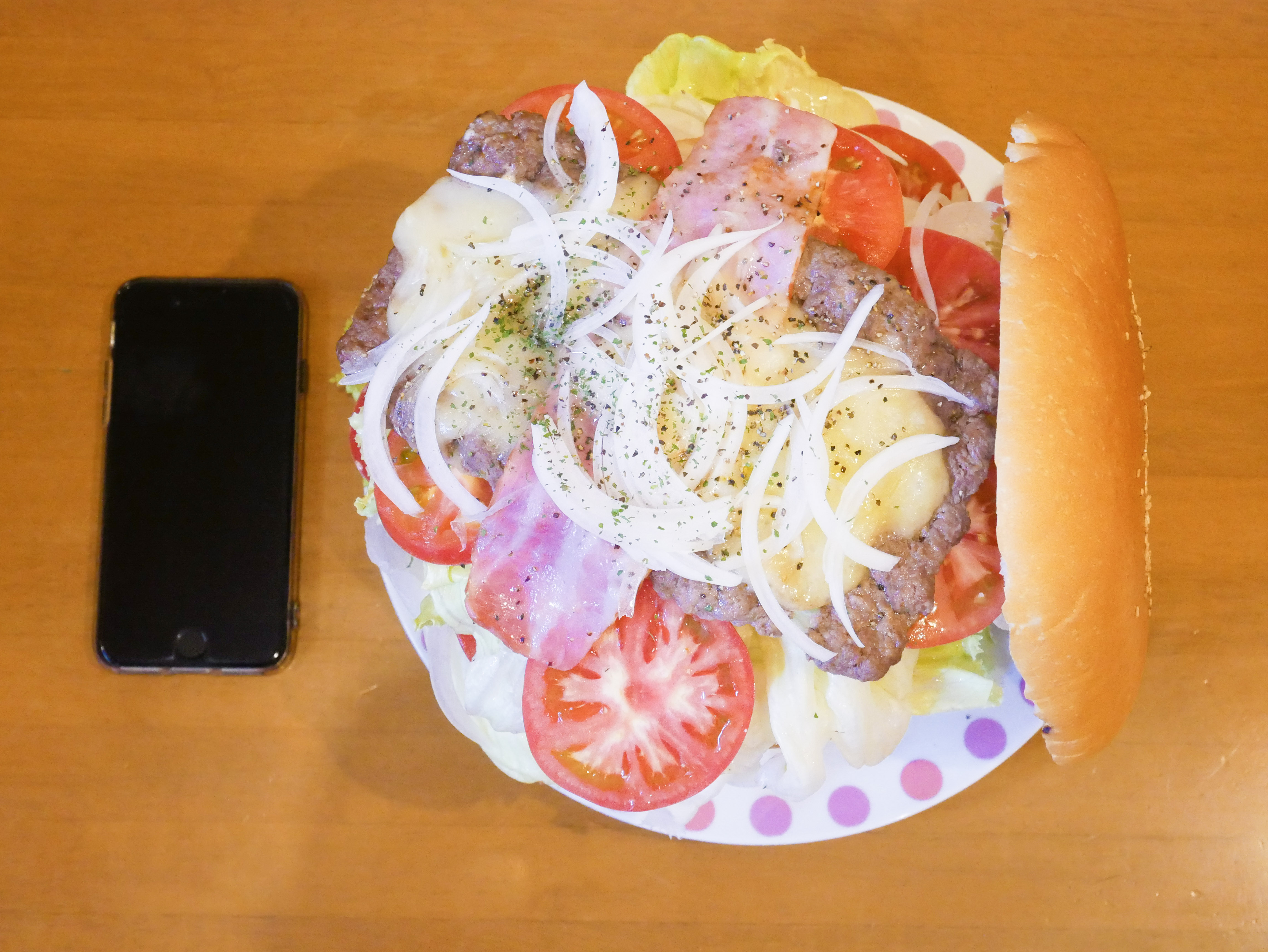 待つこと数分、やってきたのは、お皿いっぱい、しかも高さのある、巨大すぎるハンバーガー! さっそく計測したところ、高さ18cm、直径約27cm、重さは1990g(お皿の重さを除く)。バンズ、タマネギ、チーズ、ベーコン、トマト、パテ、レタス、またバンズ、というのが3段重ねでドッドーン。野菜たっぷりのヘルシーバーガー。バレーやサッカーのボールの一回り小さいぐらい? 巨大円錐形のド迫力ハンバーガーです!