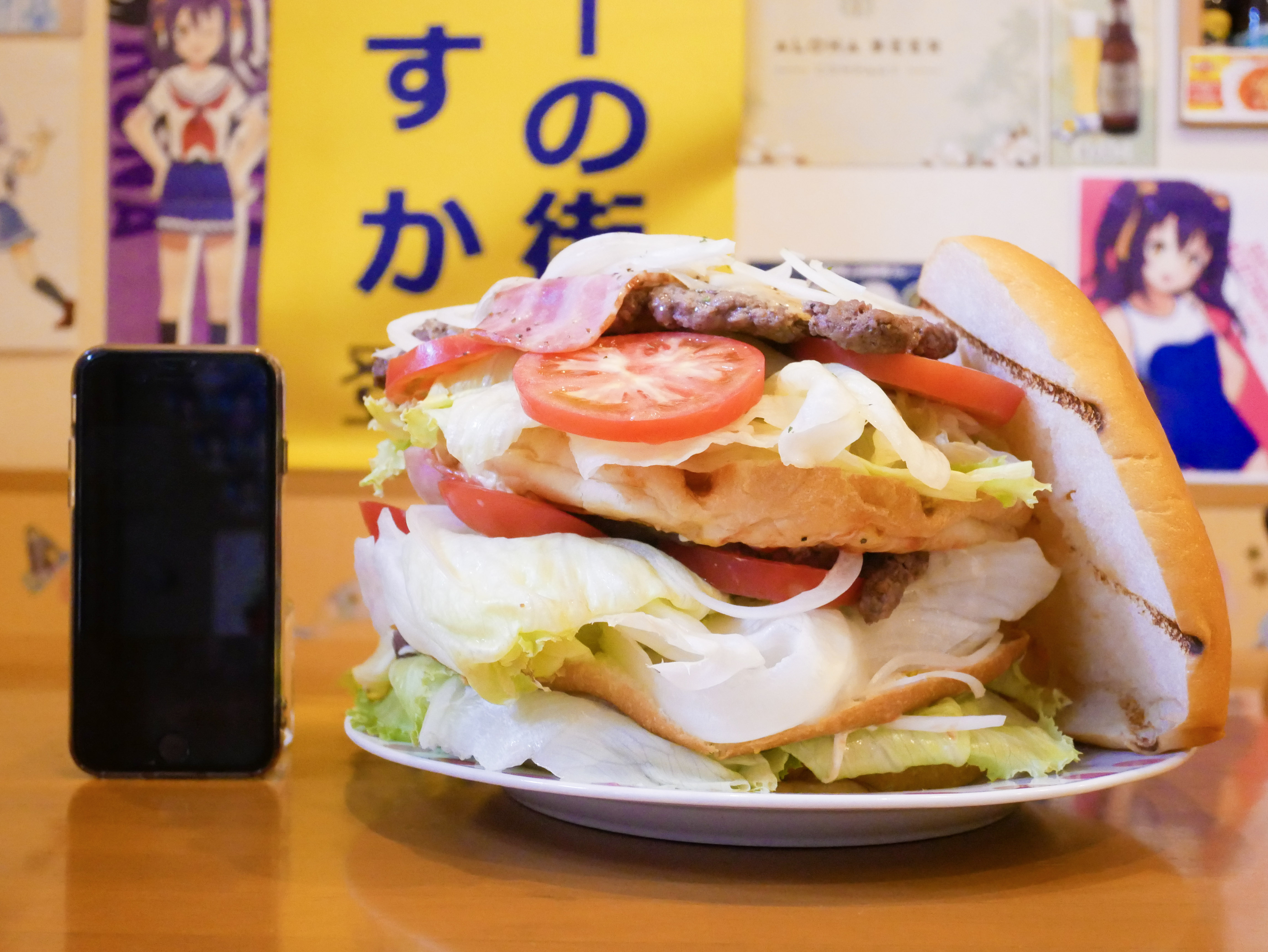 ▲スマホと並べてもバーガーのほうが高い、高さ18cm。レタスの存在感もすごい!