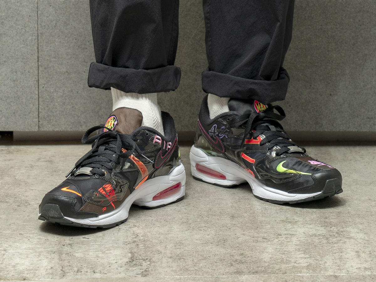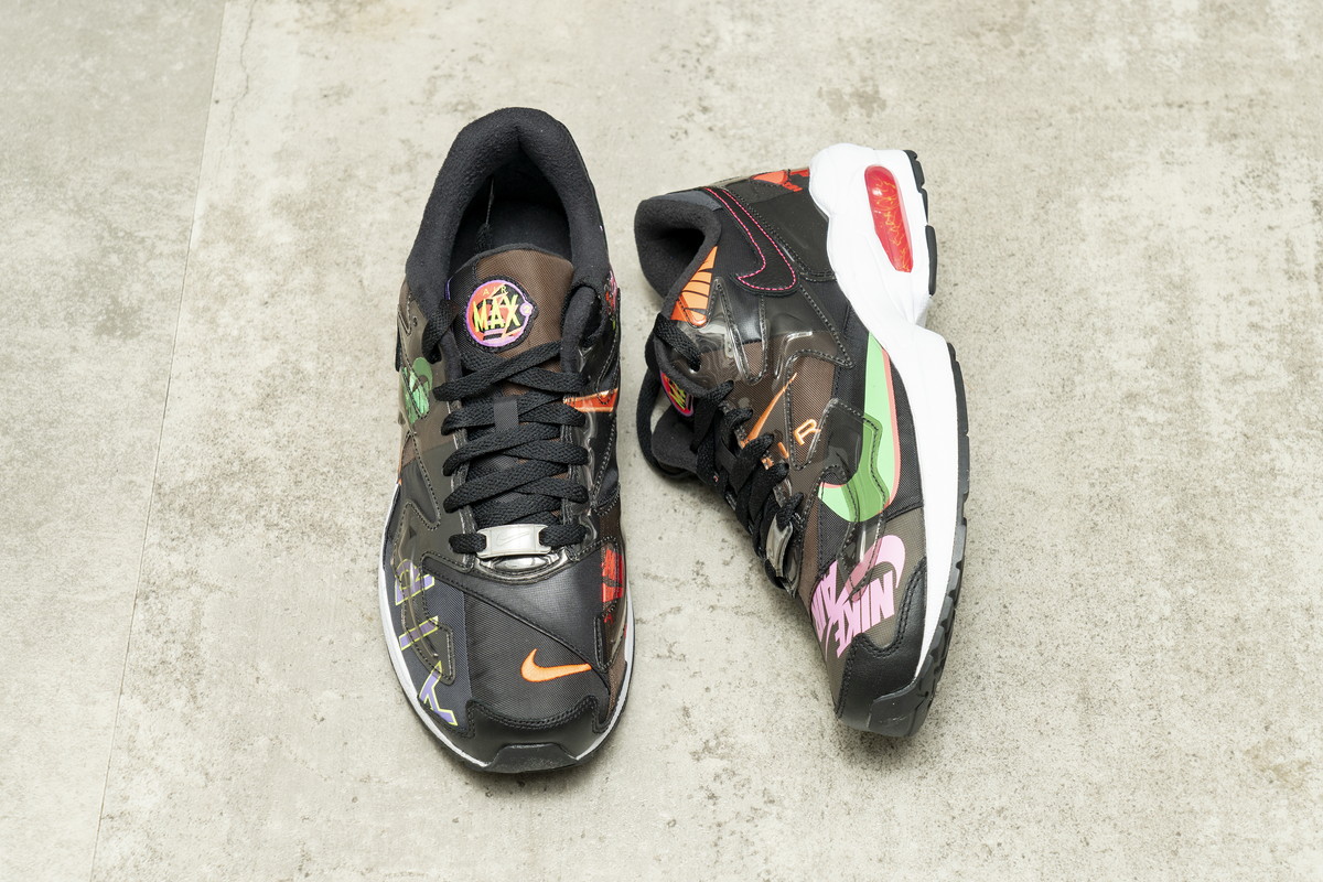 一見するとチャラい感じですが、ベースのシューズ自体は極めて骨太。しかも“実はコレってあの「エア マックス 95」のもとになった名作だぜ? ”って感じで、ドスの効いたボディーブローウンチク!? も語れたりもするので、スニーカー通っぽく決めちゃってみてください!(笑)