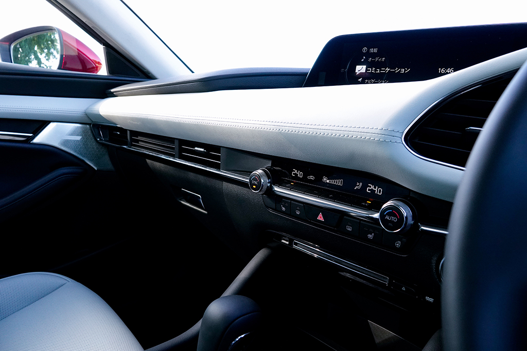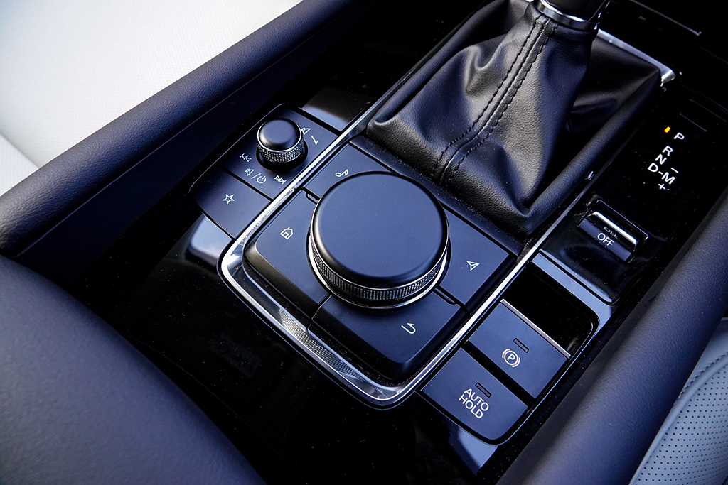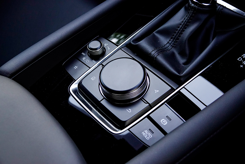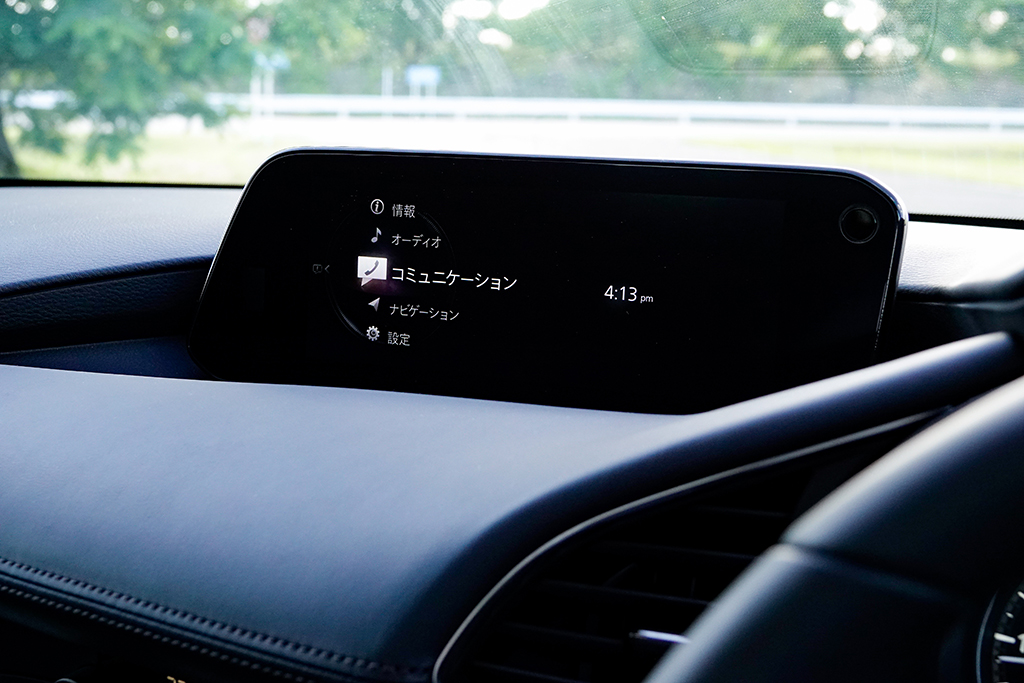 しかしマツダ3には、センターコンソールにダイヤルとスイッチ、そしてタッチパッドを組み合わせた、車両と一体開発のインターフェイスが備えられていて、手元を注視しなくても各種機能を操作できる。これは、同クラスの日本車としては唯一であると同時に、アウディなど欧州のライバルと同じ手法。