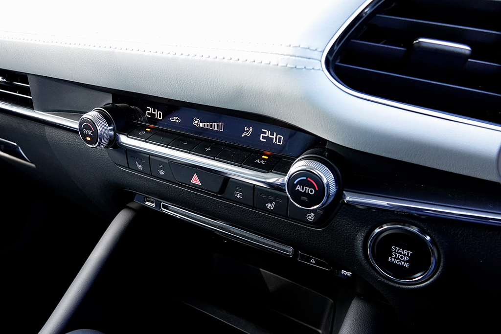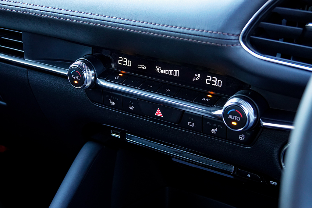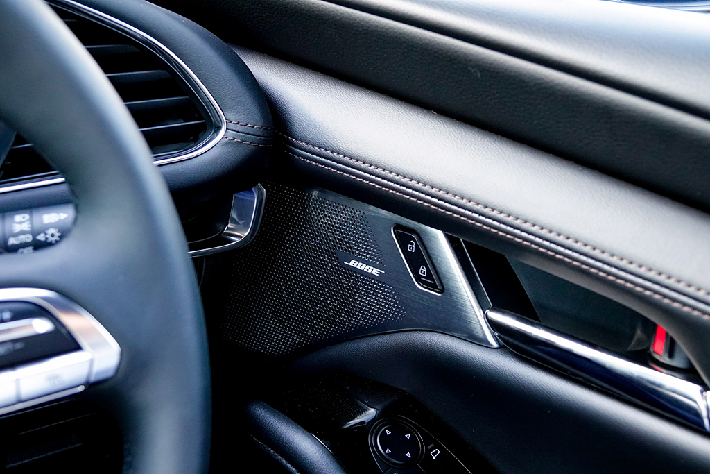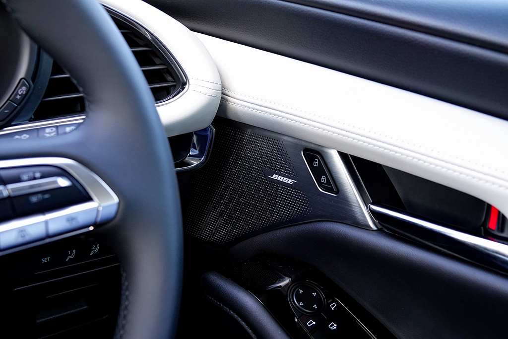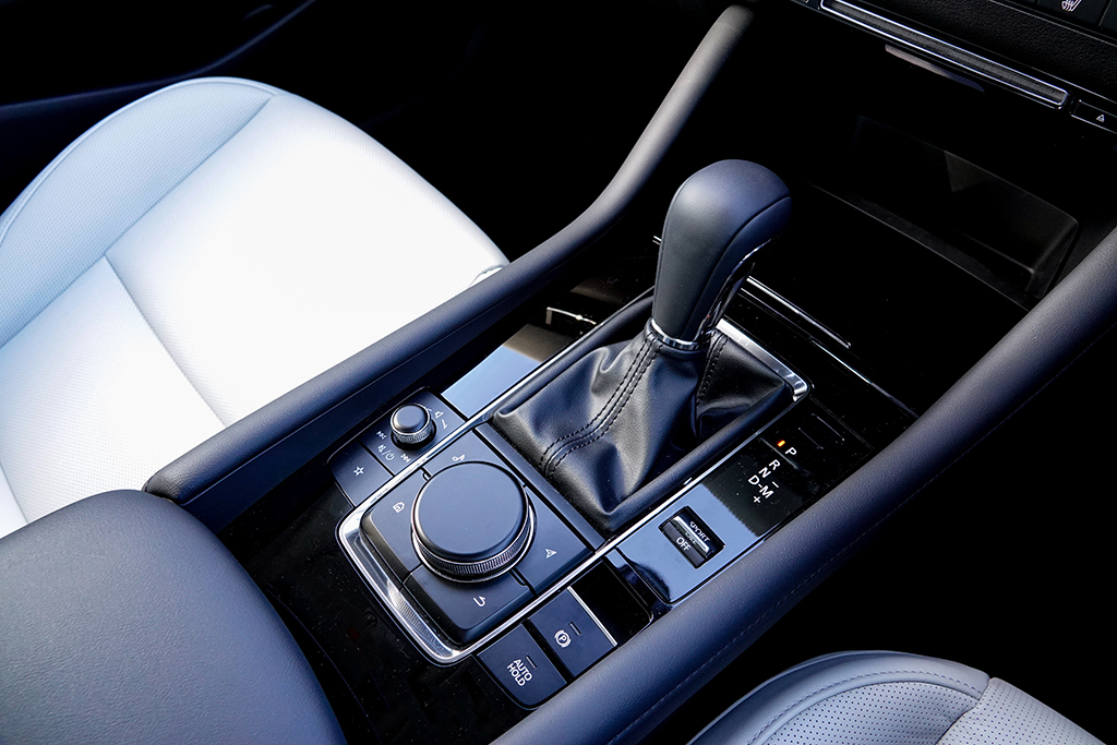 しかしマツダ3には、センターコンソールにダイヤルとスイッチ、そしてタッチパッドを組み合わせた、車両と一体開発のインターフェイスが備えられていて、手元を注視しなくても各種機能を操作できる。これは、同クラスの日本車としては唯一であると同時に、アウディなど欧州のライバルと同じ手法。