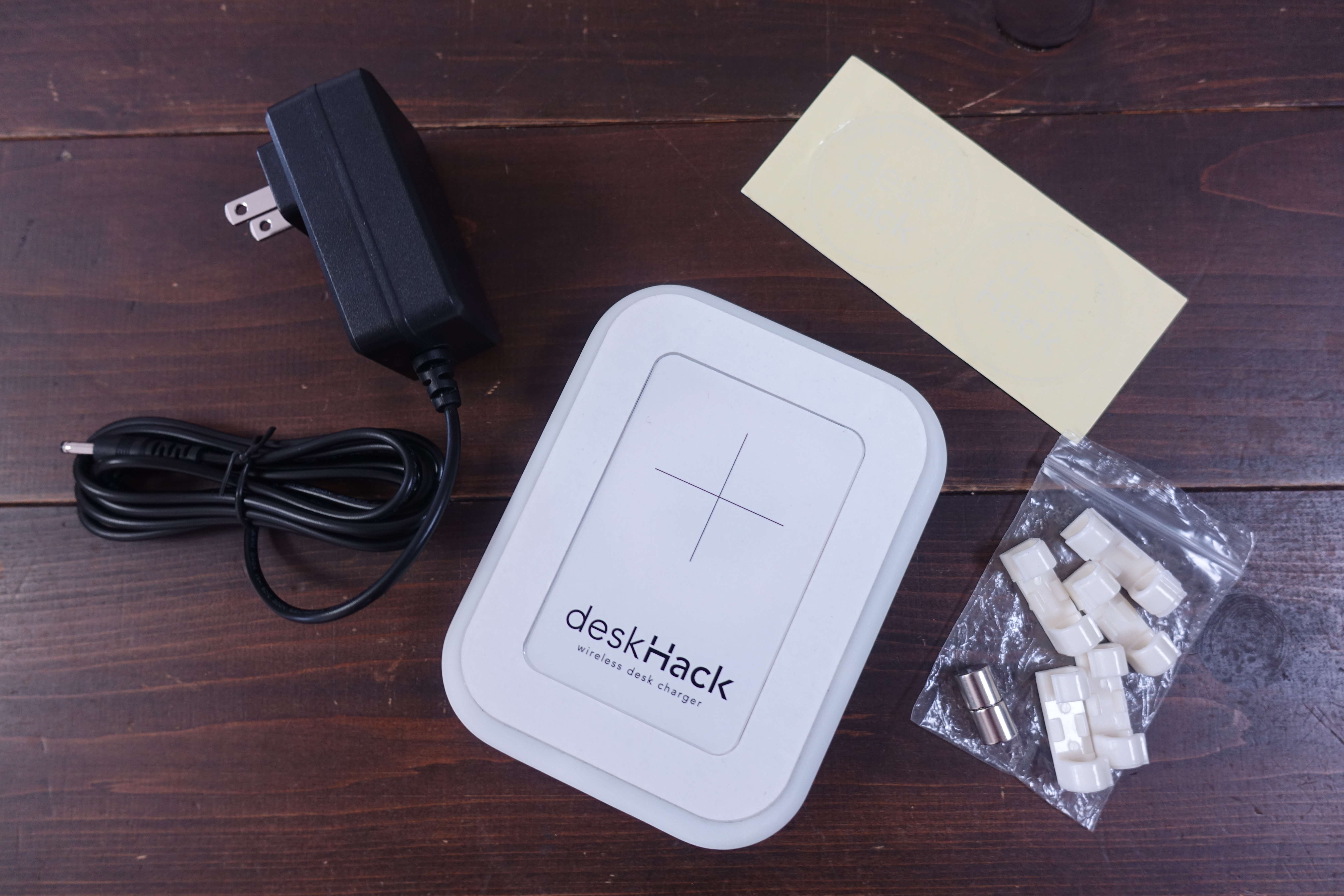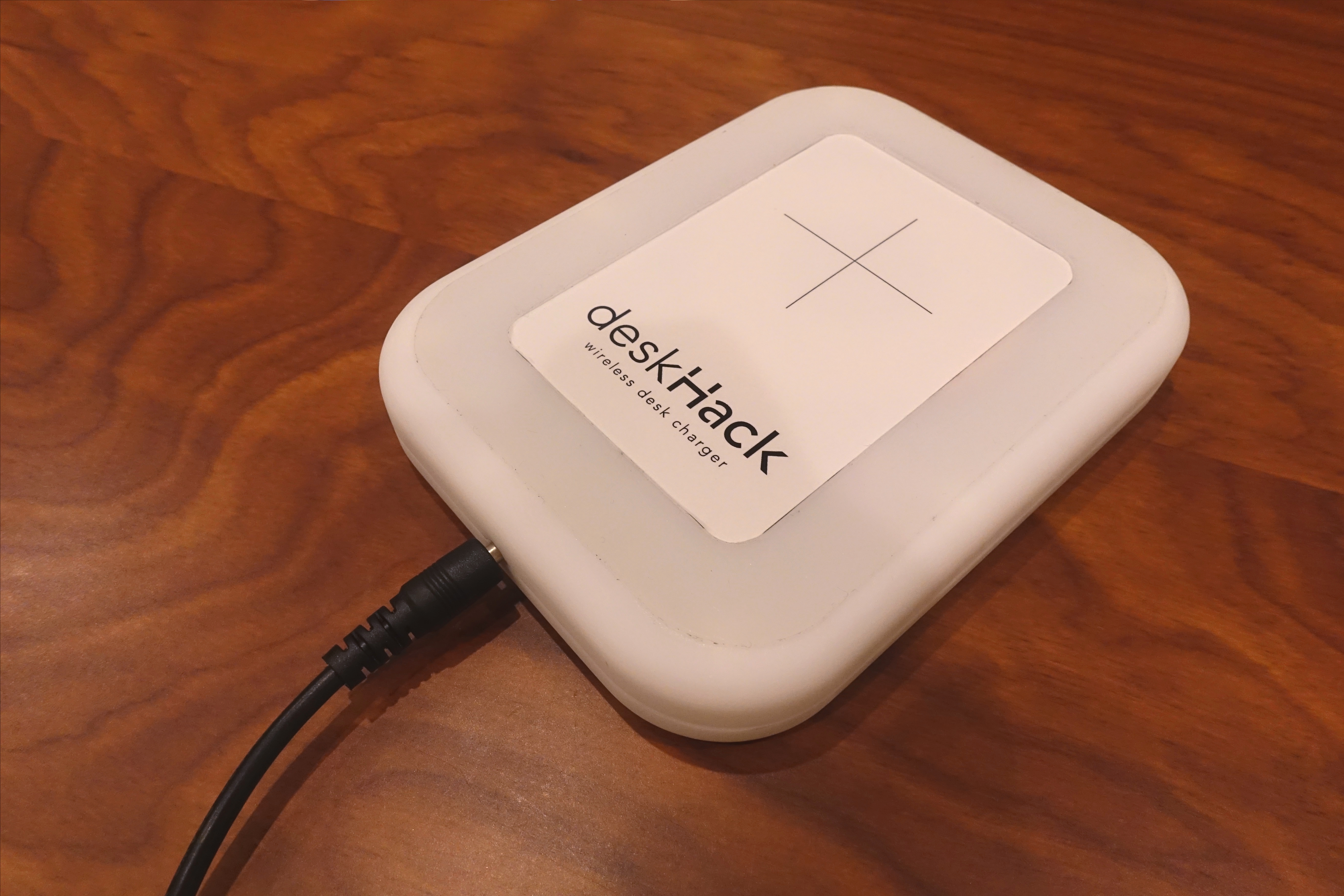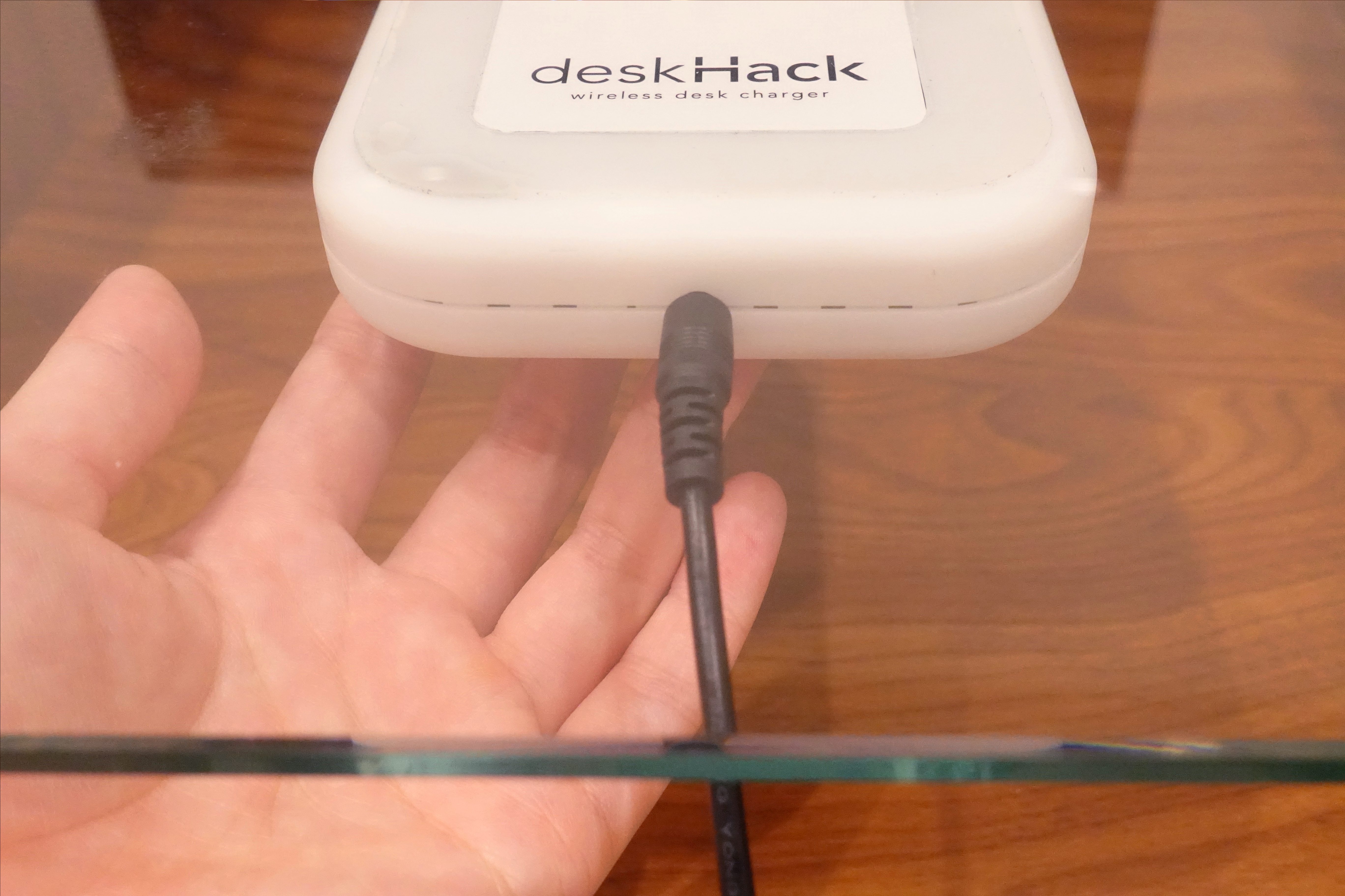 デスクハックは、デスクの上に置くのではなく下に貼り付けて使うタイプのワイヤレス充電器。一番の特徴は対応する充電距離の長さです。