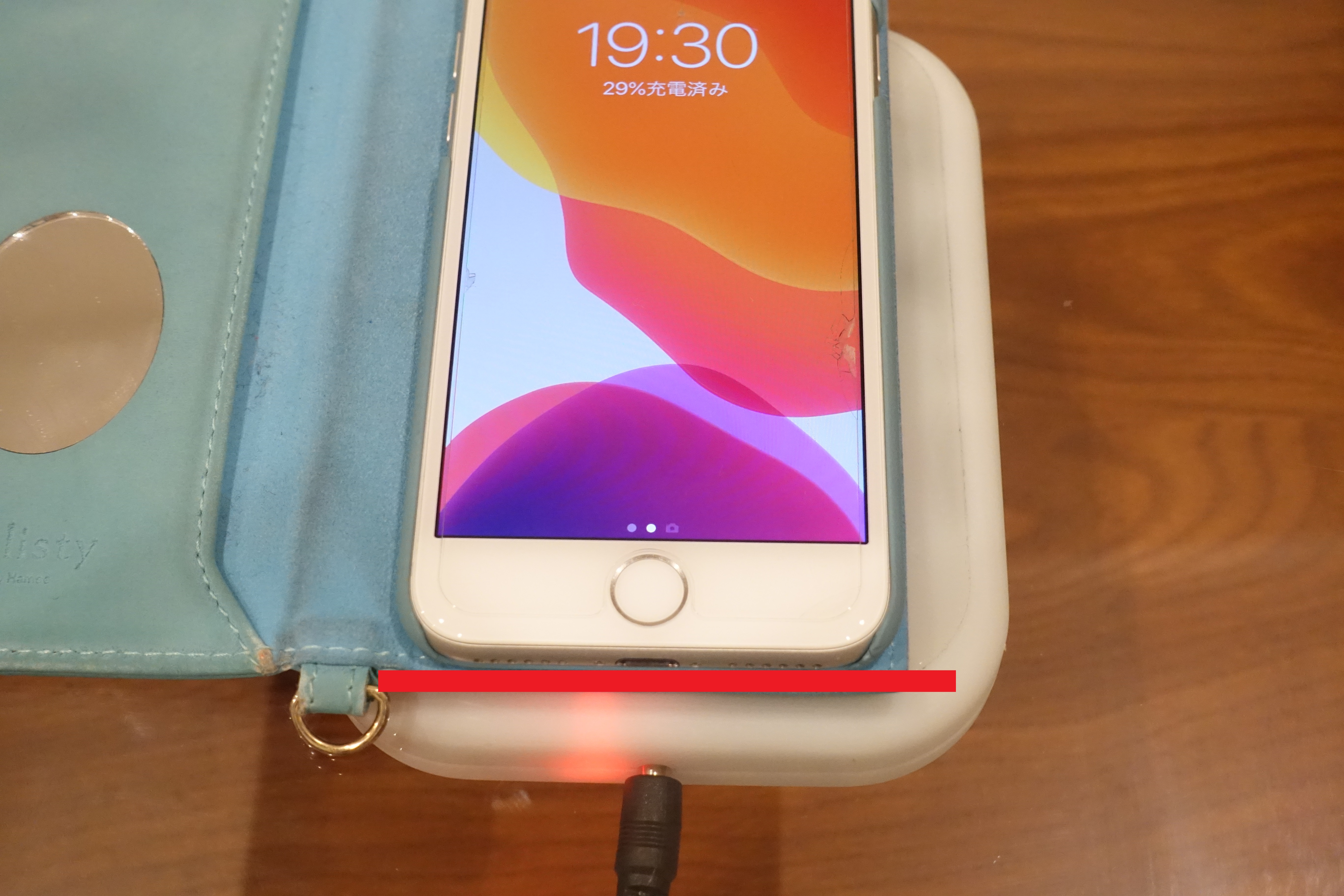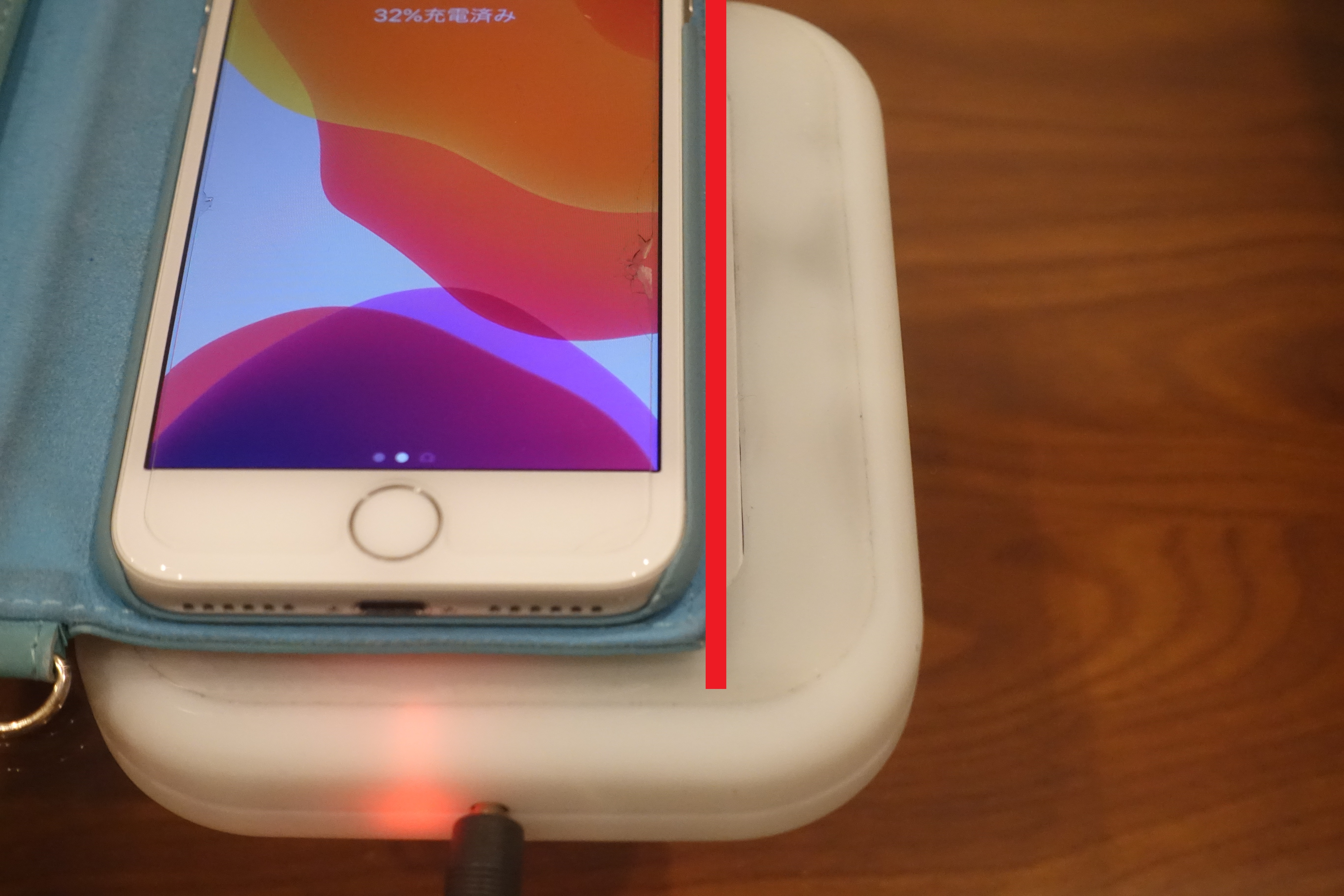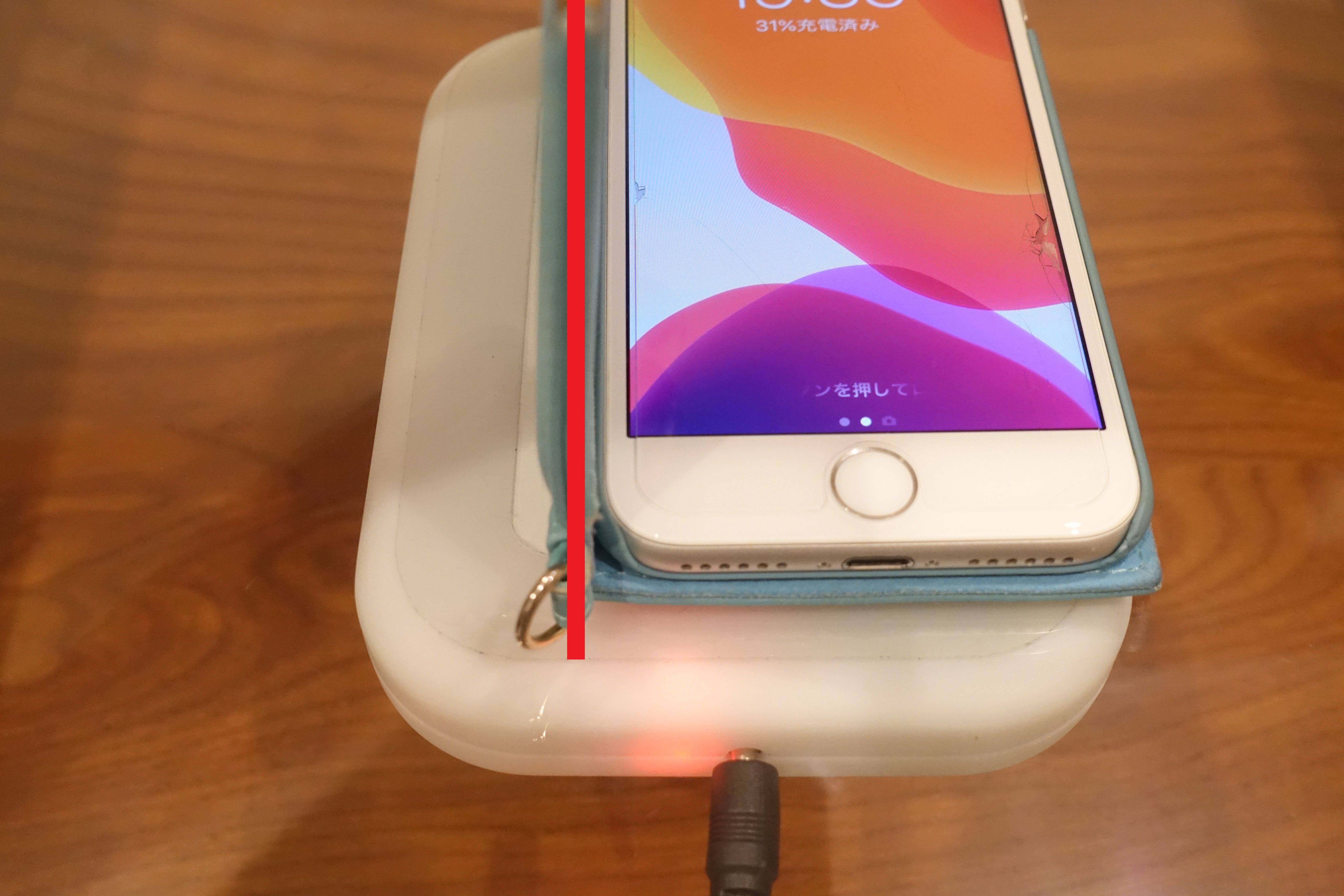 このウッドテーブルの厚みは約12mm。デスクハックの対応充電距離は12mm~32mmなので、このまま置けば充電されるはず。さっそくiPhoneを置いてみると…