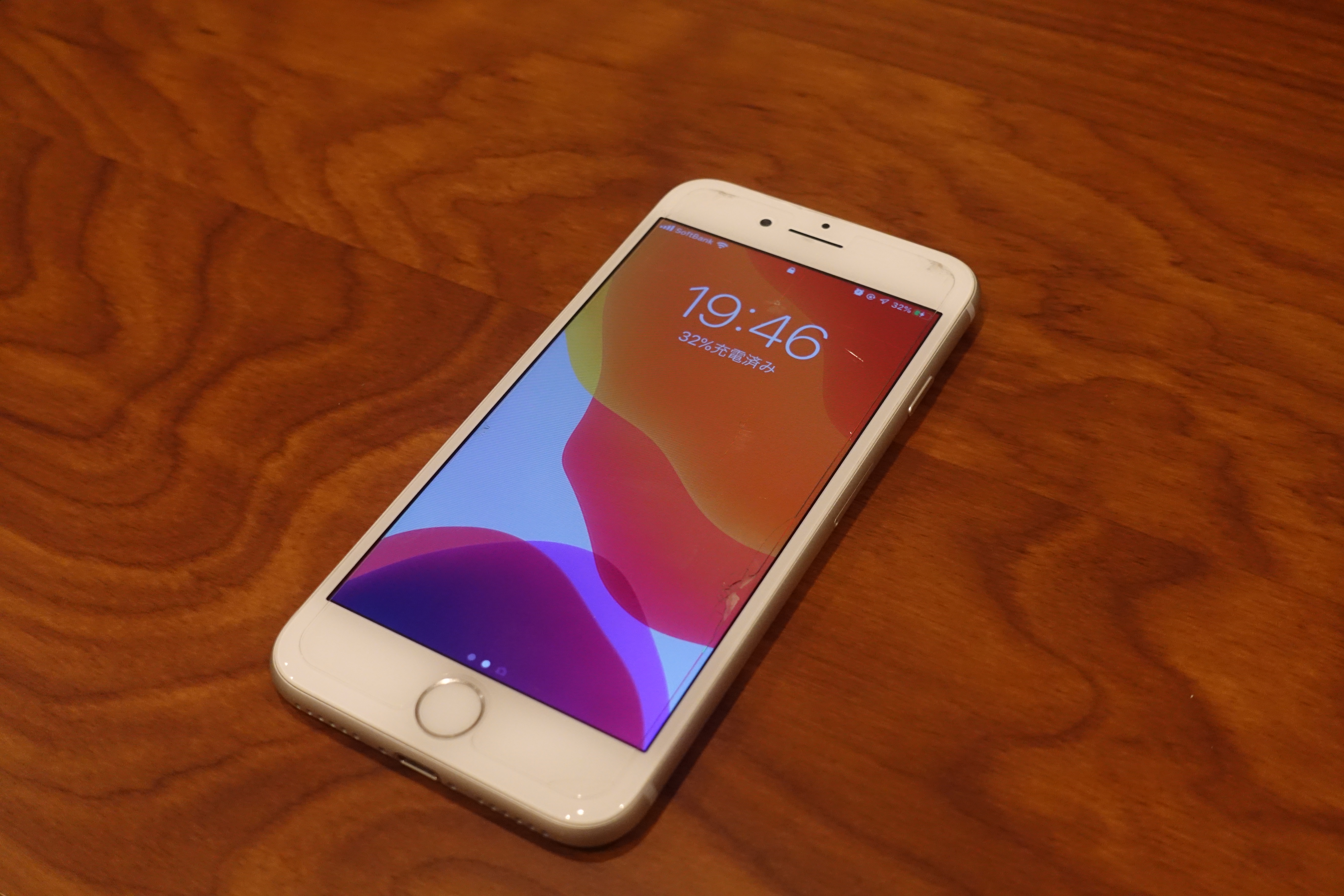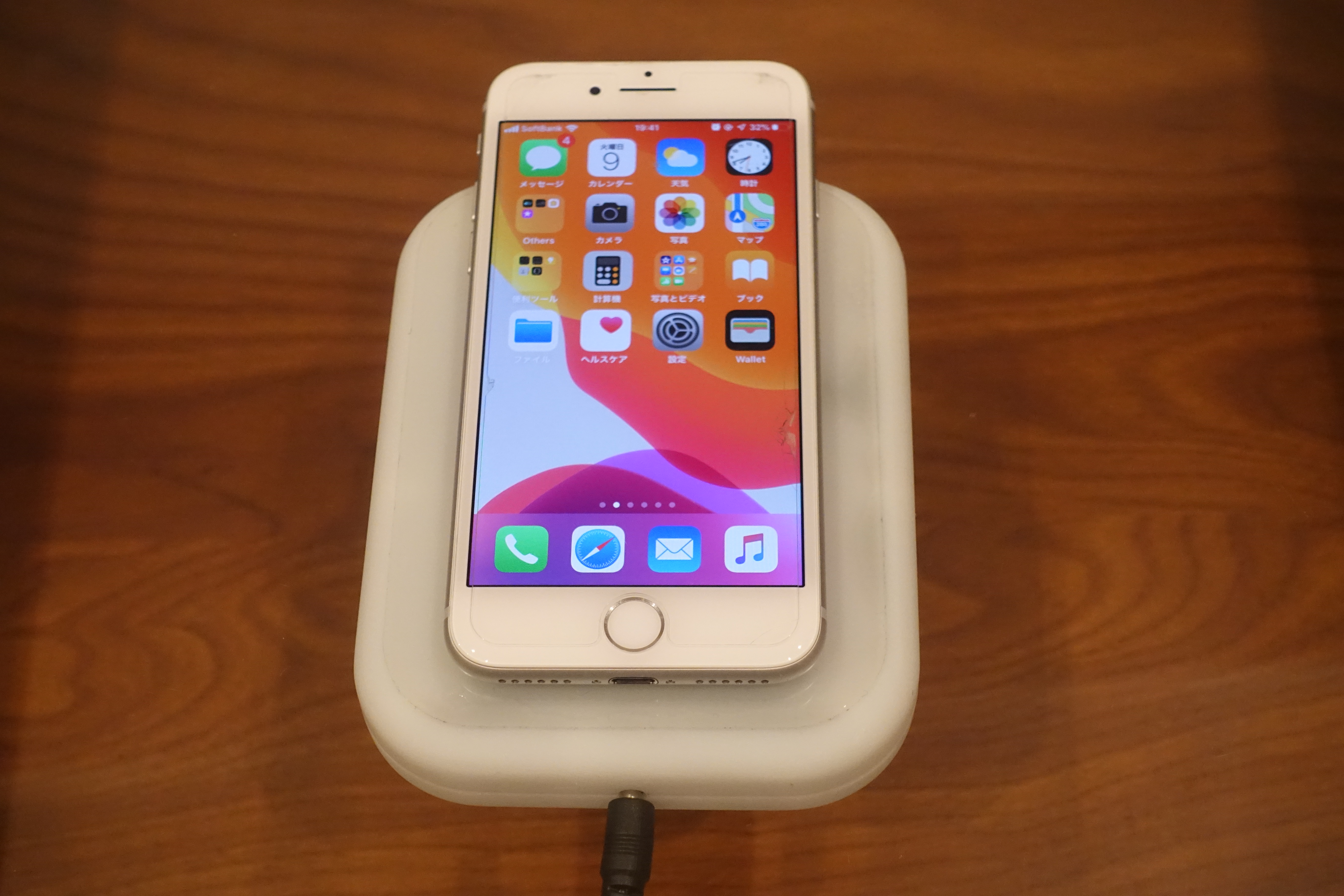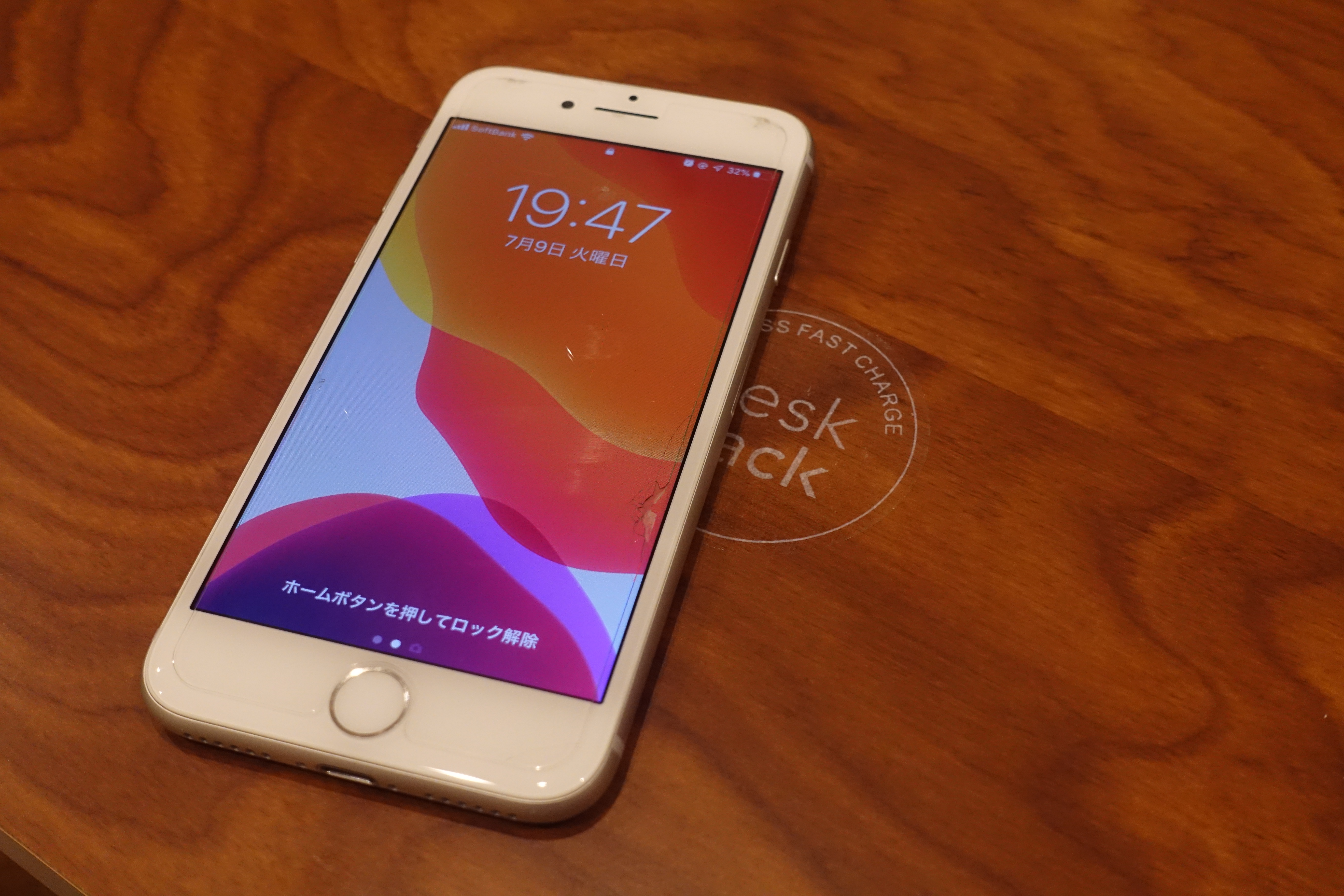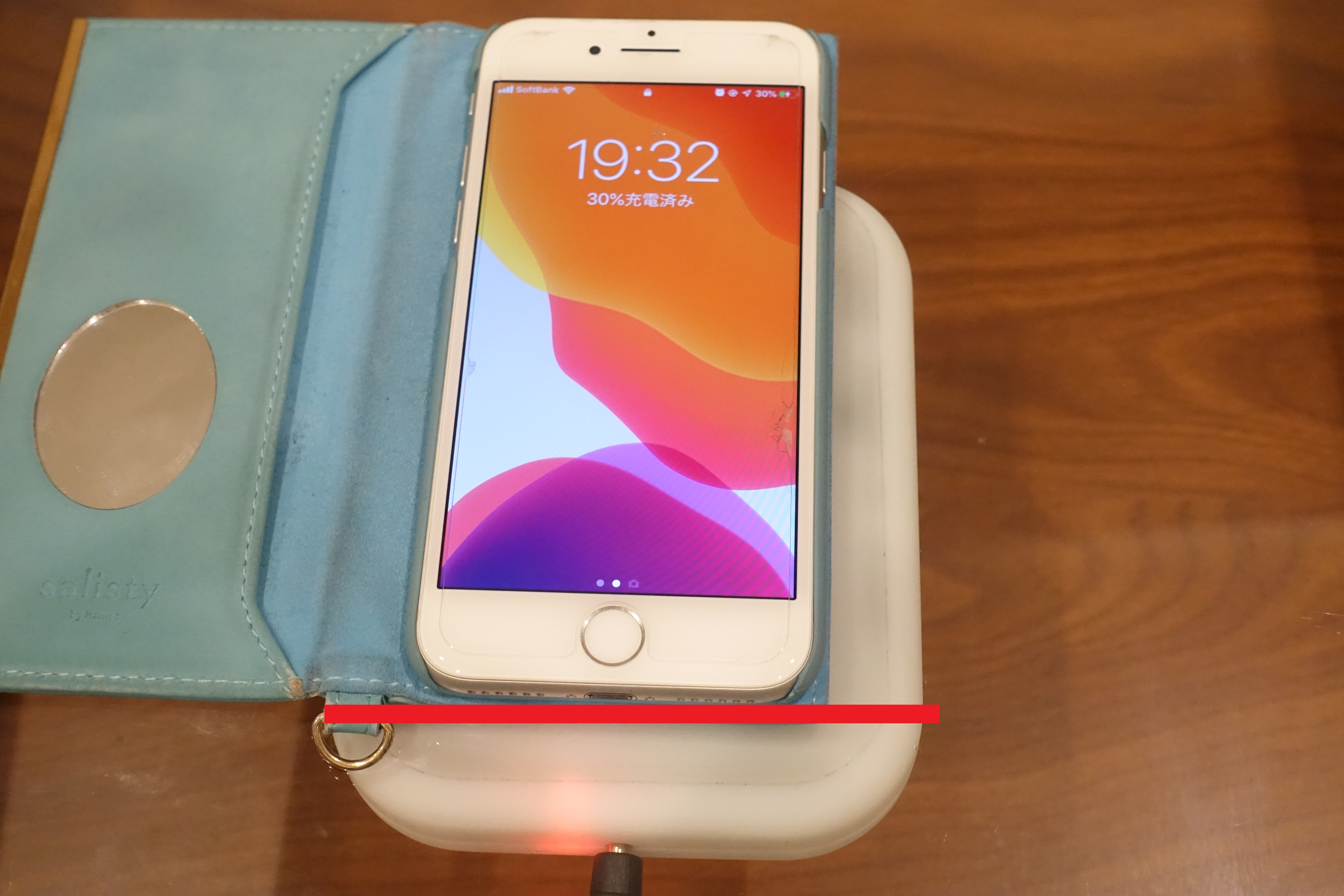 このウッドテーブルの厚みは約12mm。デスクハックの対応充電距離は12mm~32mmなので、このまま置けば充電されるはず。さっそくiPhoneを置いてみると…