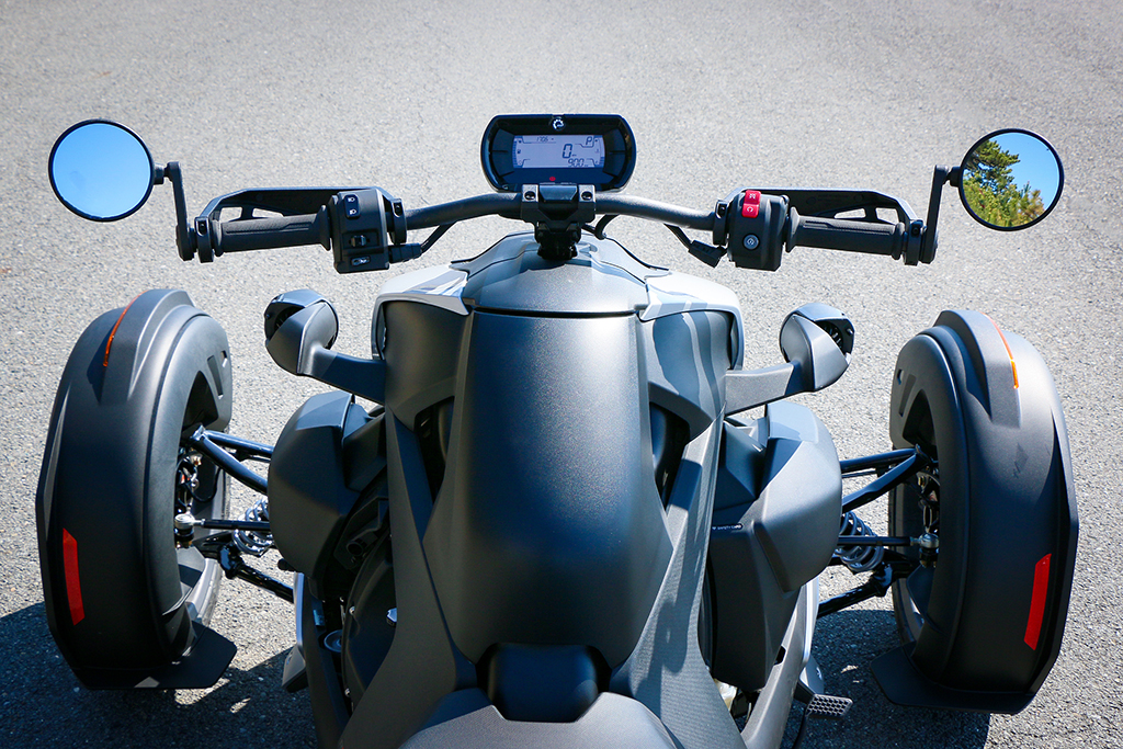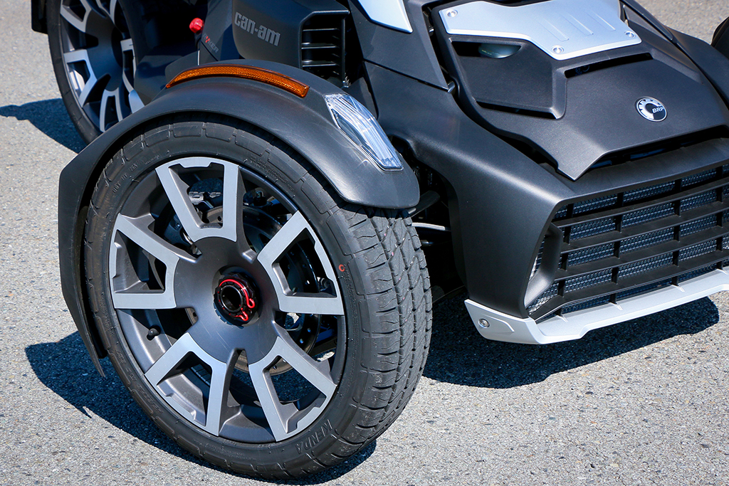 バイクのように車体を傾けることがないので、Can-amはクルマ用のタイヤを装着。ふたつの前輪を支えるサスペンションも、クルマによく使われるダブルウイッシュボーンタイプとなります。