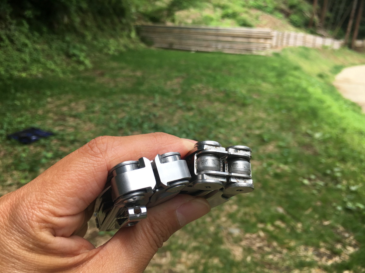 動きは反対ですが、ライターをイメージして親指の腹で押すと軽い力で飛び出しました。ツールはいずれも背側なので、指に当たっても痛くありません。どれかひとつの機能を狙うと難しいので、大らかな気持ちで押し込みます。2つのツールが出てもよし。使いたい機能のほうを取り出せばいいんです。