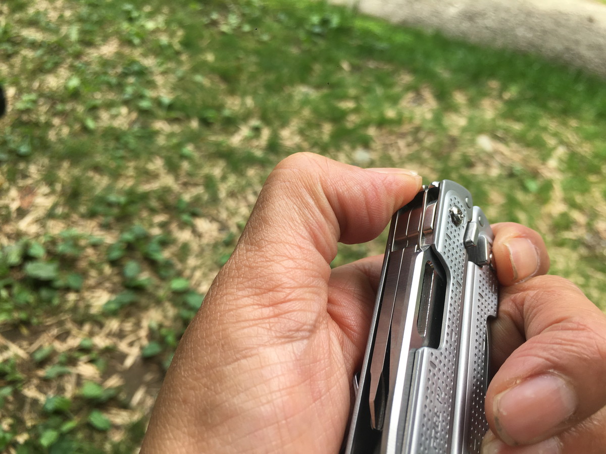 一方、ロック解除ボタンはハンドルの中心側に配置されているので、どの機能も安全にボタンを押せます。レザーマンの一部のモデルはナイフの刃が指をかすめそうになるので、これはうれしい配慮です。