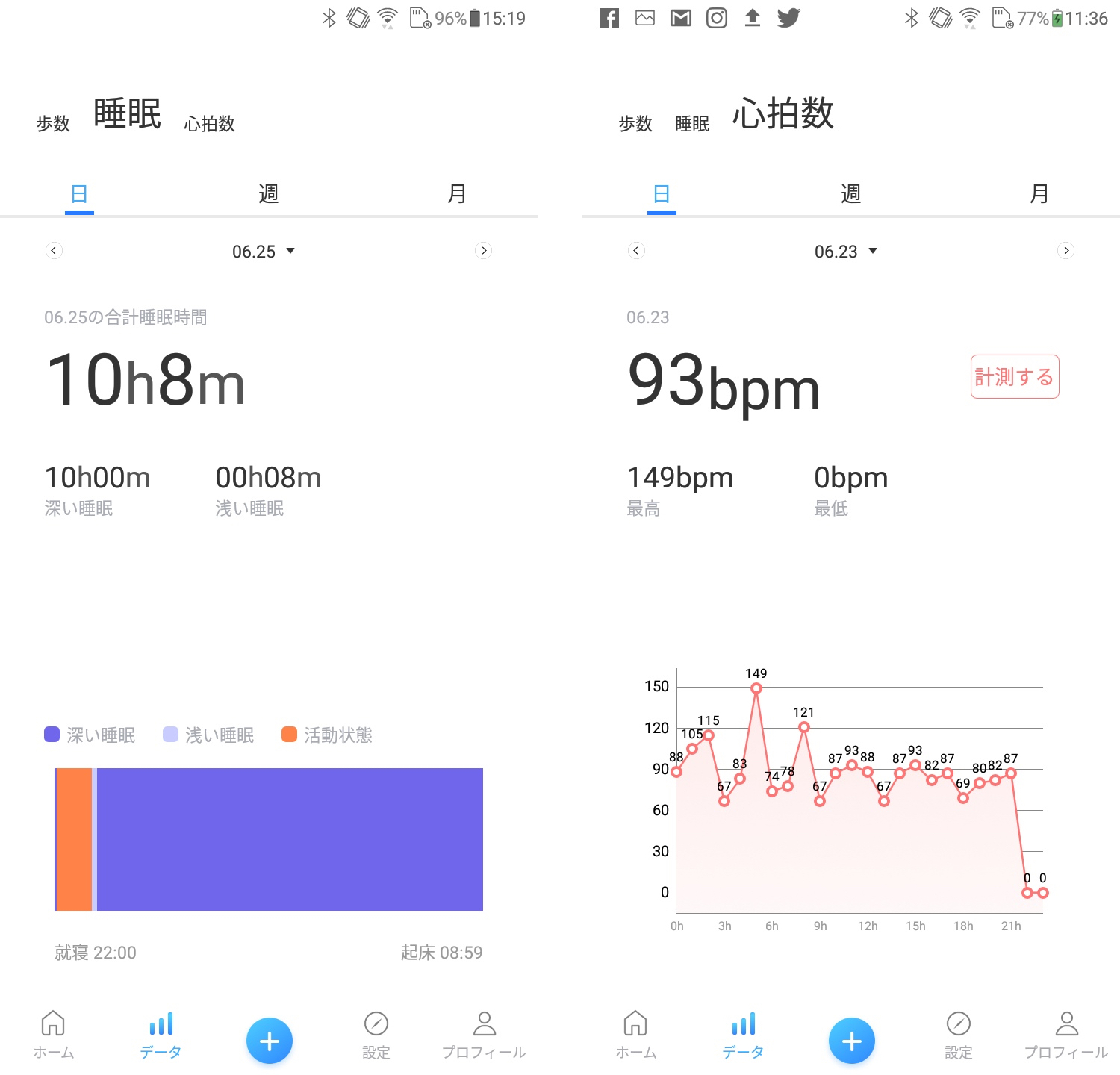 ▲睡眠の状況や心拍数もアプリで詳細が分かる