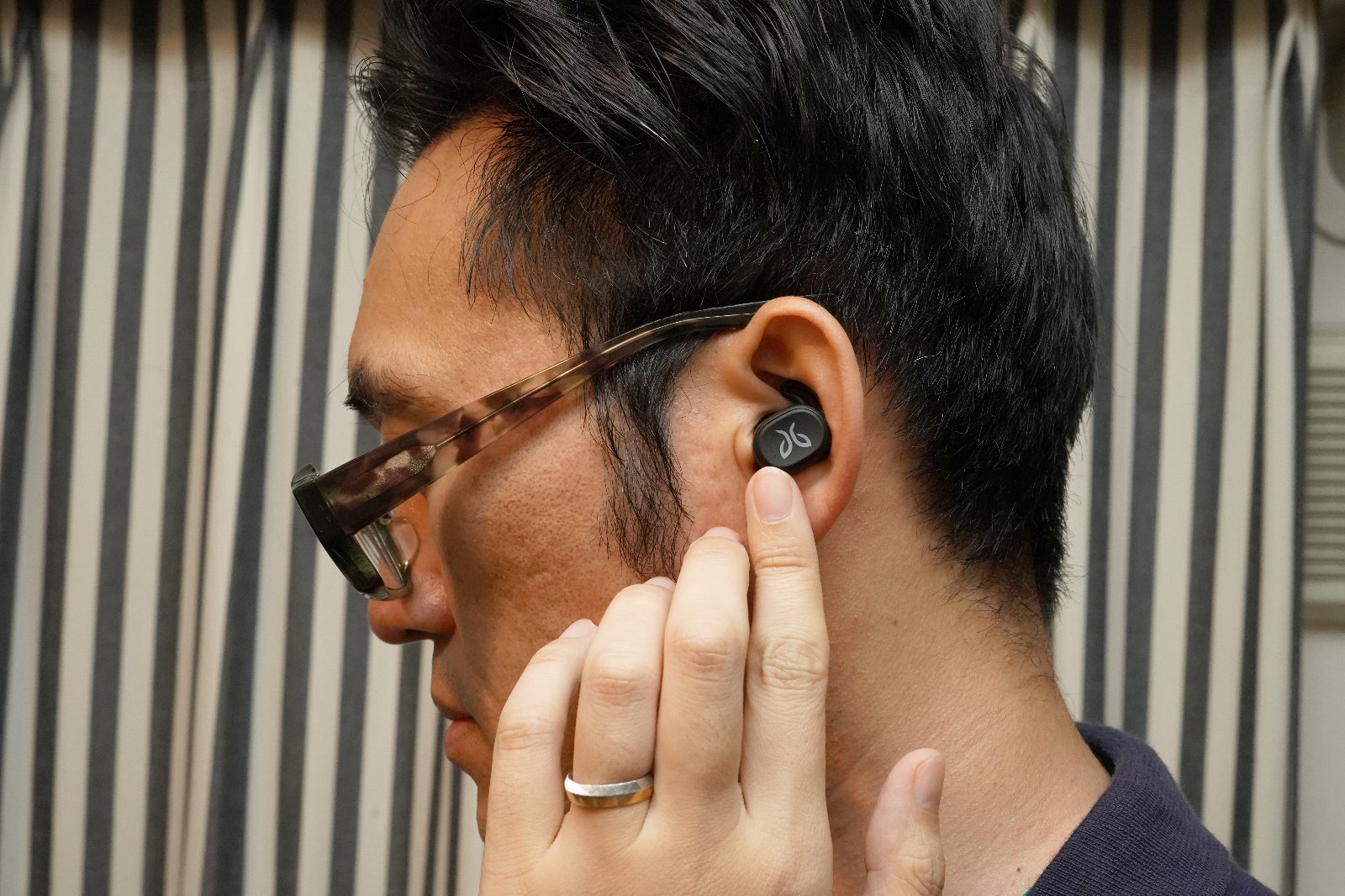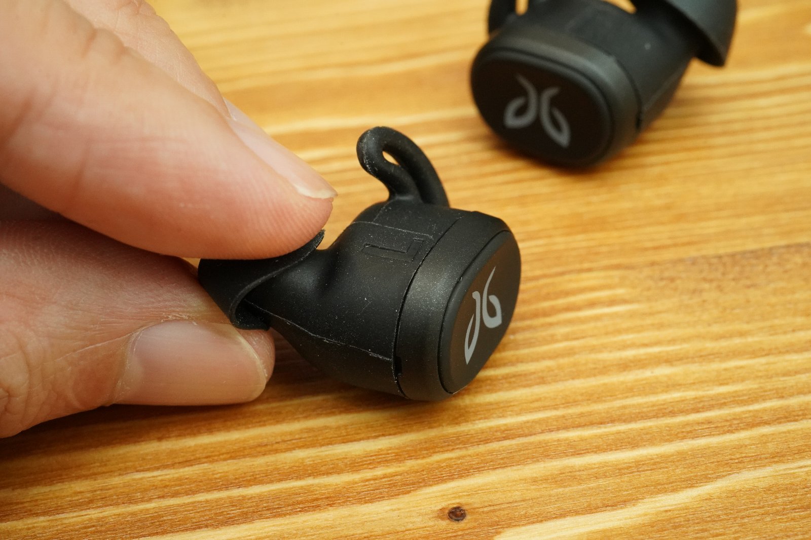イヤホンは片側6gと小型・軽量。イヤーフィンとイヤーチップは一体構造で、耳に接触する箇所を柔らかな素材にしています。完全ワイヤレスイヤホンはイヤホンの角にあたる点で固定する機種が多いなか、Jaybird「VISTA」は密着する面で密閉するイメージになります。